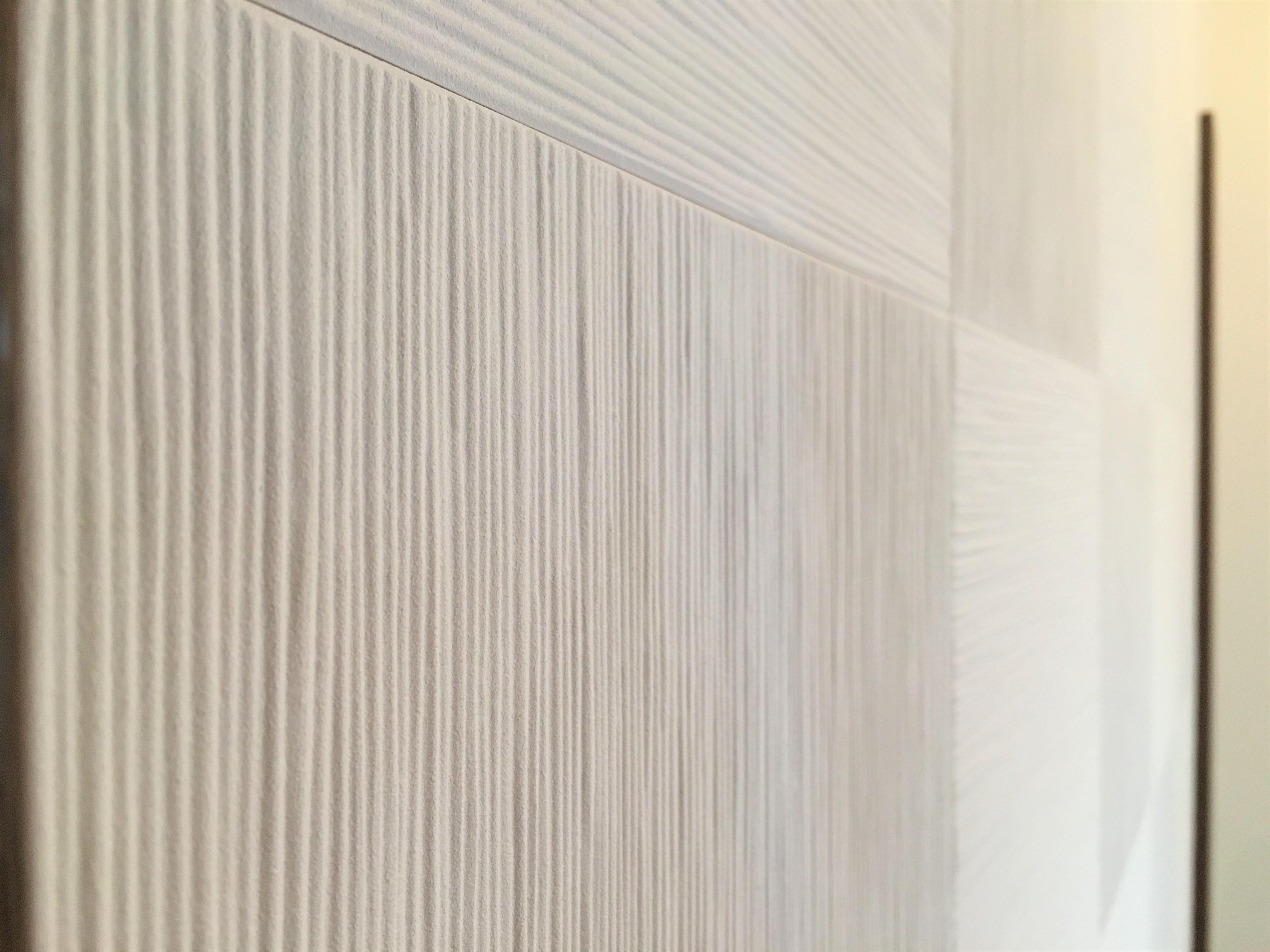 洗面脱衣室は湿気がこもりやすく、カビが生えやすく、床もべたつきを感じるとのことで、壁の一面にLIXILのエコカラット(たけひご)を貼りました。エコカラットは優れた調湿性能で快適な湿度を保つ『調湿建材』として登録を取得した『多孔質セラミックタイル』です。調湿・消臭・有害物質を低減でき、かつデザイン性も抜群です。ただ着替えて洗面を済ませていた場所が、爽やかな風が流れ、椅子に掛けてゆっくりしたくなるような空間に生まれ変わりました。