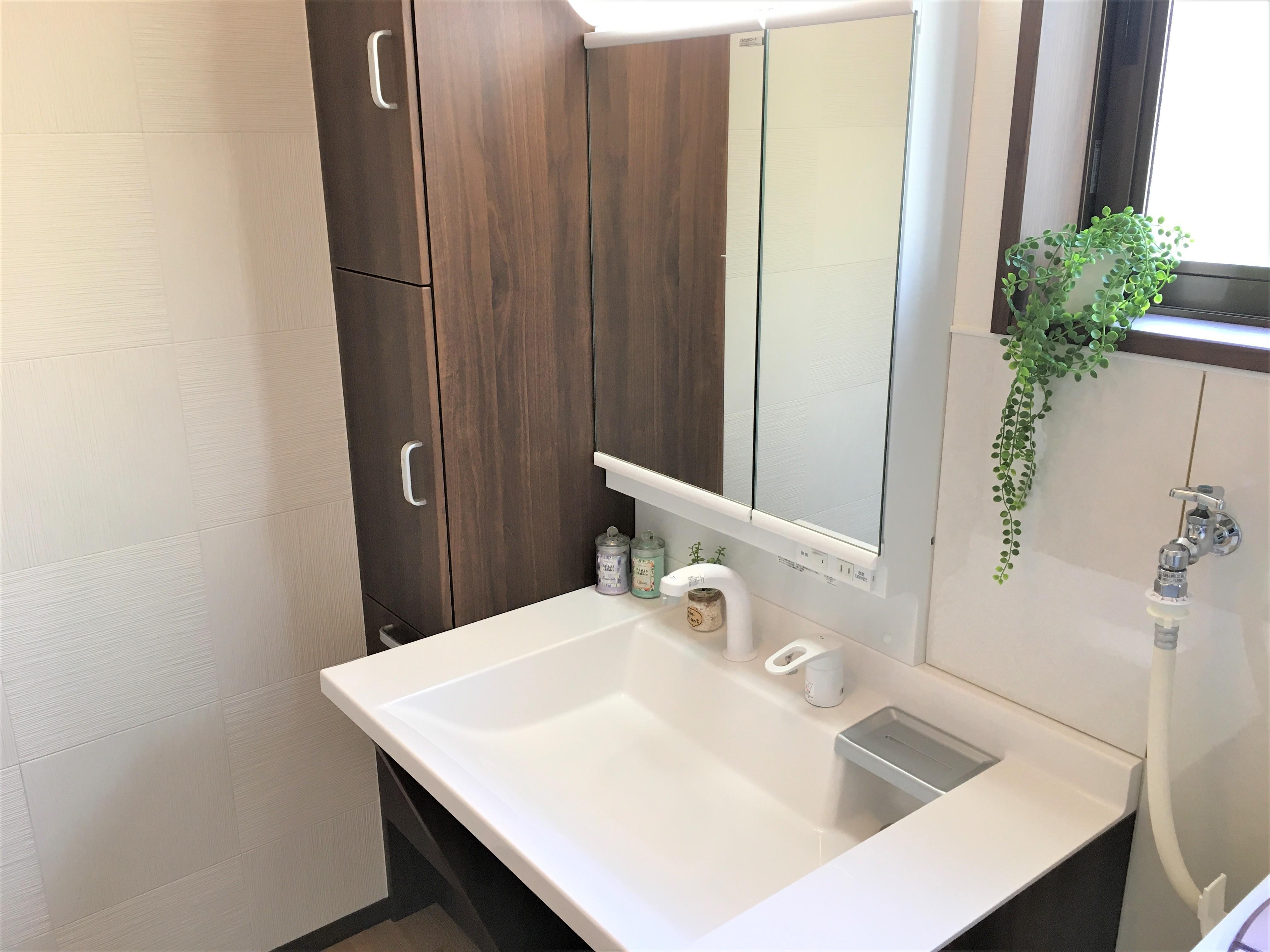 将来のためにと車いすでも使用がラクなLIXILのドゥケア・カウンターにしました。ドゥケア・カウンターは車いすでも使用しやすい洗面化粧台です。給排水管が奥にあるので、車いすでも膝や足先が当たらずラクに使用できます。また肘からの水垂れをガードする幅の広い洗面器(奥行き605㎜)で、ゆったりと使用できます。また、洗濯機廻りをスッキリするためにトールキャビネット(幅300㎜、高さ1,850㎜)を設けました。これで多くの洗剤やシャンプーなどの補充分もスッキリ片付きます。ミラーは既存の窓と干渉してしまうため、幅の狭いミラーキャビネットを取り入れました。