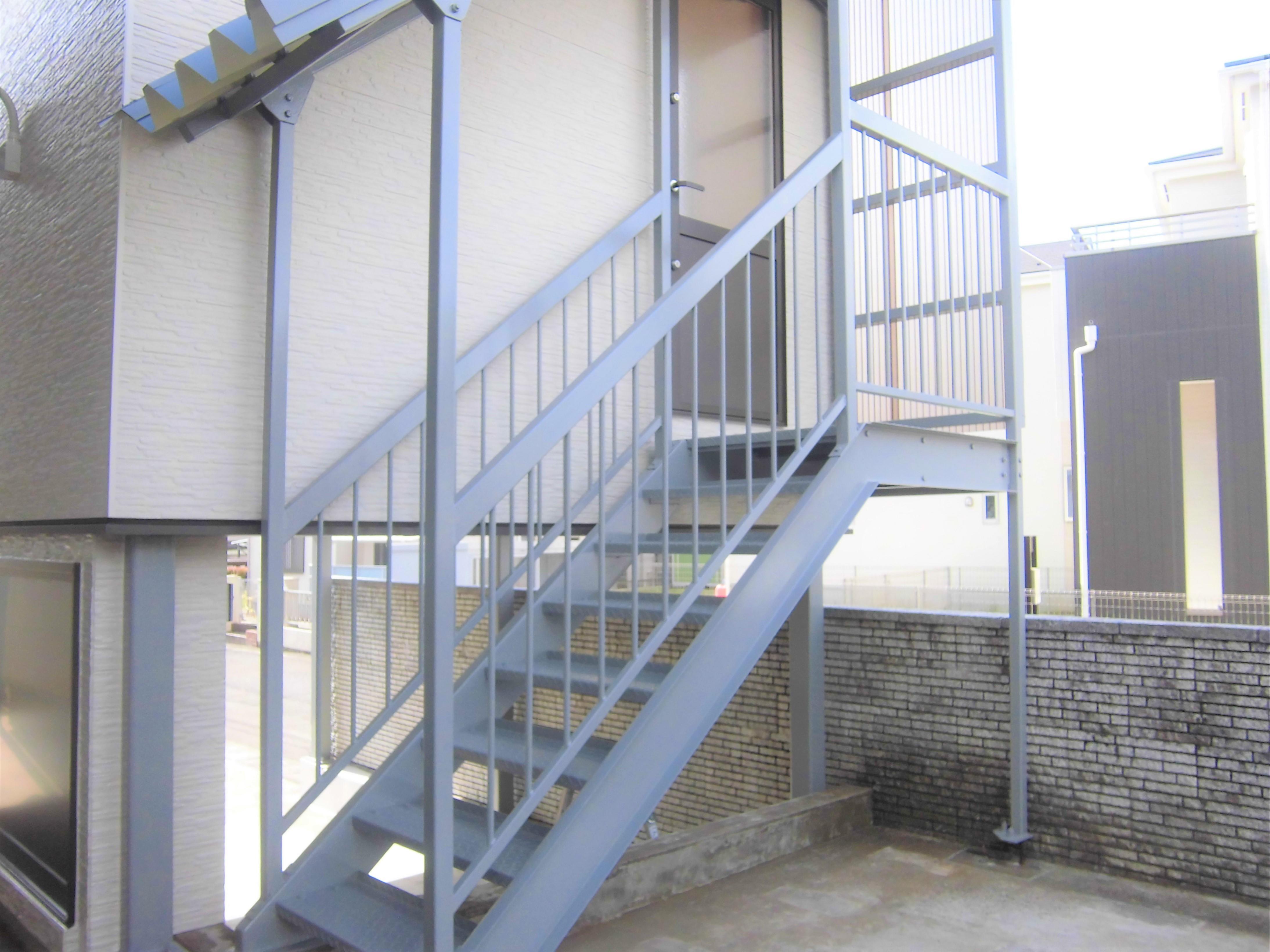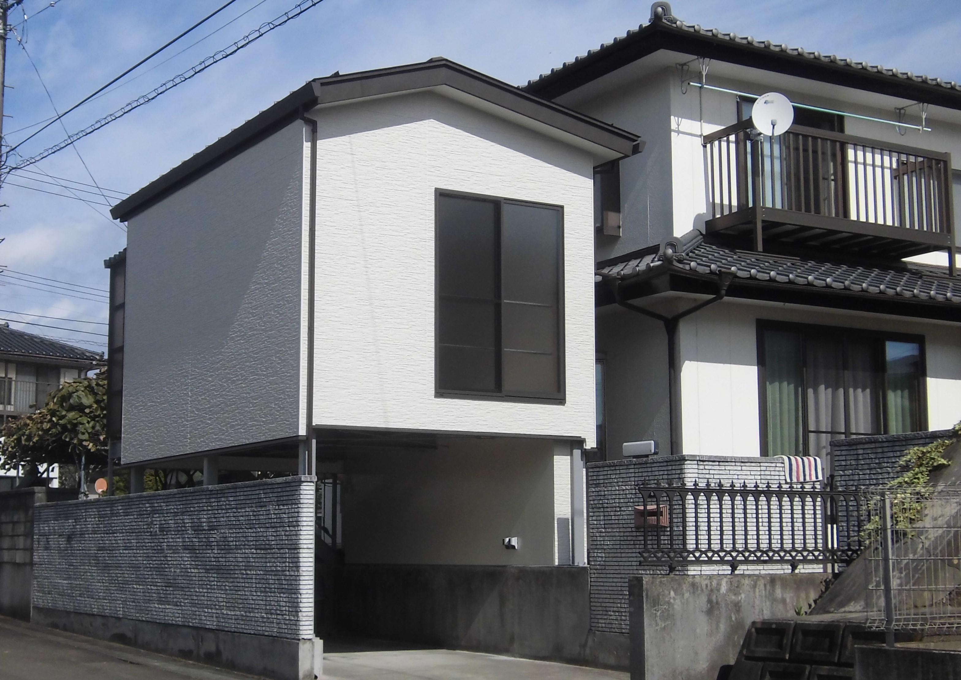 ガレージの屋根を外し、2階を設けました。 鉄骨階段を上がっていくと2階は物置部屋になっています。 掃き出しのサッシを設け大きな家具の搬入をしやすくしました。 家具搬入後は、脱着可能な手摺があるので安心です。 部屋の中には大きな棚を設け、たくさんの収納ができます。 床・壁・天井の全面に断熱材もしっかり入っているので、書斎などとしても使えますね。