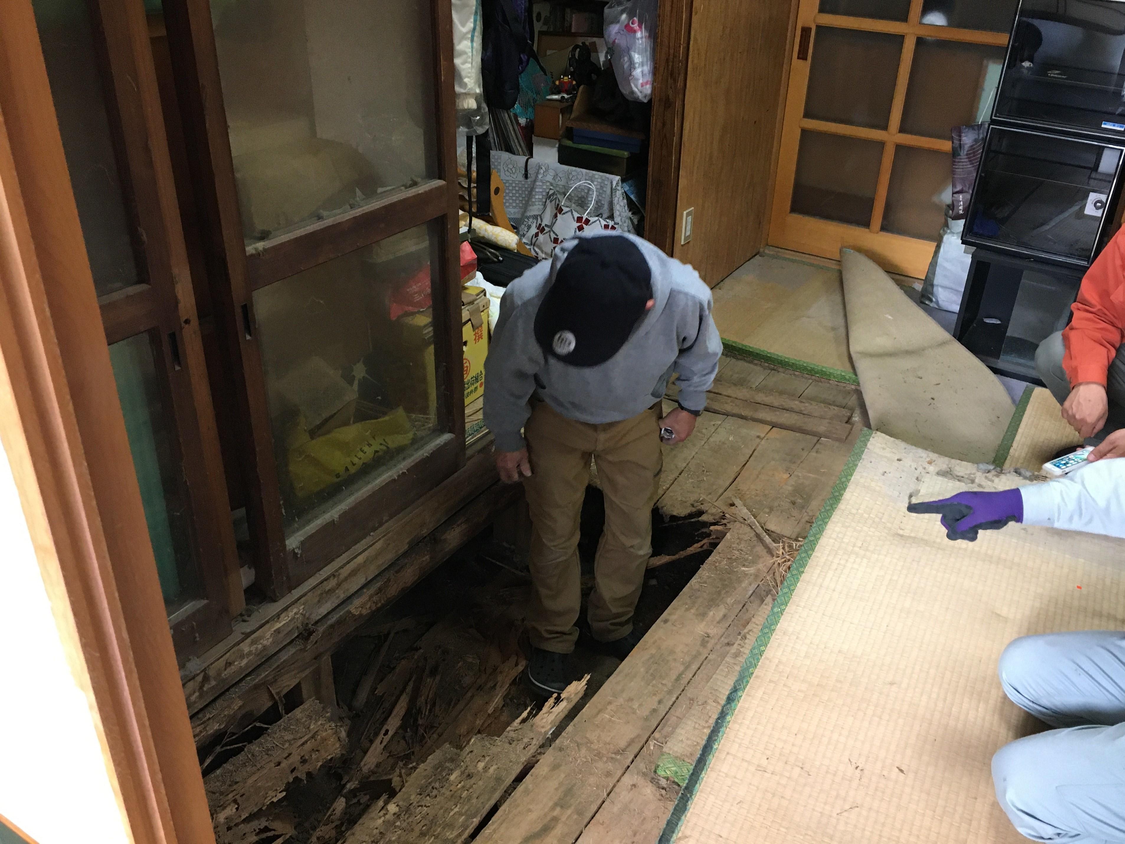 築40年のお宅で、白蟻被害や腐食・経年劣化により和室の床が抜け落ちてしまっていました。 腐食した床板や土台・基礎まで全て解体しました。基礎・土台・フローリングを新設し、見違えるほどきれいになりました。防蟻処理も施したのでしばらくは安心ですね。書籍類が多くありましたが、頑丈な床が出来上がりましたので、安心して本棚が置けますね。