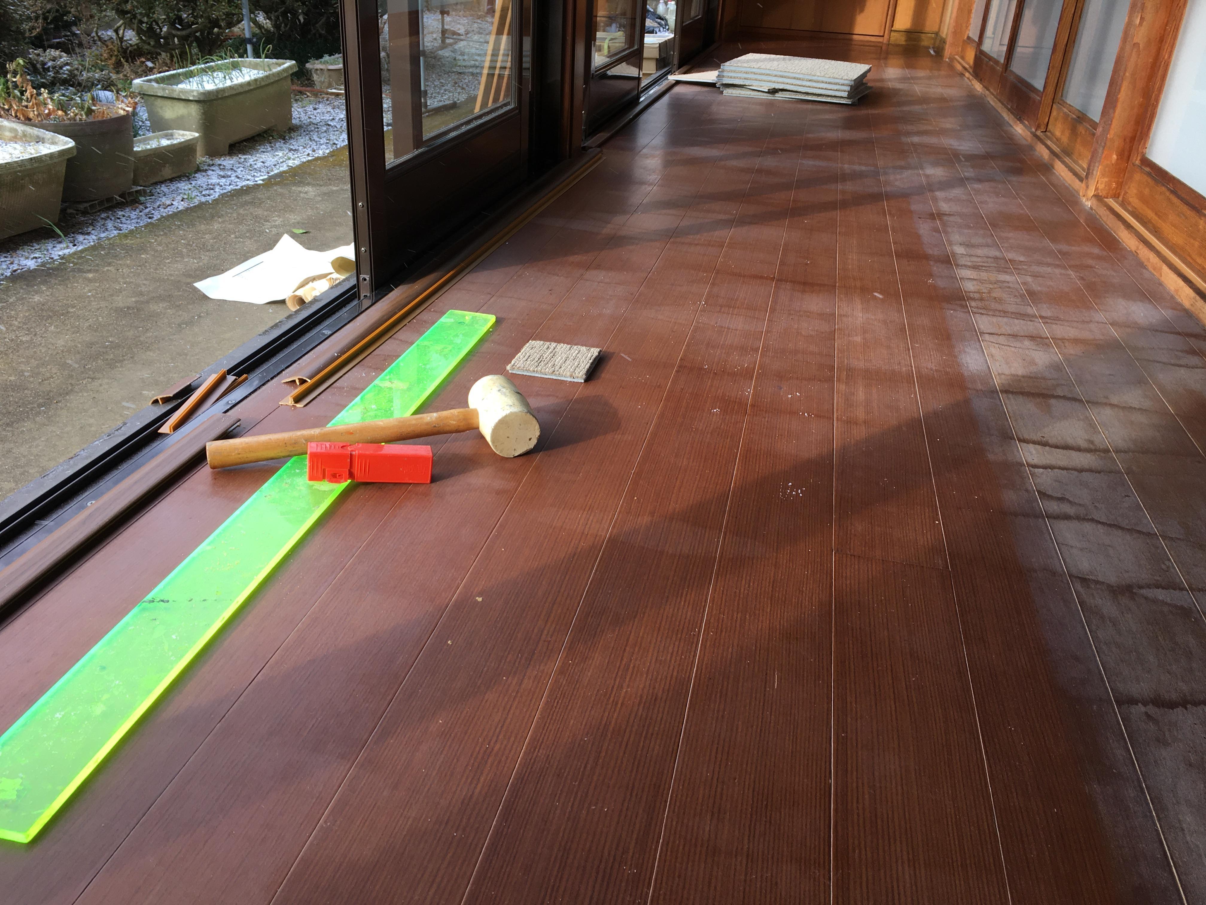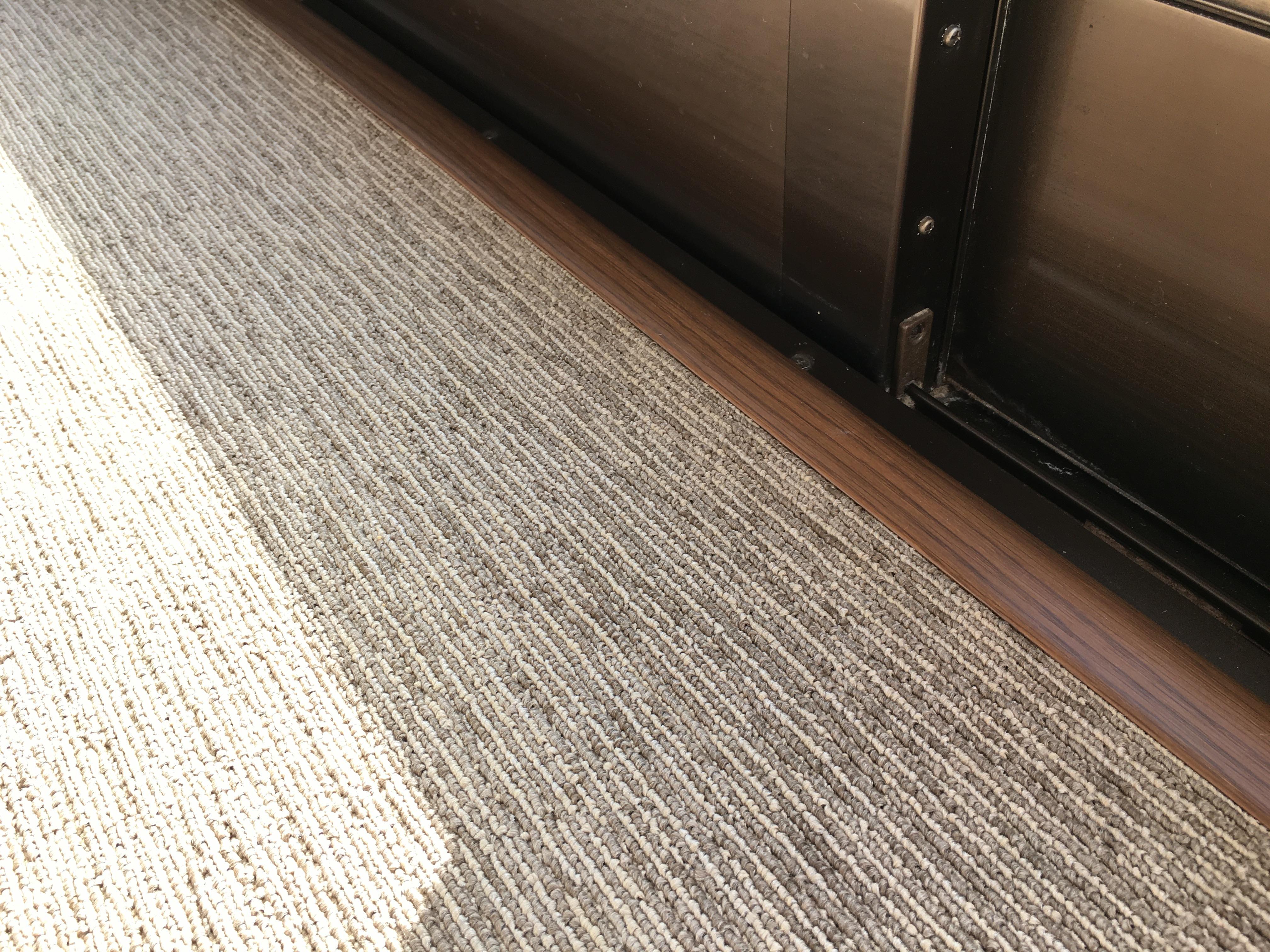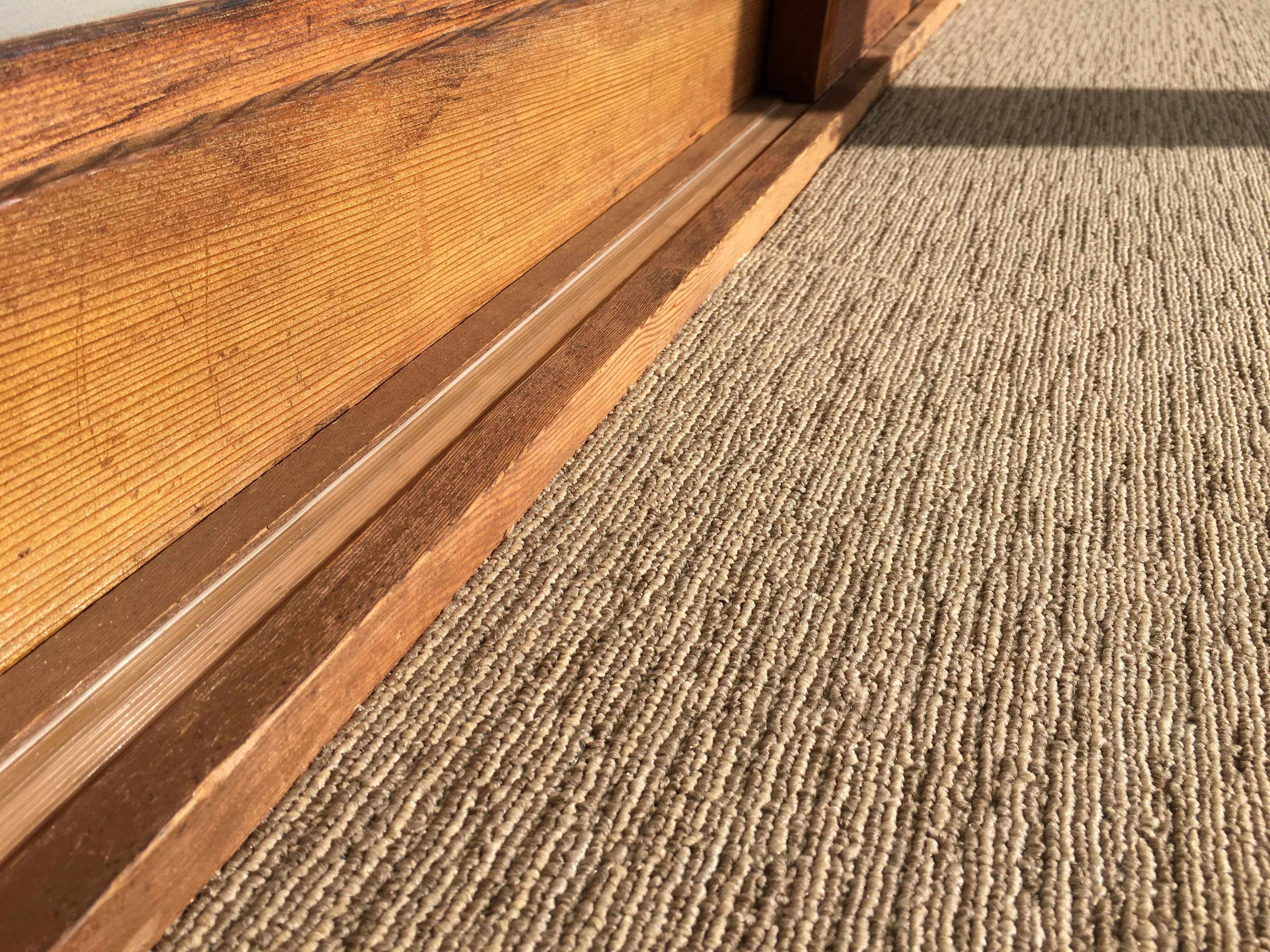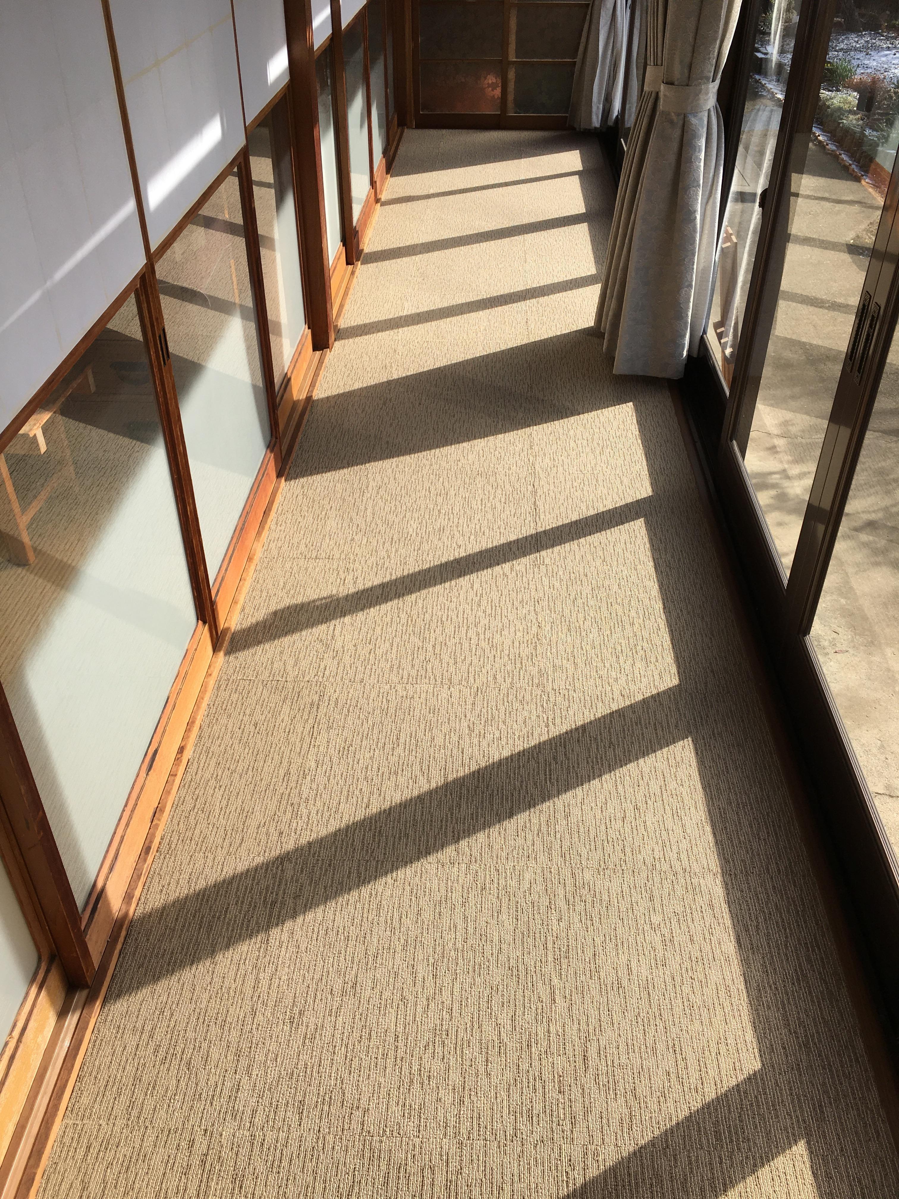 フローリングは窓に近い場所ほど日焼けして白くなったり、乾燥によって毛羽立ったり表面が剥がれてきたりします。自然劣化もしますが、家具やカーペットを敷いていたりすると部分的な色むらも出てきます。特に広縁や南に面した日当たりの良い部屋のフローリングは症状が出やすいです。 遮光カーテンをしたり、カーペットを敷いたり、ワックスをこまめに塗ったりなど、日々のケアが大切ですが、なかなか難しいですね。症状が出てしまったら、カーペットを敷いて隠すのも良いのですが、今回の事例のようにタイルカーペットを敷くのもお勧めです。厚さが11㎜もあるのでふかふかして柔らかく、足裏がとても心地よいです。このままここでゴロンと横になりたくなります。リビングやお部屋の一部分だけの施工もできます。低コスト&短時間で施工できますので、とてもおススメです。