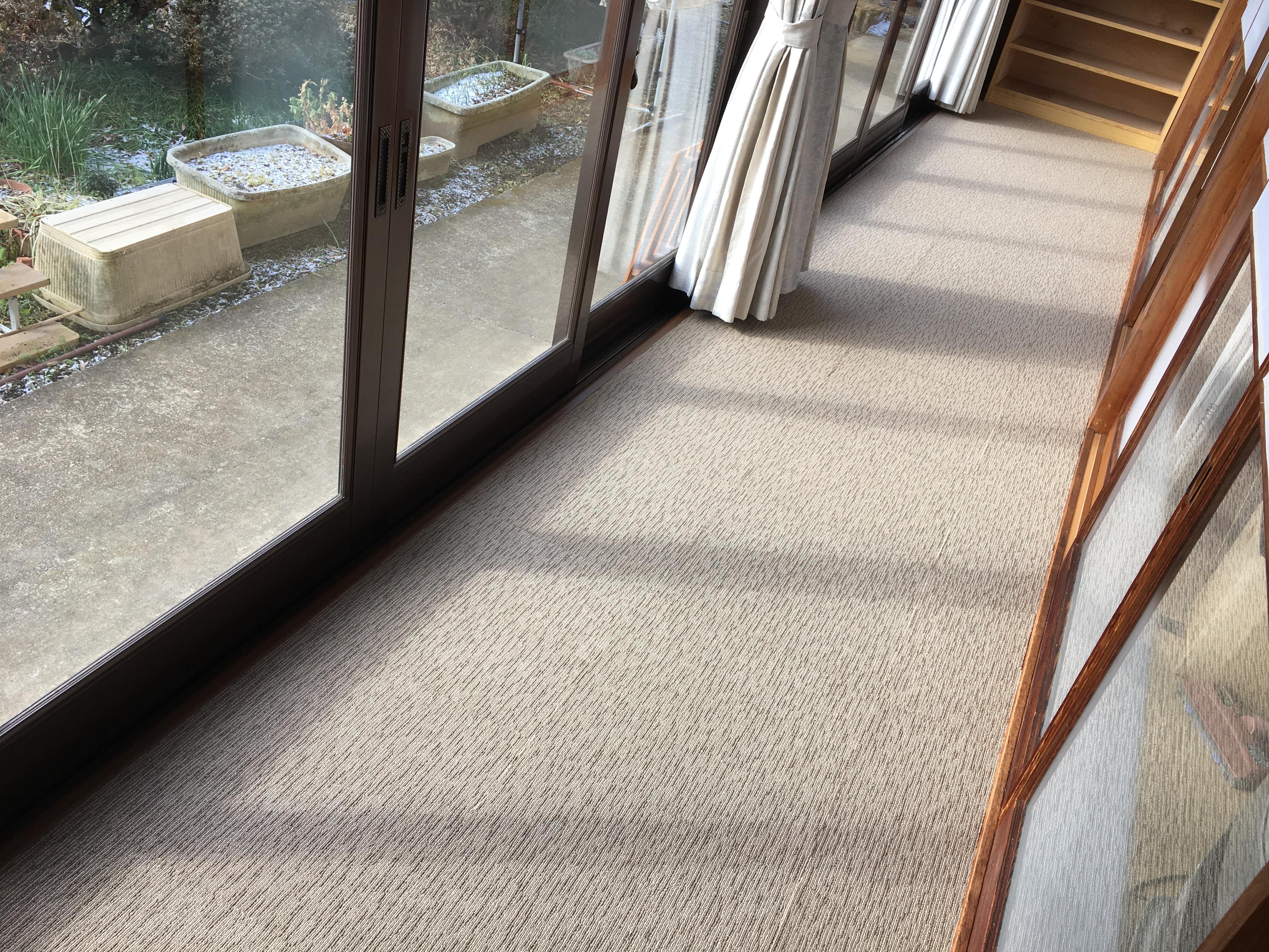 広縁のフローリングが日焼けなどで色あせてしまい、既存フローリングの上にタイルカーペットを重ね張りしました。施工はとても簡単で2時間半で終了しました。肌触りが良く、厚みが11㎜もあり足裏がとても心地よく、ゴロンと横になれるほどの安心感もあります。市販のカーペットではきっちり敷き詰めるのは困難ですが、タイルカーペットは細部まできっちり敷き詰めますし、滑り止め付きなのでズレたりよったりする心配もありません。また、既存のフローリングの劣化の進行予防にも効果的です。O様にもとてもご満足いただきました。