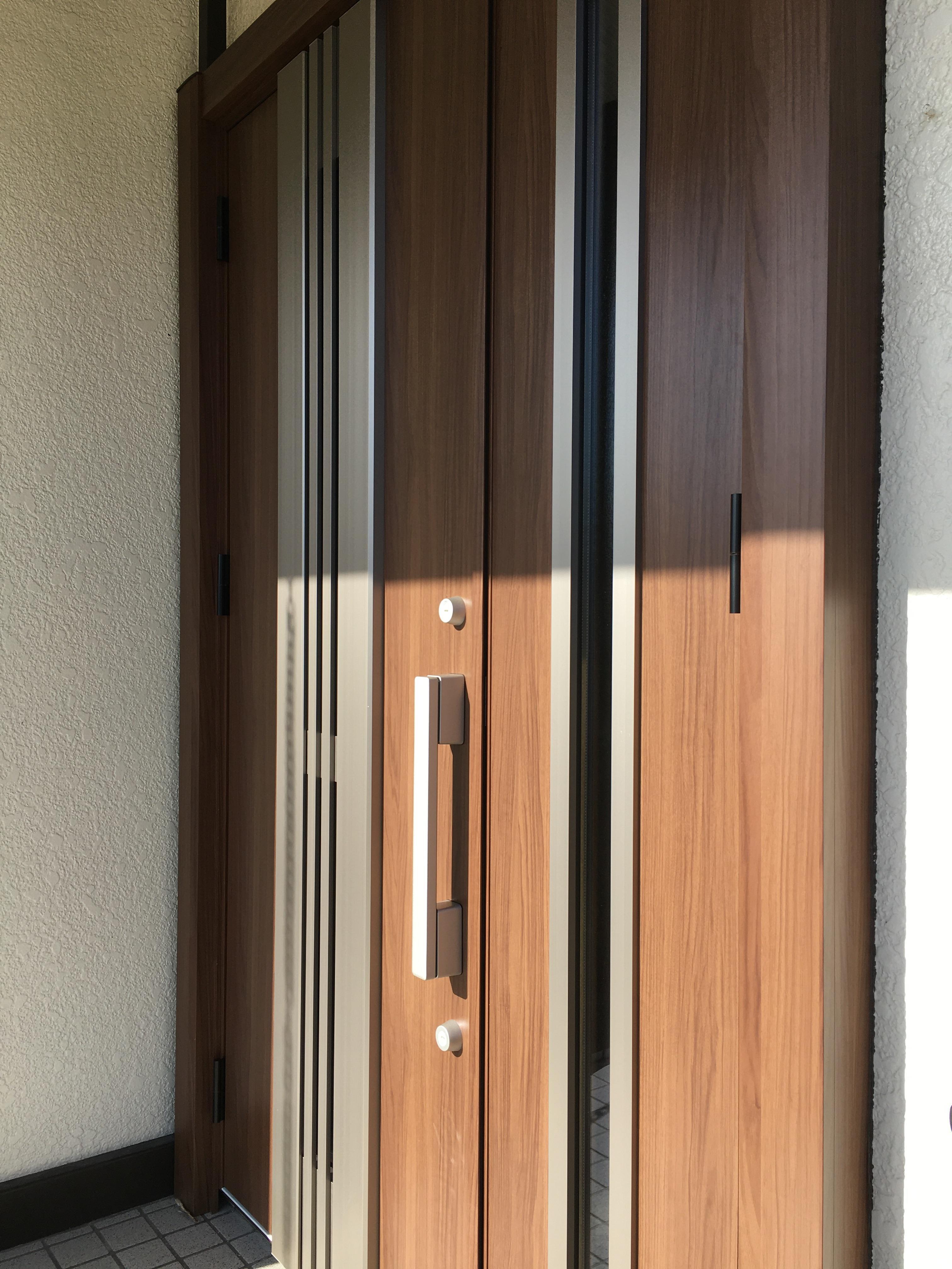 玄関ドアを1日でリフォームしました。築32年の玄関ドアの鍵が故障し、外観も経年劣化していたので、交換工事をご希望されました。元のドアと同じような色味のクリエモカとし、採風機能の付いた『リシェント玄関ドアM84型』を採用しました。採風タイプは、網戸の付いた縦すべり窓を開けると、玄関にこもった湿気やにおいの換気に効果的で、風通しを良くすることで夏でも涼しく快適に過ごせます。またリシェント玄関ドアは、ピッキングに負けない「2ロック仕様」、かみ合わせががっちりな「3つの鍵付きデッドボルト」、複製が困難な「ディンプルキー」、破壊されにくい「防犯合わせガラス」、ガラス破り対策に効果的な「セキュリティサムターン」など防犯性がとても高く安心です。既存のドアや壁を壊さず、カバー工法で1日でリフォームできる『リシェント玄関ドア』、おススメです。引戸もあります。