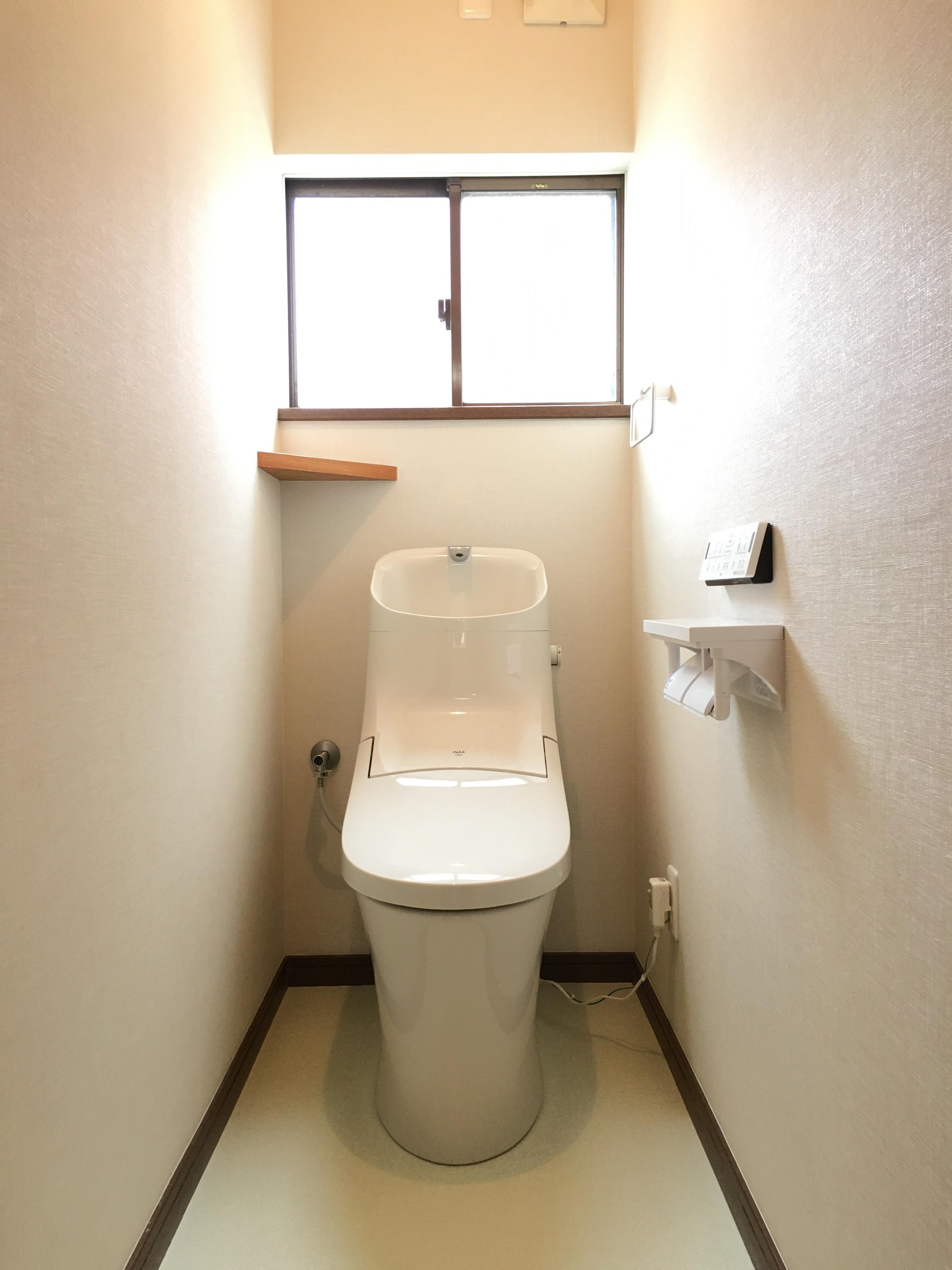 1階と2階のトイレは、どちらも壁紙と床クッションフロアを張り替え、トイレ・紙巻器・タオル掛けをフルで一新しました。スッキリ爽やかなトイレになり、いつもよりチョットゆっくりしたくなっちゃいますね。LIXILのトイレ『アメージュZA』は、手の洗いやすさを考えた広くて深い手洗い鉢が特徴で、シャワートイレ一体型のトイレです。便器のフチもなくしさっとひと拭き出来るシンプルでお掃除ラクラクなトイレです。