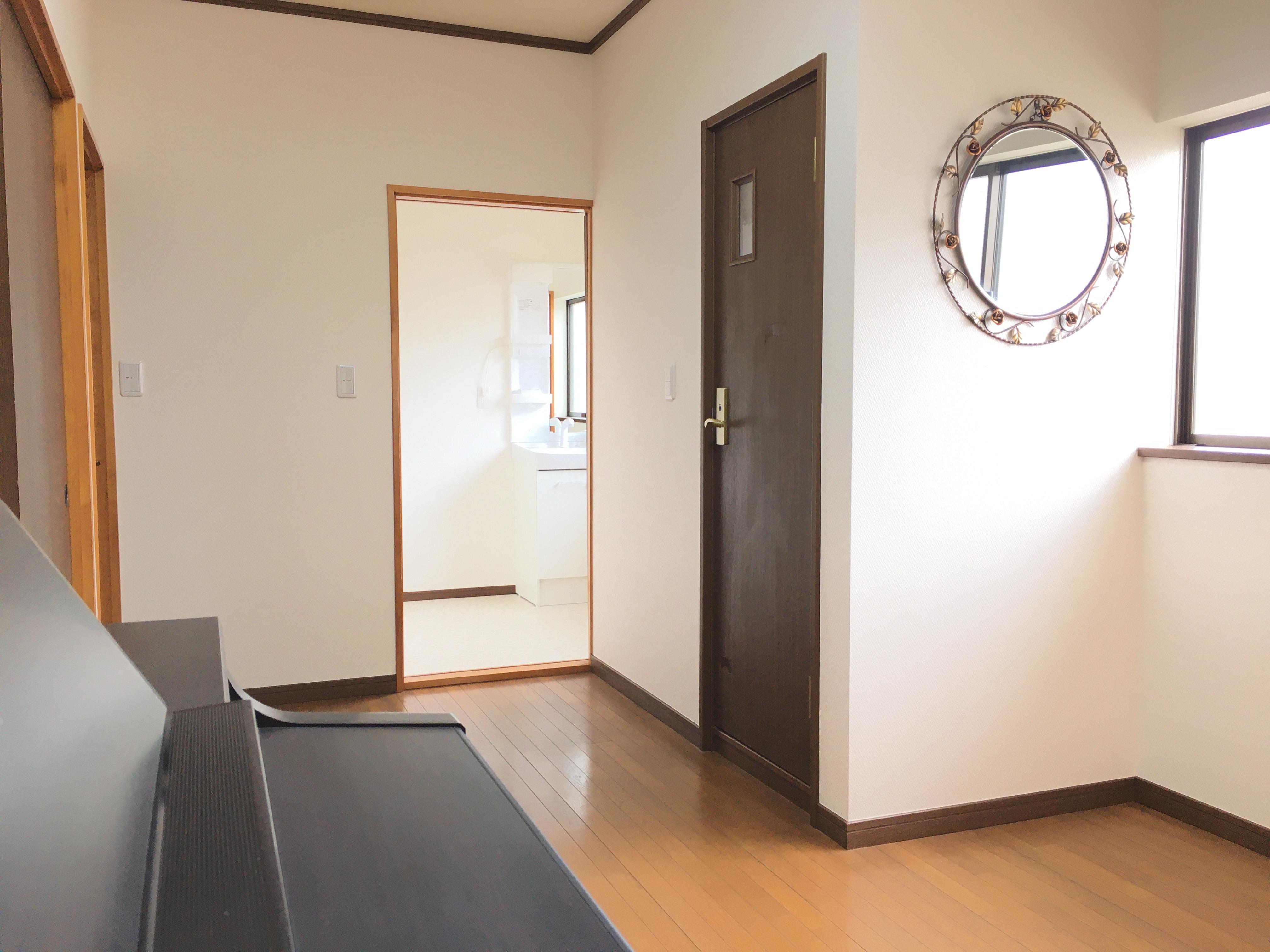 バラの花をモチーフにした鏡と電子ピアノのある2階のホール。壁紙を張り替え心地よい空間になりました。どんな曲が奏でられるのか楽しみですね。