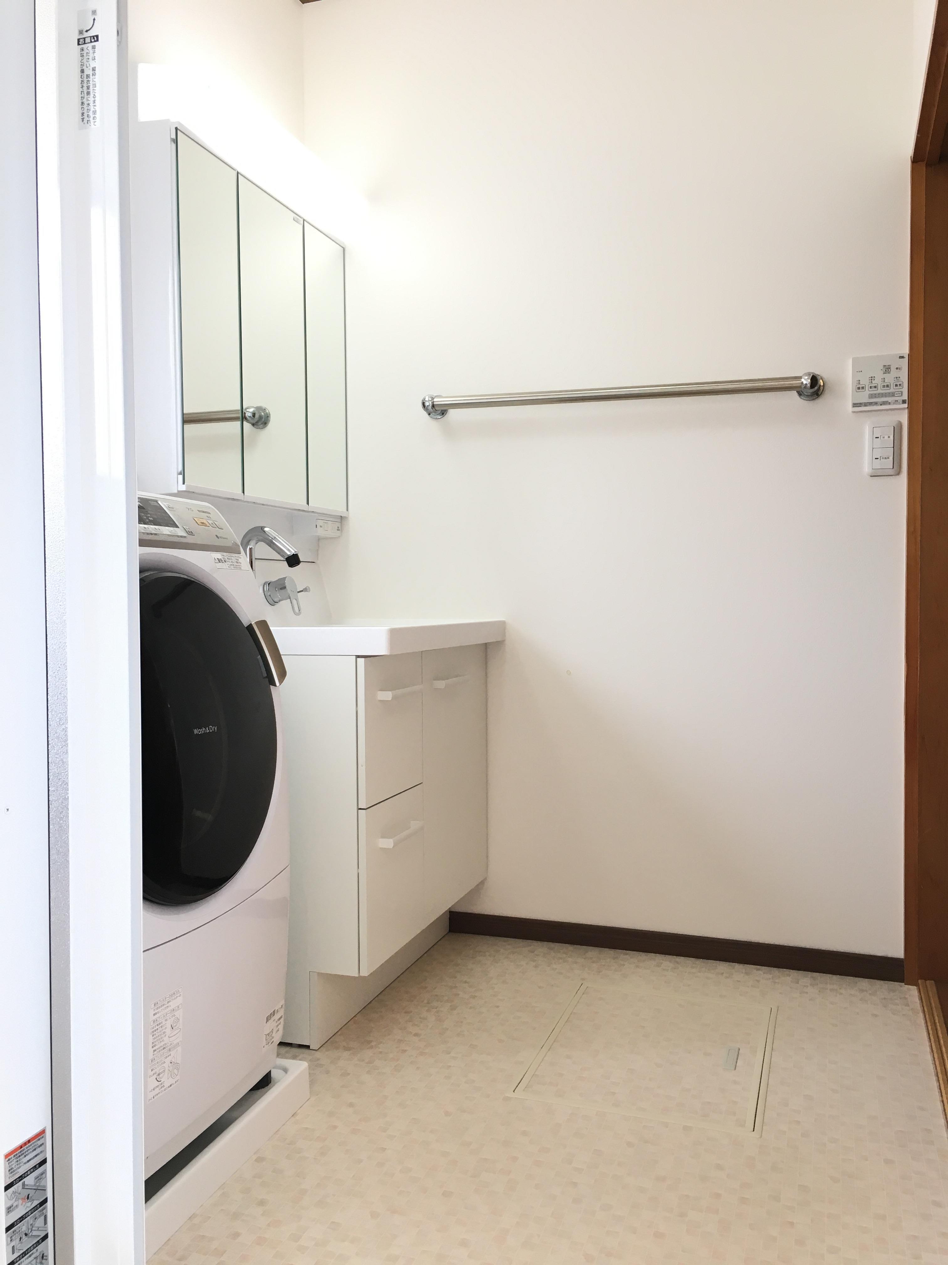 カビの多かった洗面室は床のクッションフロアと壁のクロスも張り替え、化粧台も交換しました。スッキリ爽やかになった洗面室でこれからは快適な身支度ができますね。洗面化粧台『ピアラ』(LIXIL)は、洗面ボウルが広々としているので2人並んでの身支度も可能です。またつなぎ目や凹凸のないデザインなので、さっとひと拭きできれいを保てます。大きな三面鏡の後ろは大容量の収納になっているので、洗面回りのゴチャ付く小物たちが、スッキリ収納できます。