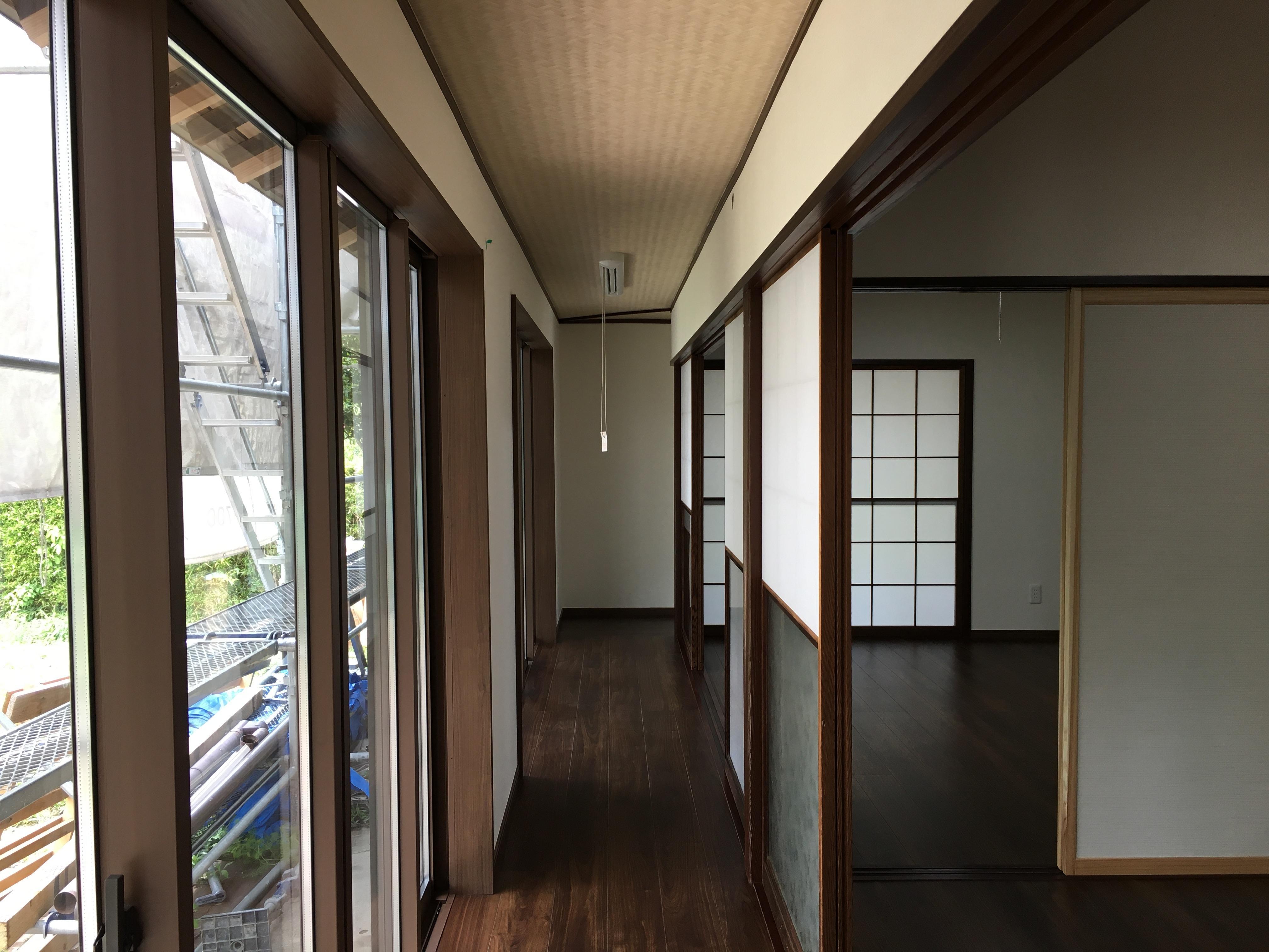 木製の雨戸を撤去し、ガタつき隙間風の入り込むサッシを全て替え、床も壁も天井も張り替えました。4.5間の長い広縁には、陽が燦燦と降り注ぎのんびりするのに格好の場所です。日当たりが良いので収納型可動物干し「ホシ姫サマ」も設けました。