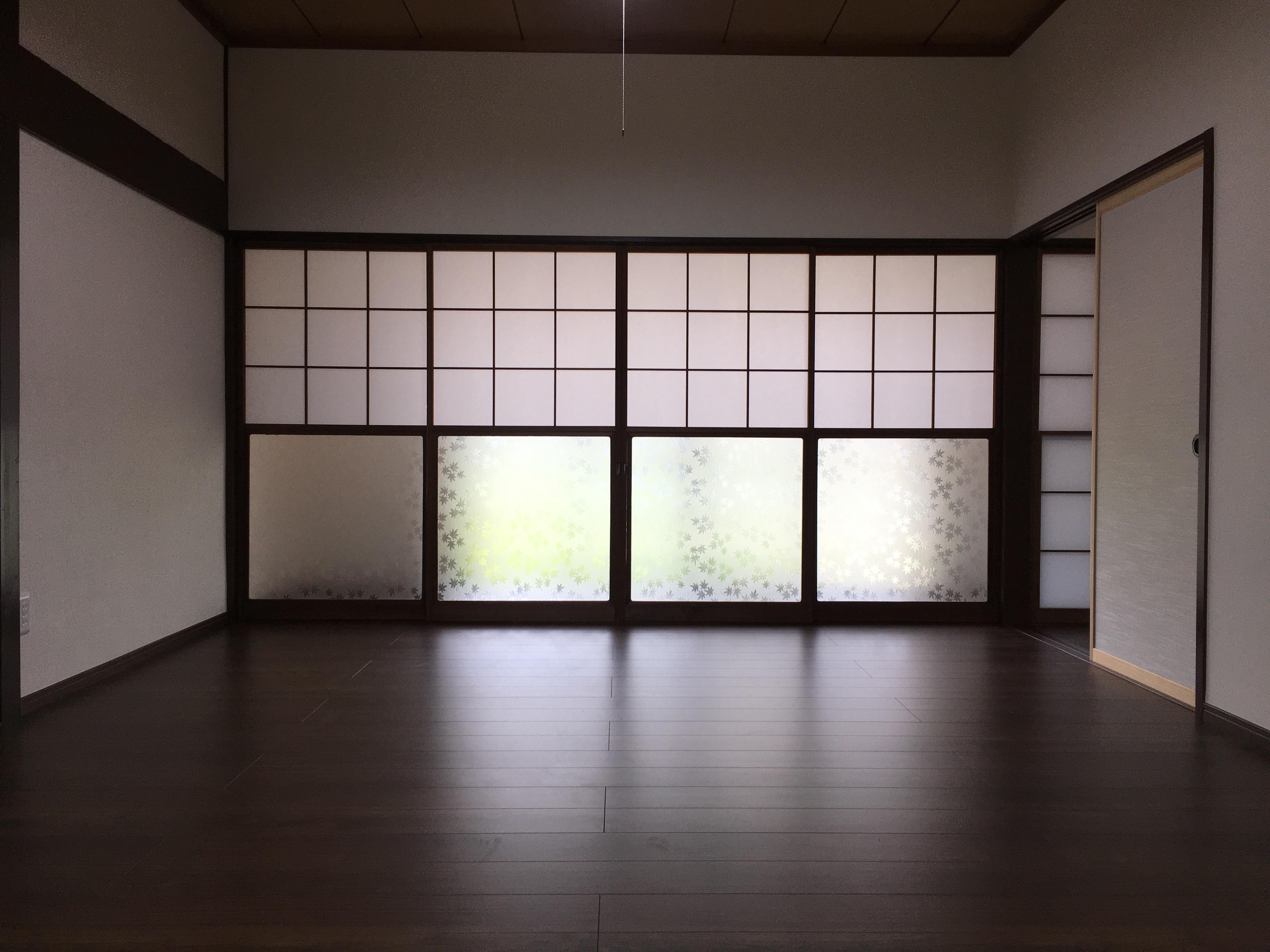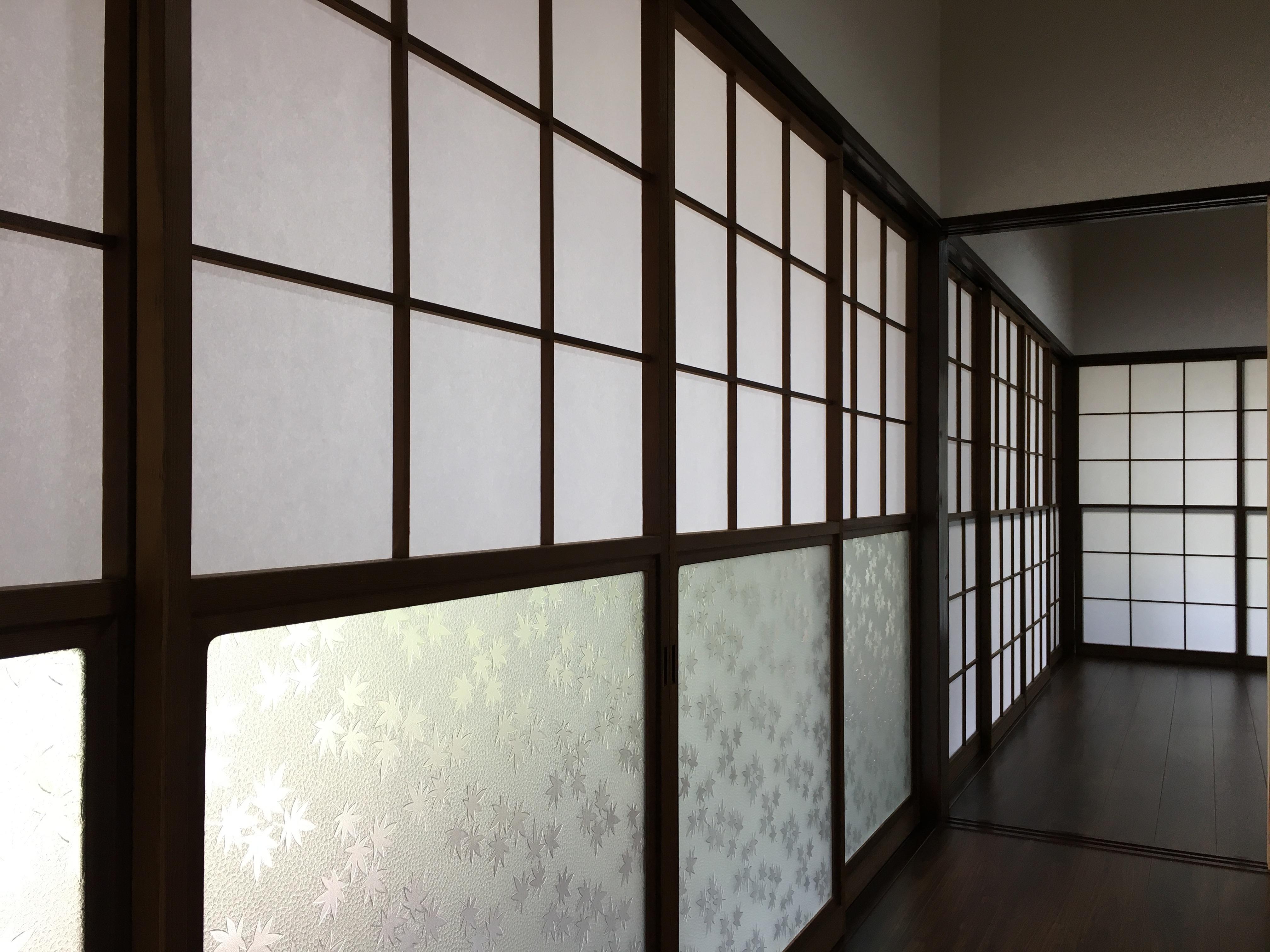 昭和レトロな障子の枠や桟・ガラスはそのまま残し、障子紙の張り替えと、建付け調整をしました。家や床が傾いていたので、障子は開かなくなっていたり閉まらなくなっていたりしていましたが、調整をしたことにより開閉もスムーズになりました。