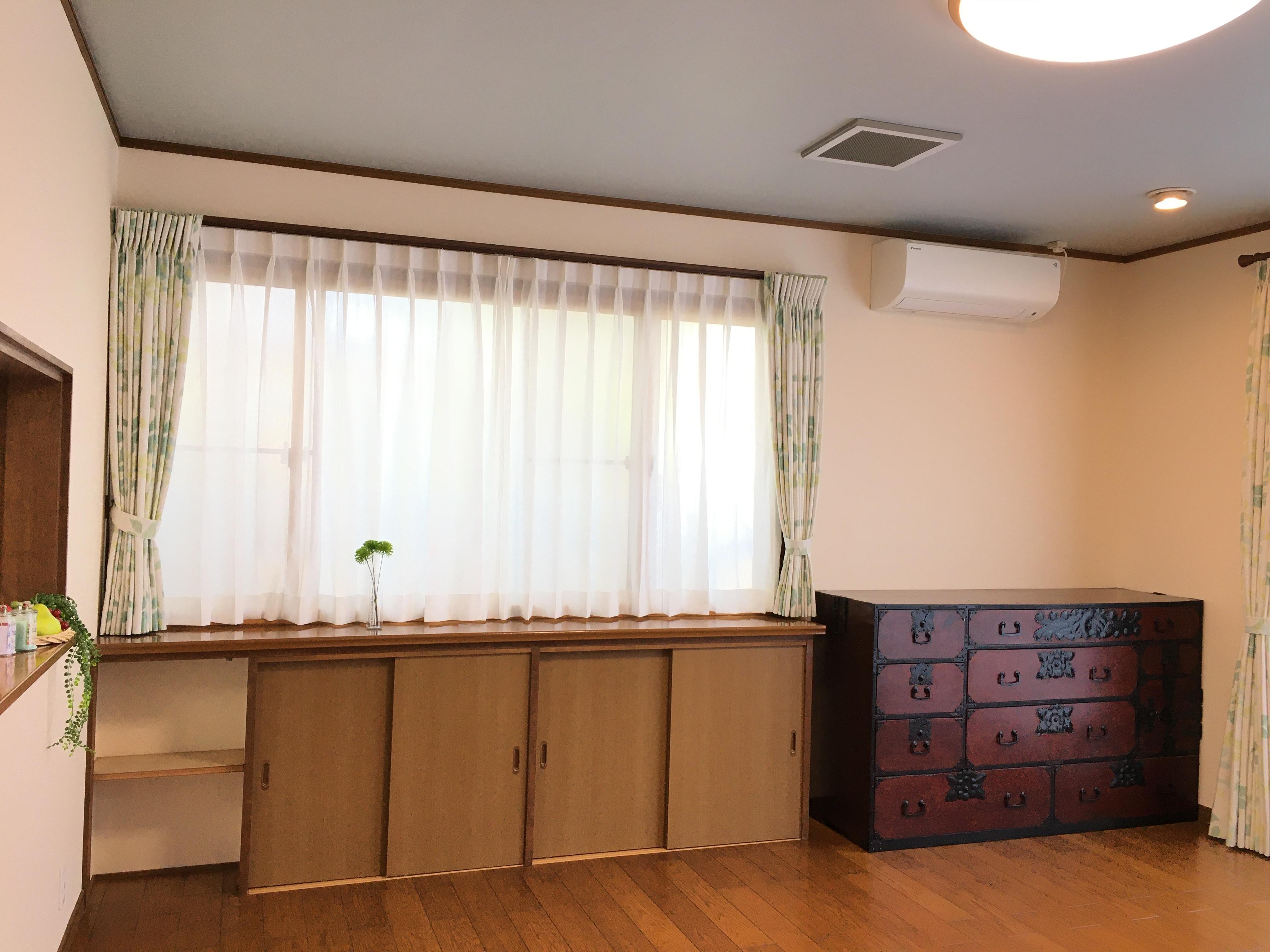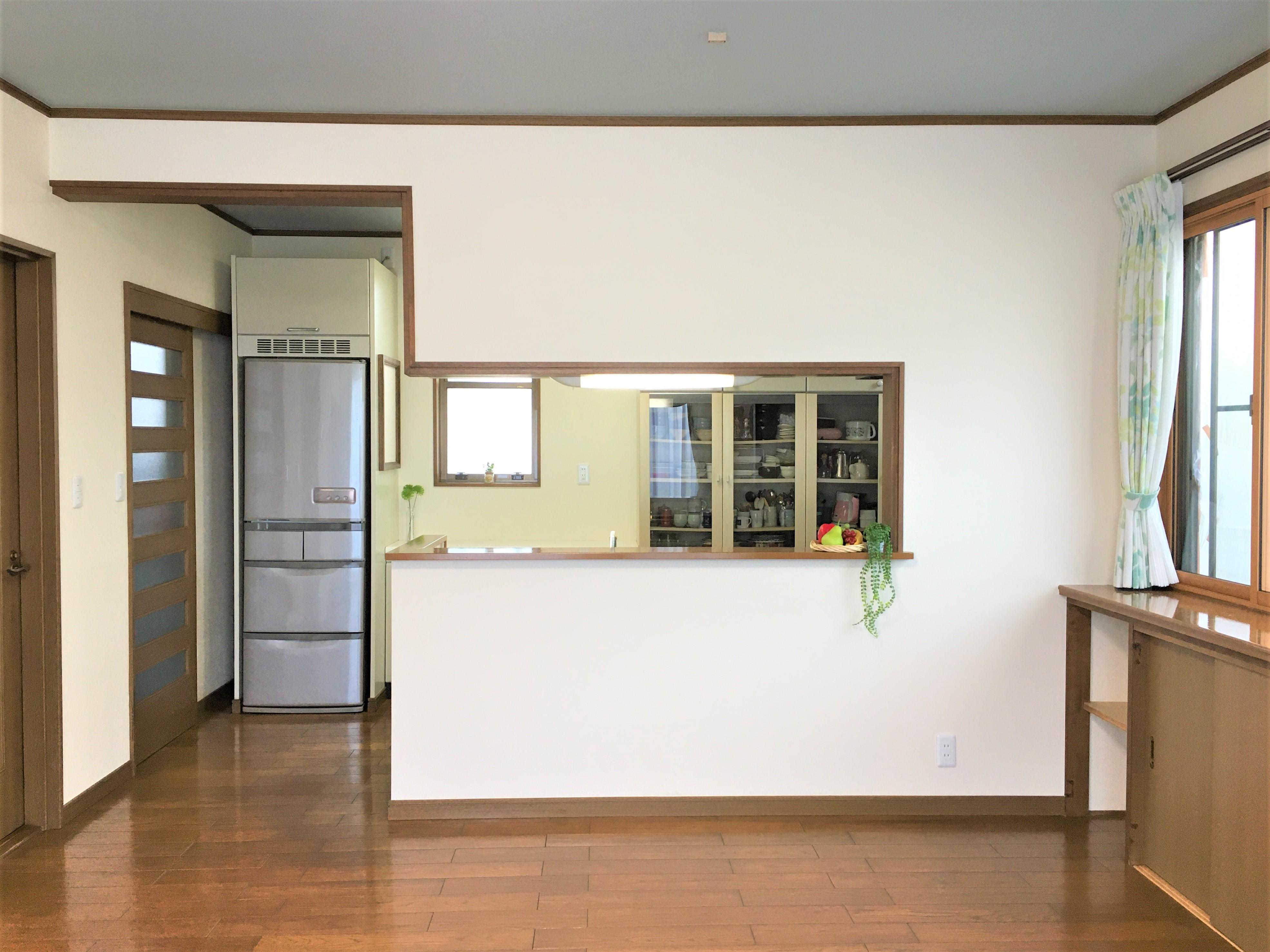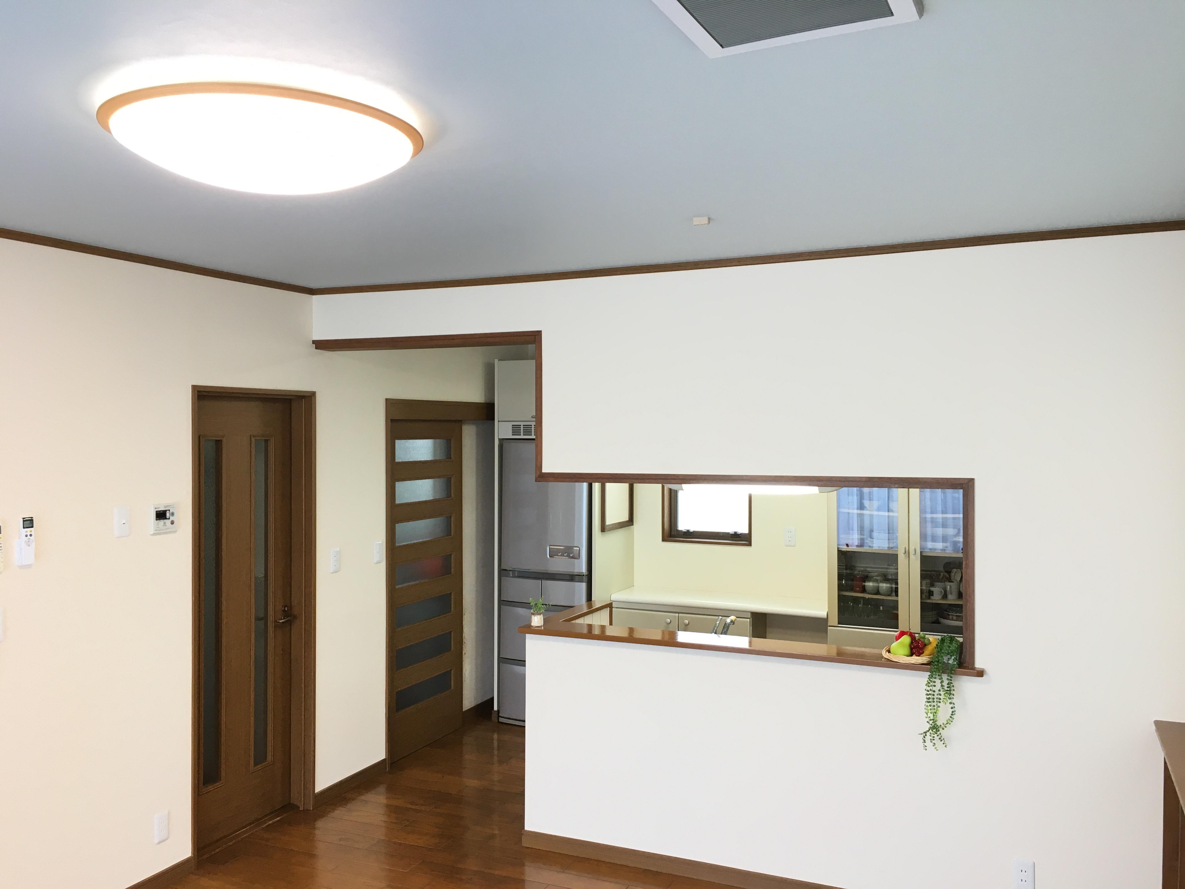 築30年のお宅を全面リフォームされました。壁のクロスを張替え、使いにくかったカウンター下部の物入の扉を開き戸から引戸に交換し、カーテンや照明器具も一新し、天井の色はスタイリッシュなブルーグレーの石目調クロスにし、スッキリとした印象の空間が出来上がりました。