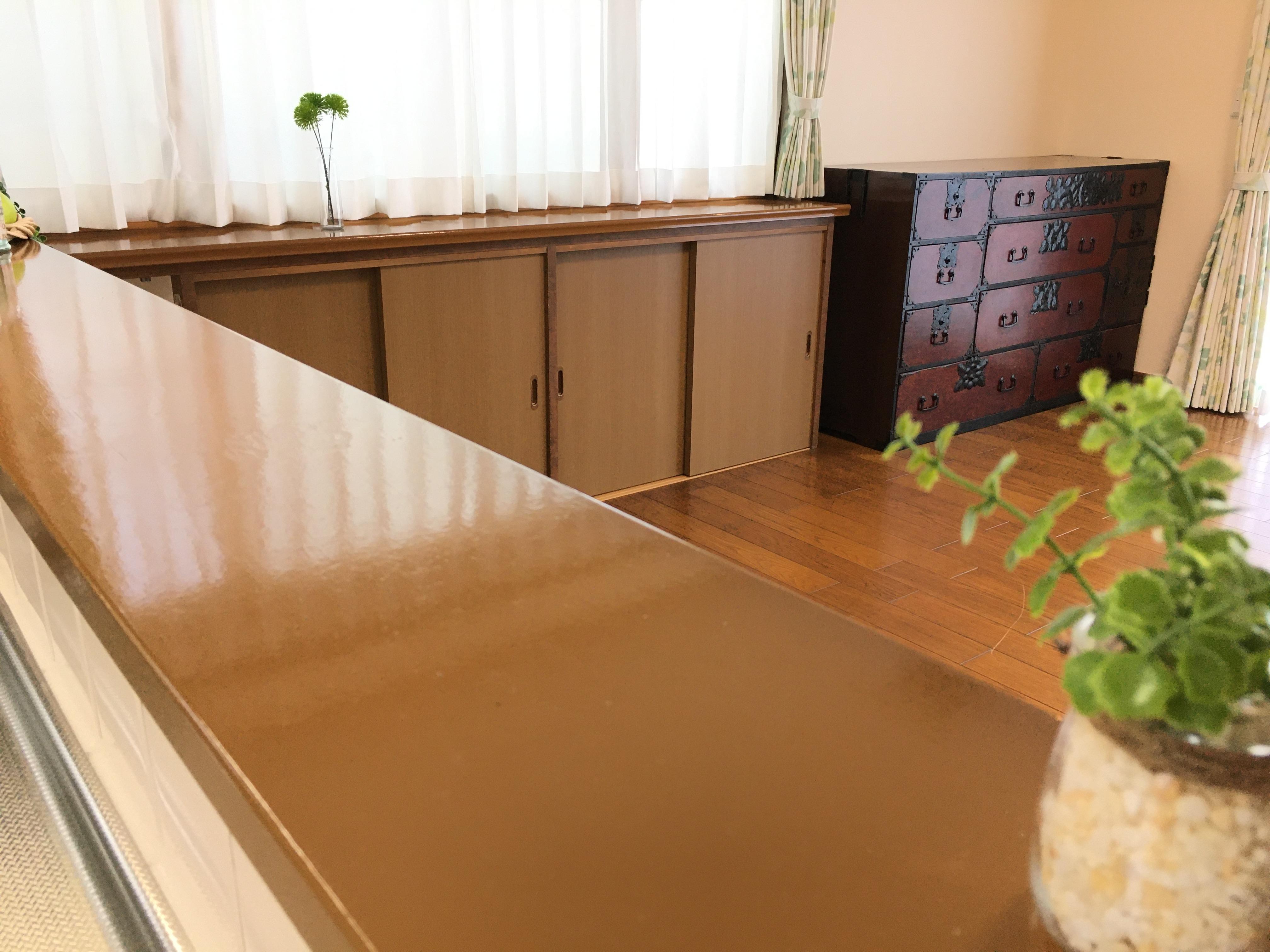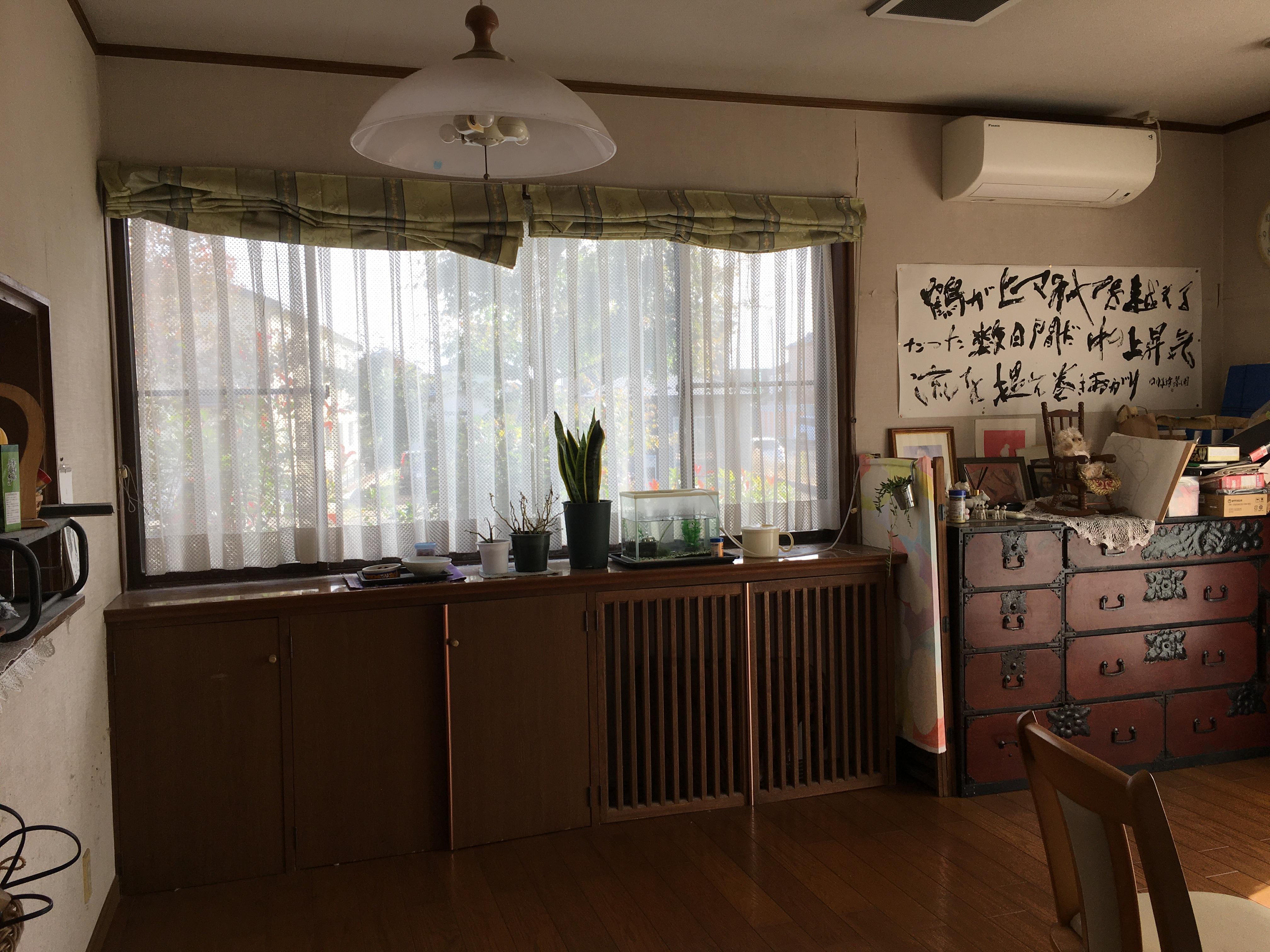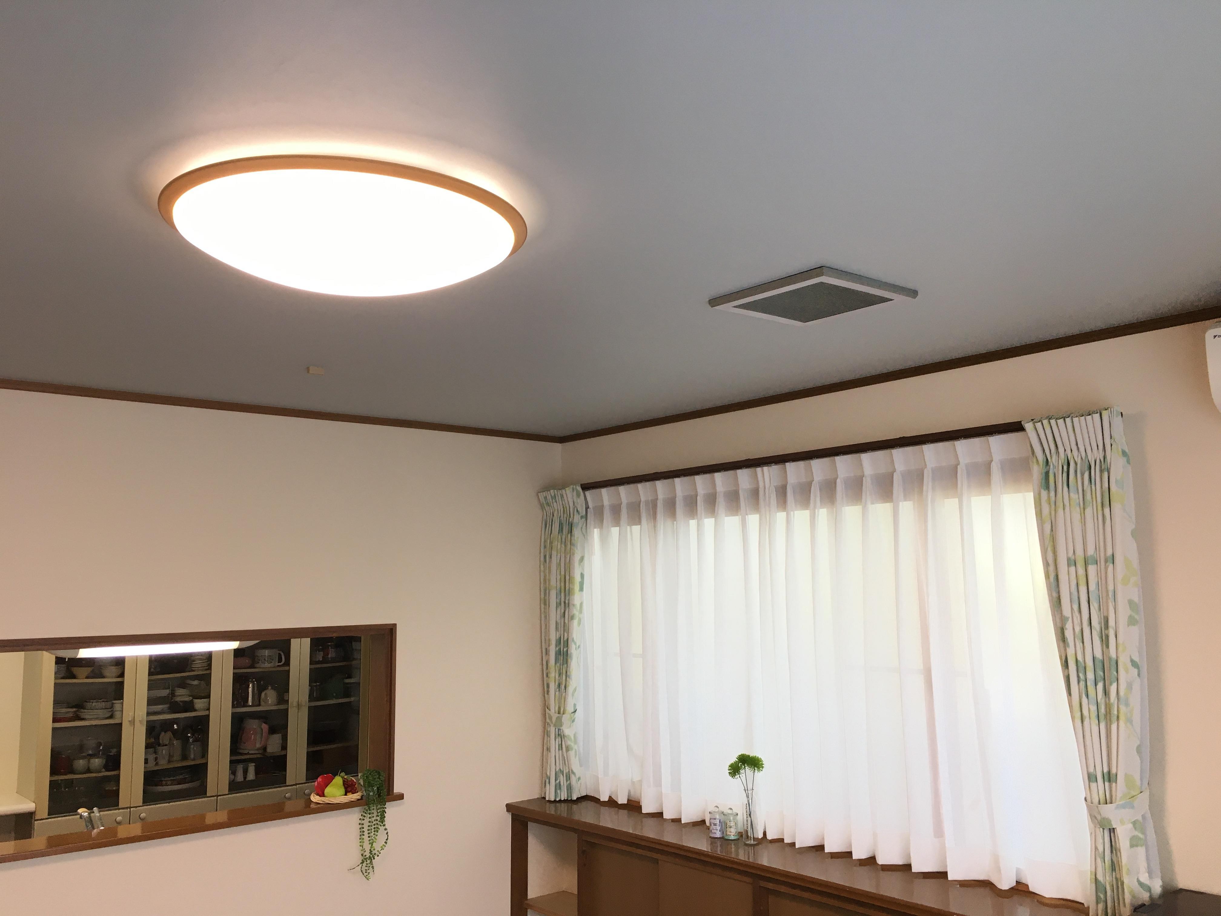 築30年のお宅を全面リフォームされました。壁のクロスを張替え、使いにくかったカウンター下部の物入の扉を開き戸から引戸に交換し、カーテンや照明器具も一新し、天井の色はスタイリッシュなブルーグレーの石目調クロスにし、スッキリとした印象の空間が出来上がりました。