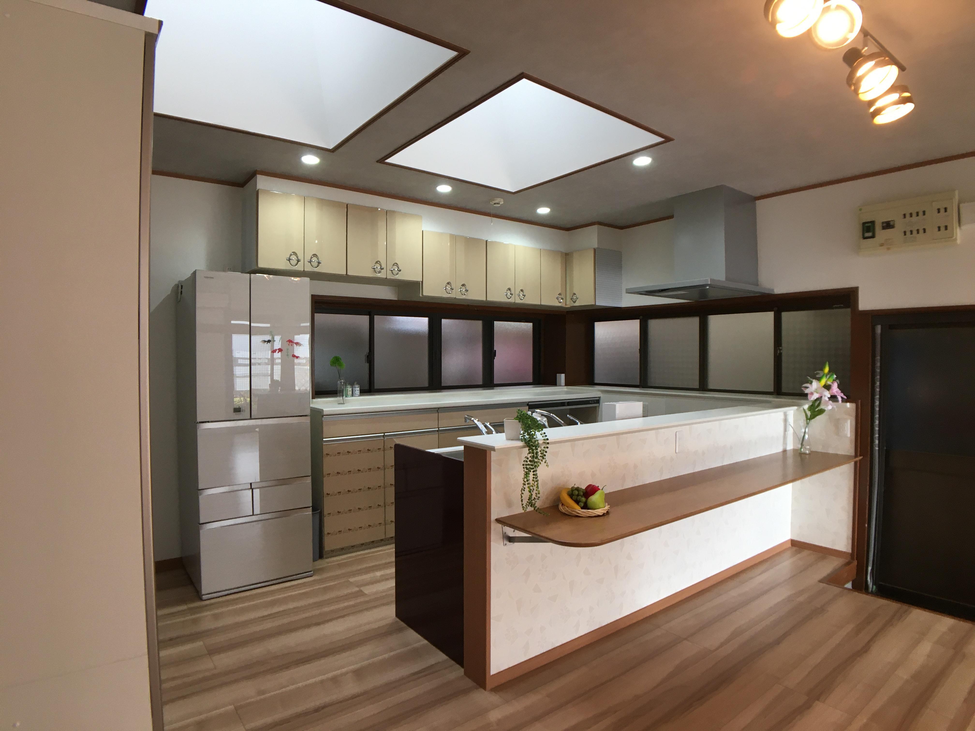築50年の古民家の、茶の間とダイニングキッチンを1つの広いLDKにしました。大きな造り付け飾り棚と引違い戸を解体し、向こう側にカウンターキッチンを据え付け、まるでカフェのように生まれ変わりました。北側で孤立していた台所は、南側のリビングと一部屋になったお陰で、明るく暖かな空間になりました。また、今まではワンちゃん猫ちゃんたちのために、寒い時でもエアコンをかけている時でも、扉を開け放していたのですが、これからは自由に出入りできるように、壁にペット用の出入り口を設けました。隣家に暮らすお孫さんたちも、広く明るく温かくなったLDKにとても喜ばれていました。これからはワンちゃん猫ちゃんお孫さんたちも含め、ますます笑顔があふれて、賑やかになりそうですね。