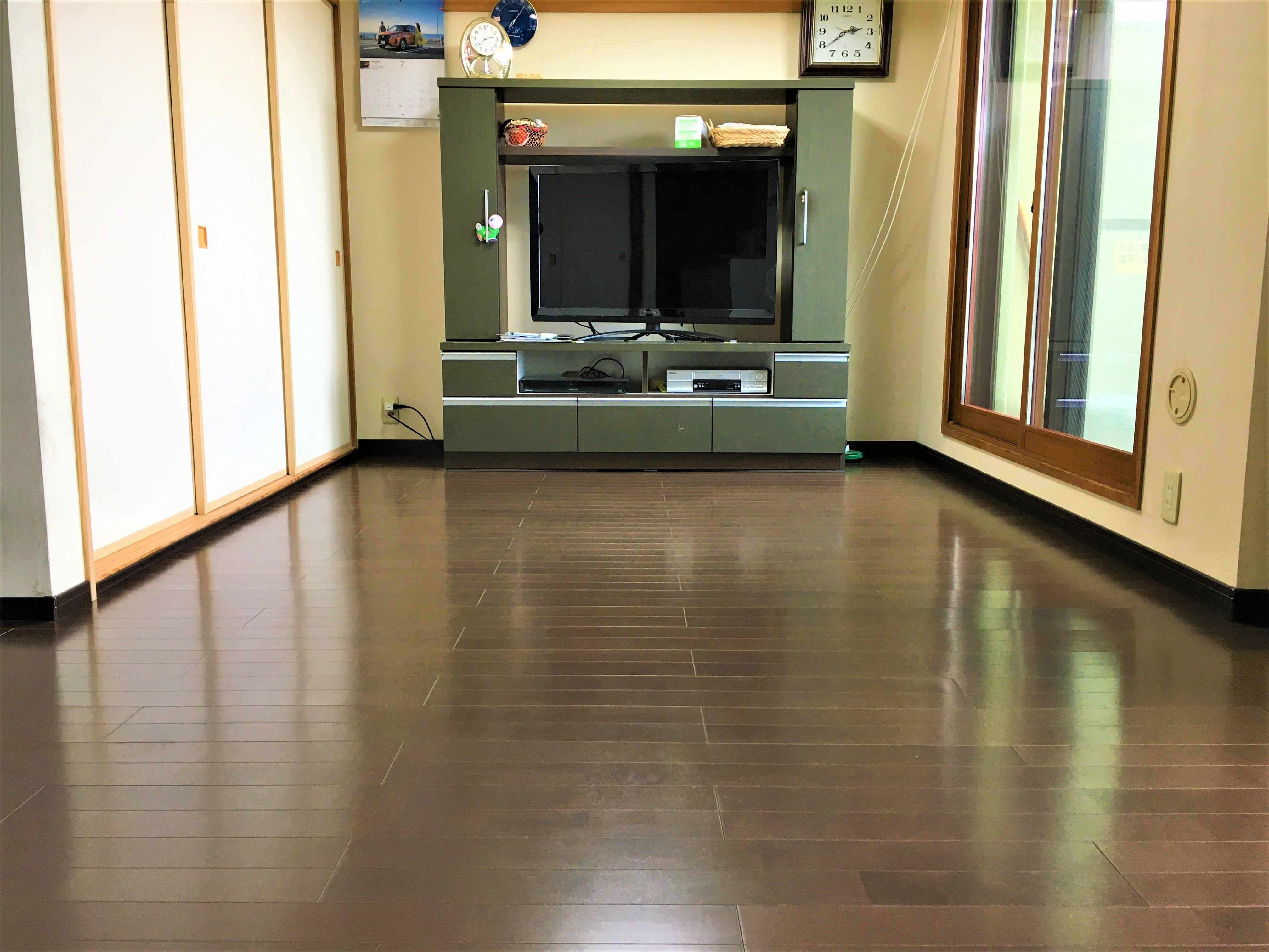 カーペット敷きだったリビング床に防音フローリングを敷き込みました。ダークブラウン色が落ち着きを醸し出してくれていますね。フローリングにしたことで、清掃がラクになり、キレイも長持ちです。