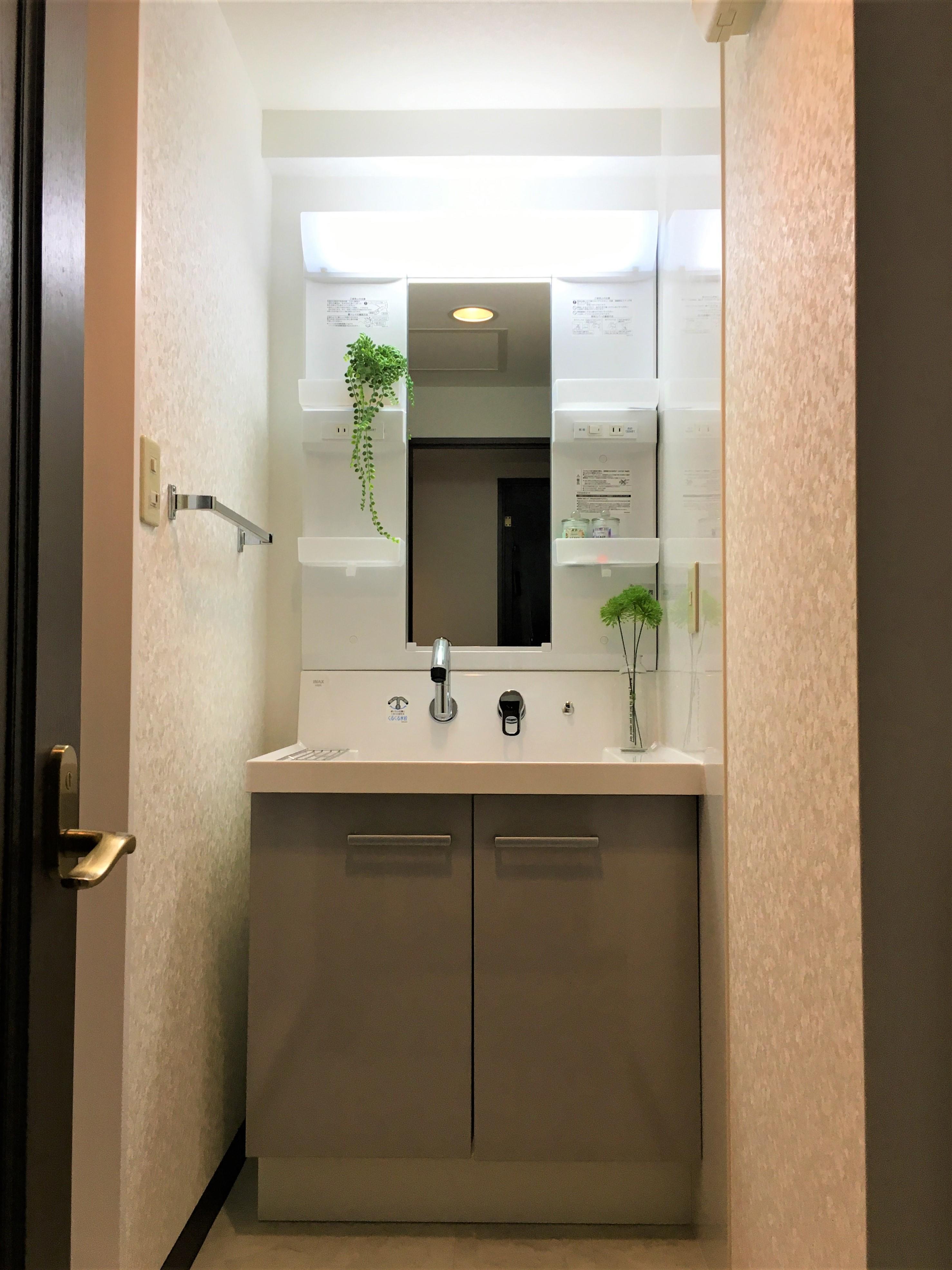 ライトグレーがスタイリッシュな空間を引き立ててくれています。化粧台はLIXILのピアラ。大きな洗面ボウルの使いやすさとお手入れのしやすさがおススメです。
