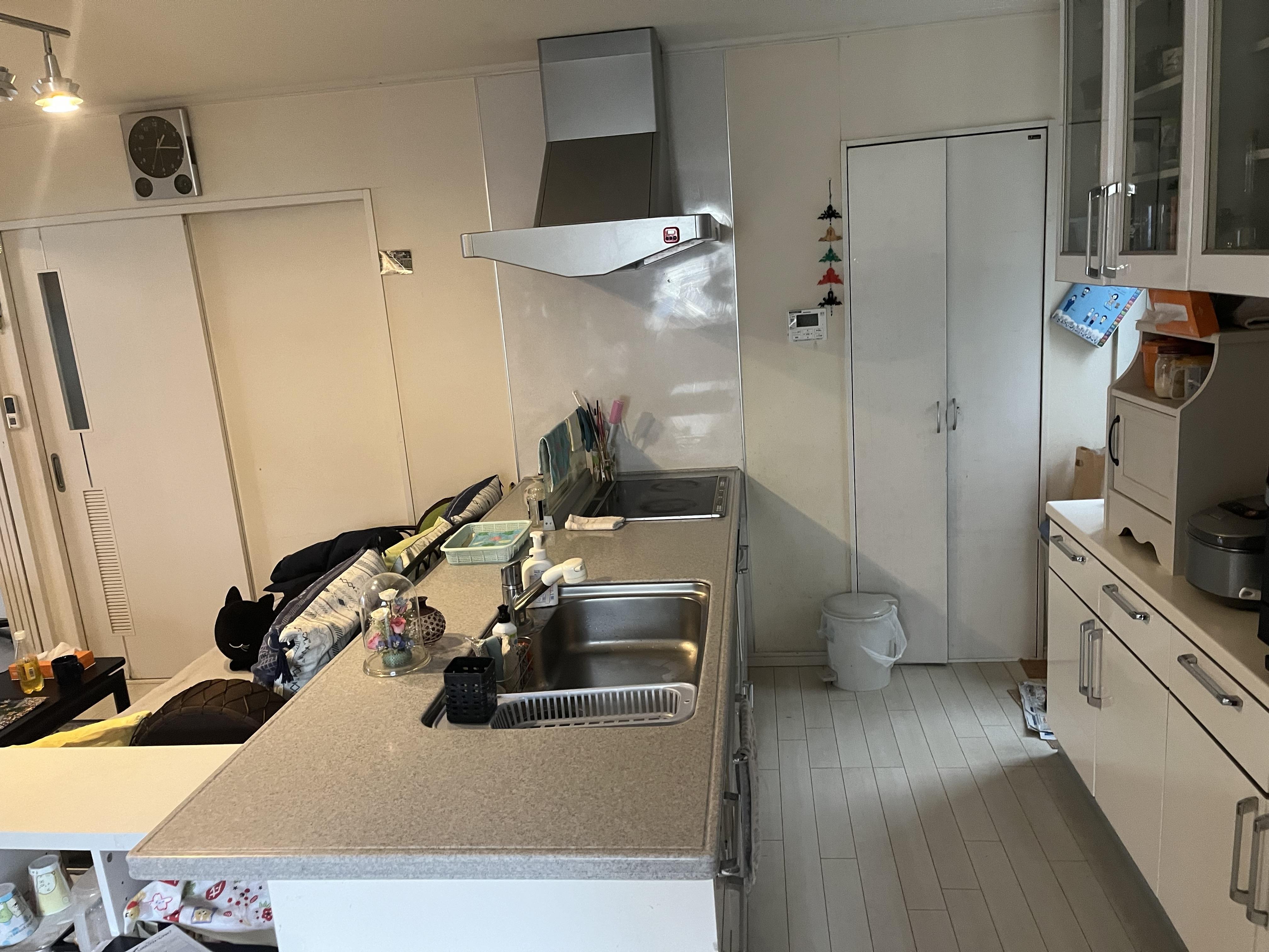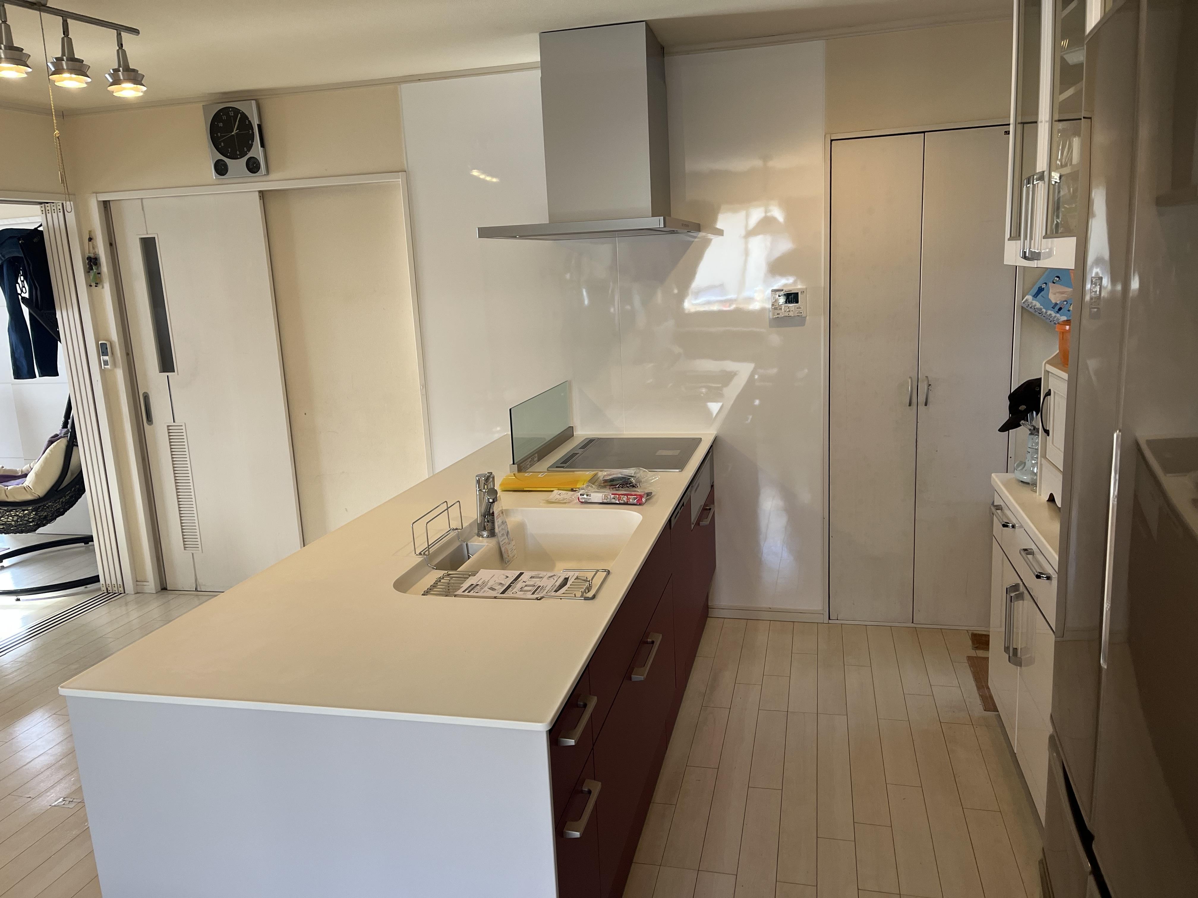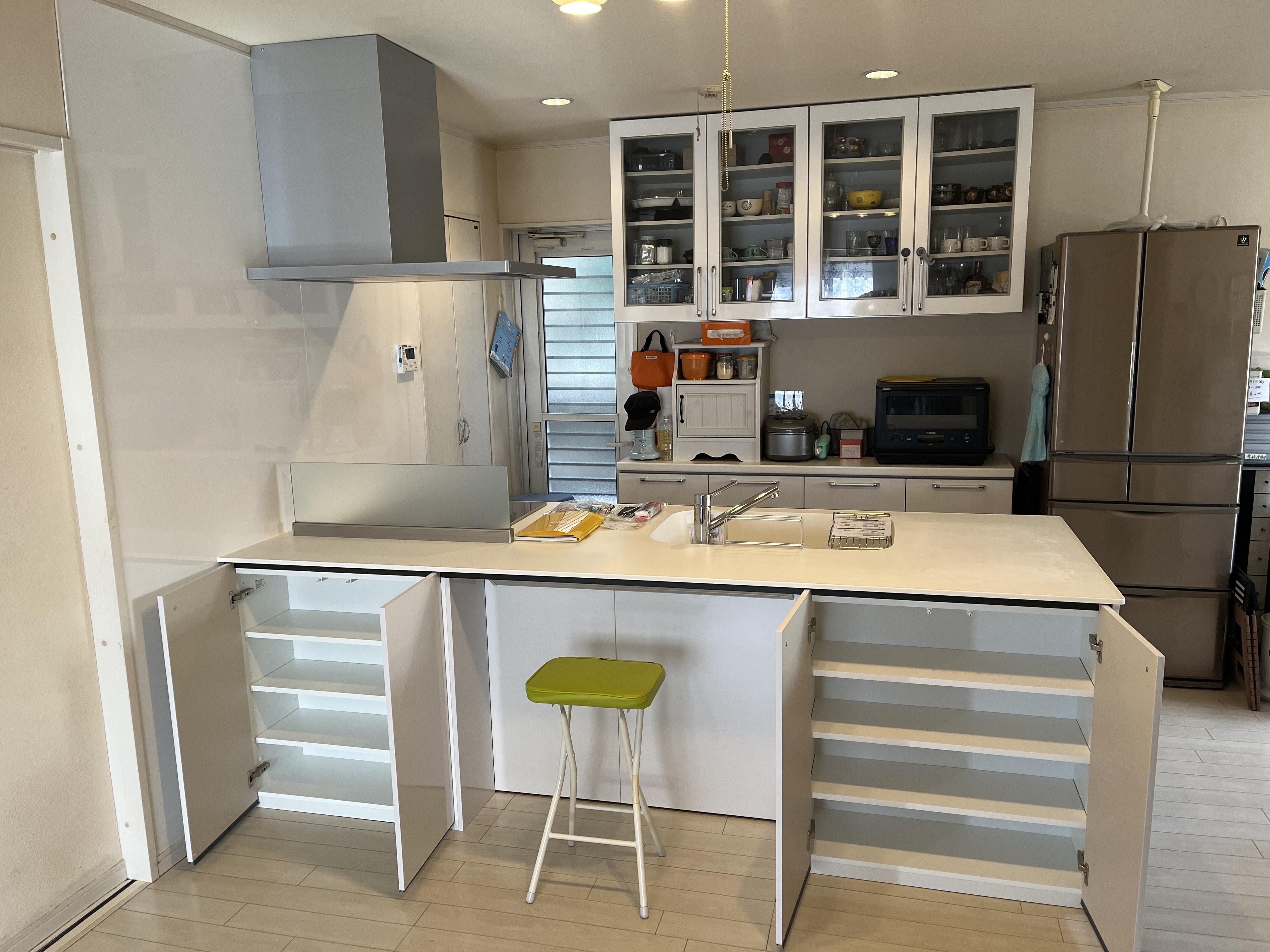 リビング側は白で邪魔しないようにしてキッチン側はお施主様の好きな色で楽しく料理ができるようにしました。 側面のキッチンパネルも大きくして汚れをきにしないで料理できるかなと思います。 (リビング側はクロスの落書き隠しのためサービス) パネルが大きくキッチンが明るく感じます。 朝食はみな時間がバラバラなためキッチンで1人ずつが多いとのことで、カウンターは1人分で両サイドは収納に。