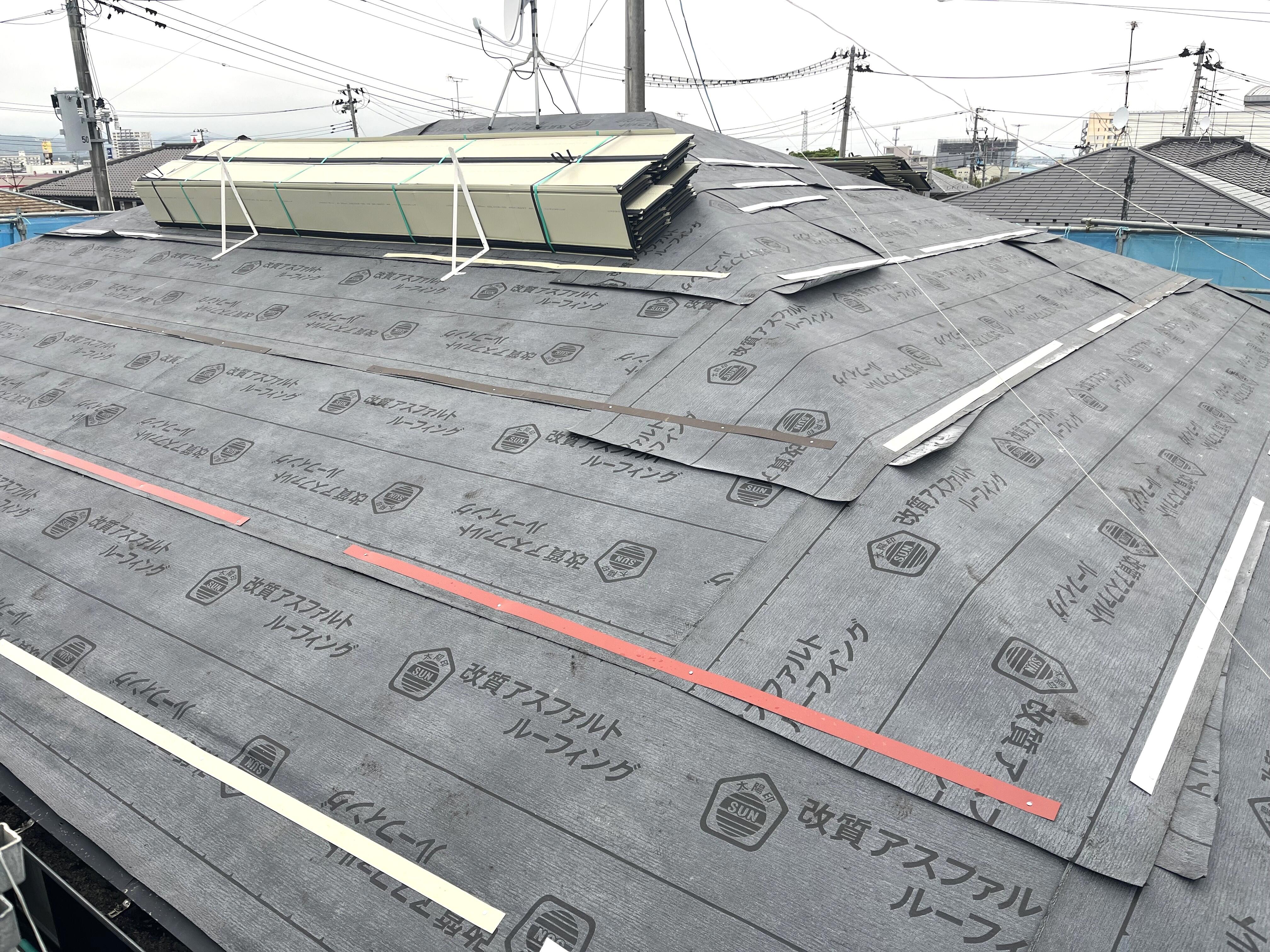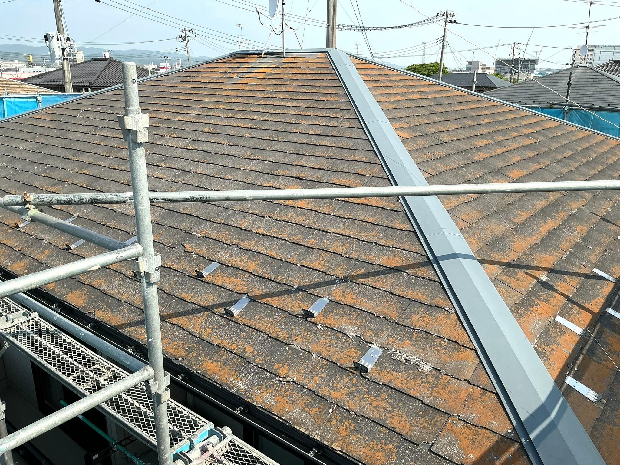 屋根の改修では、塗装をして長寿命化する方法もありますが、今回のケースでは劣化が全体に広がっていて屋根材が欠けている箇所も多いため、塗装ではさらなる劣化をおさえることは難しく、上から新しい屋根材を重ね葺きするカバー工法を採用していただきました。