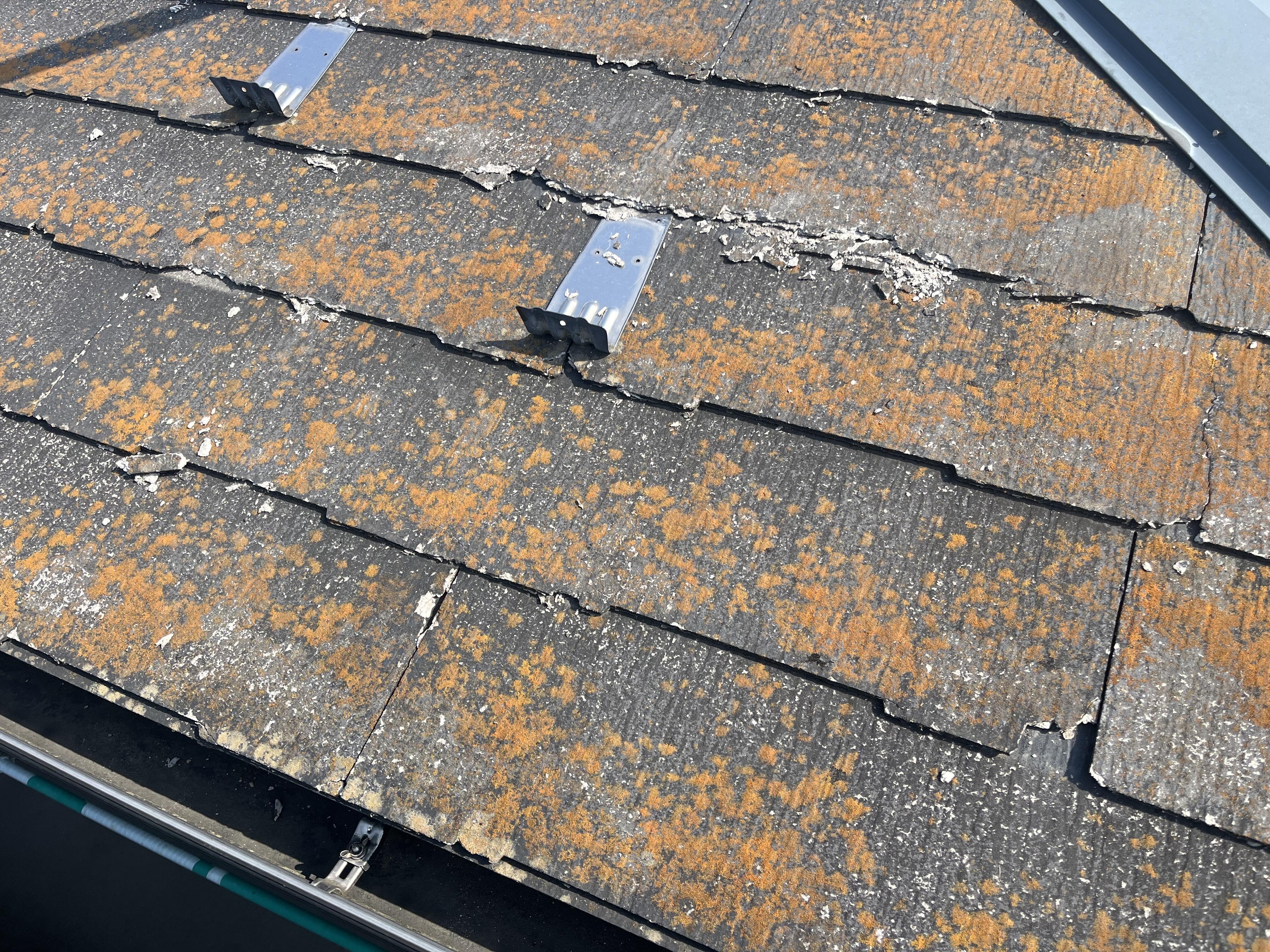 既存の屋根は化粧スレート材。20年経過して苔むし、欠けやひび割れが発生していました。今年の3月26日、宮城県で起きた記録的な暴風の際、割れた屋根材が1枚吹き飛んだそうで、ご不安に思っていたそうです。