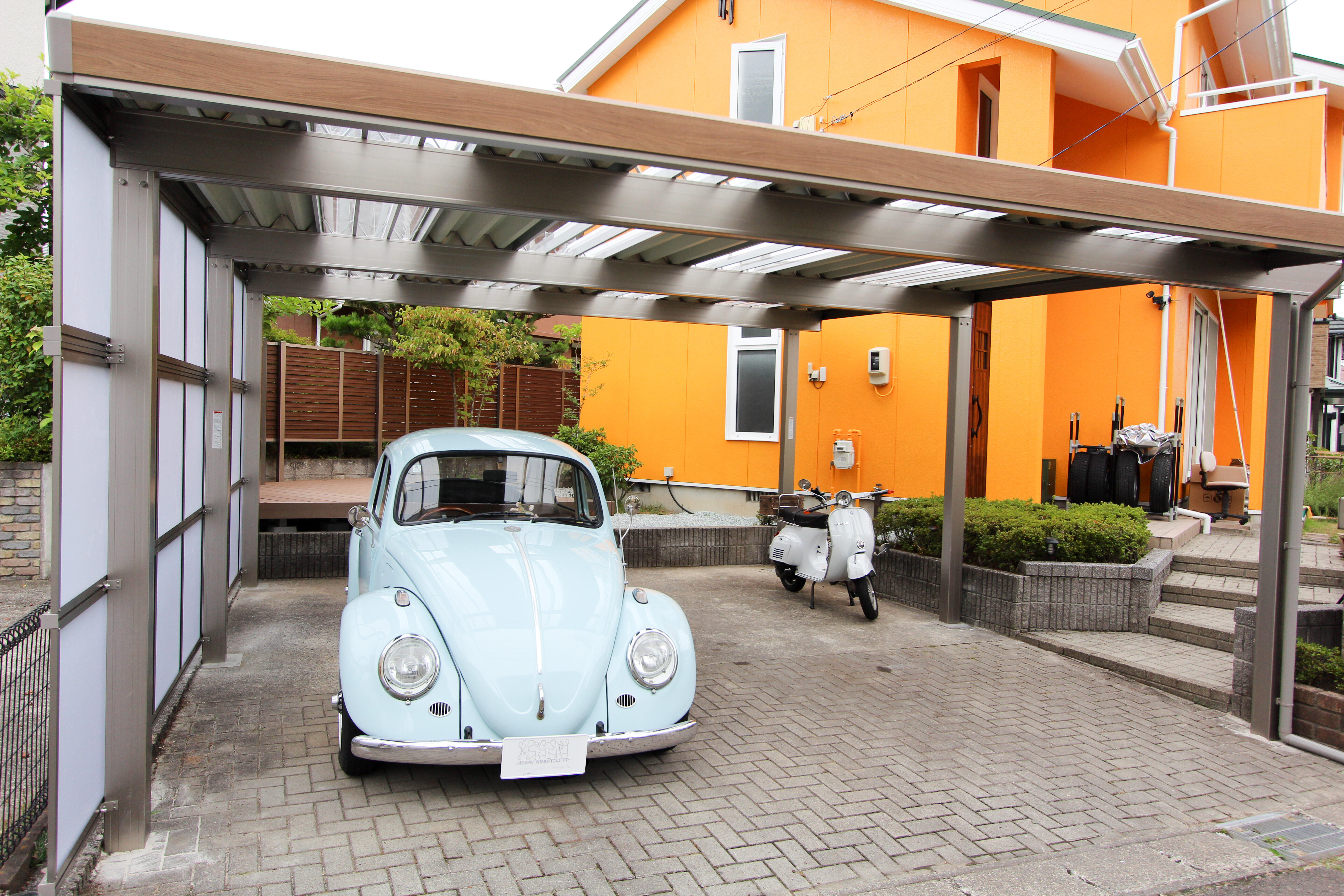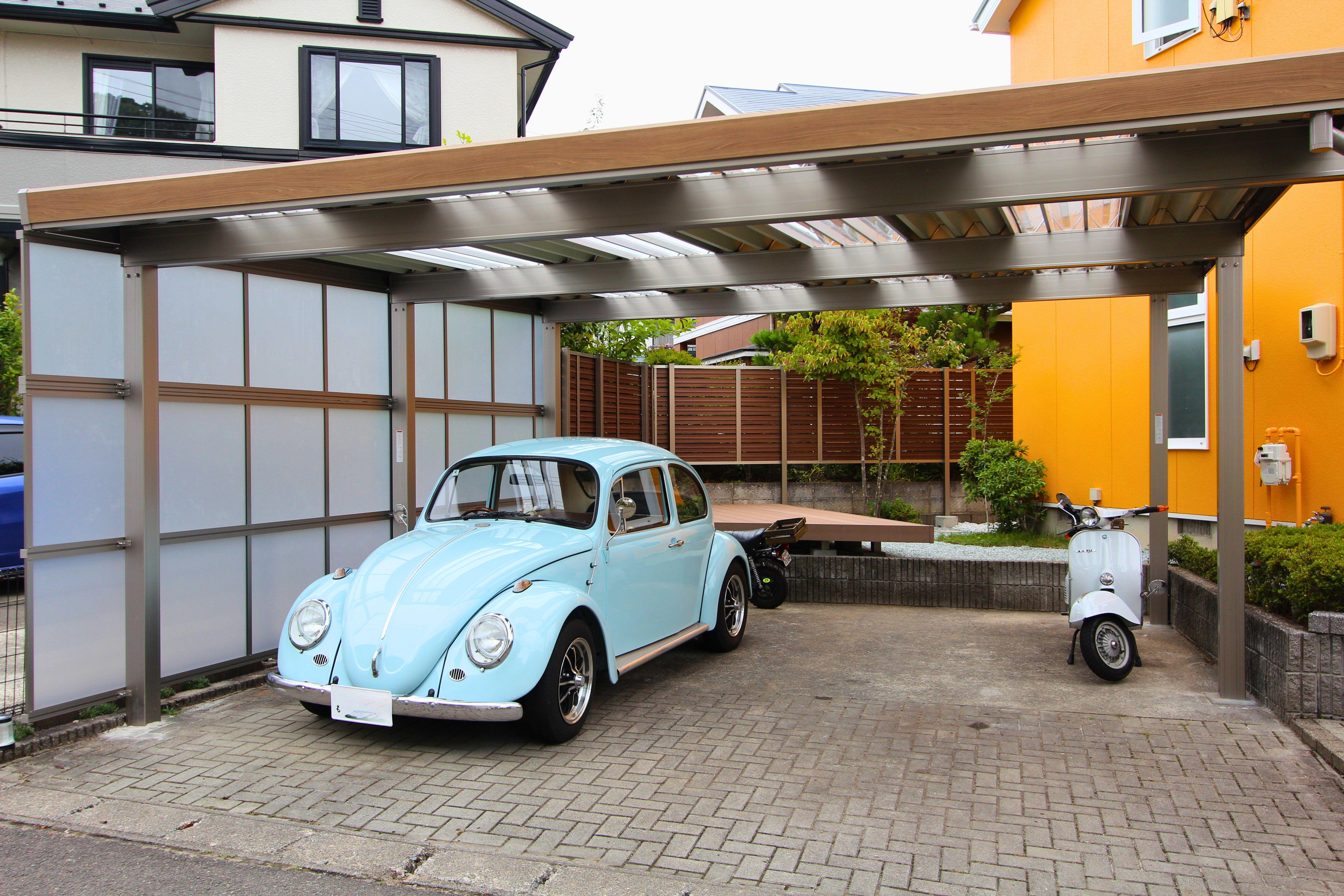 重厚で風に強いLIXILの「カーポートSW」と寛ぎのデッキ「樹ら楽」を新設。隣地との間にはフェンスを取り付け、防犯砂利を敷設することで、プライバシー保護とセキュリティ対策を両立しました。