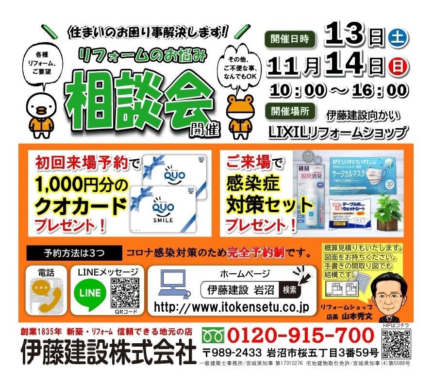 11月13日(土)、14日(日)にリフォームのお悩み相談会を開催します。