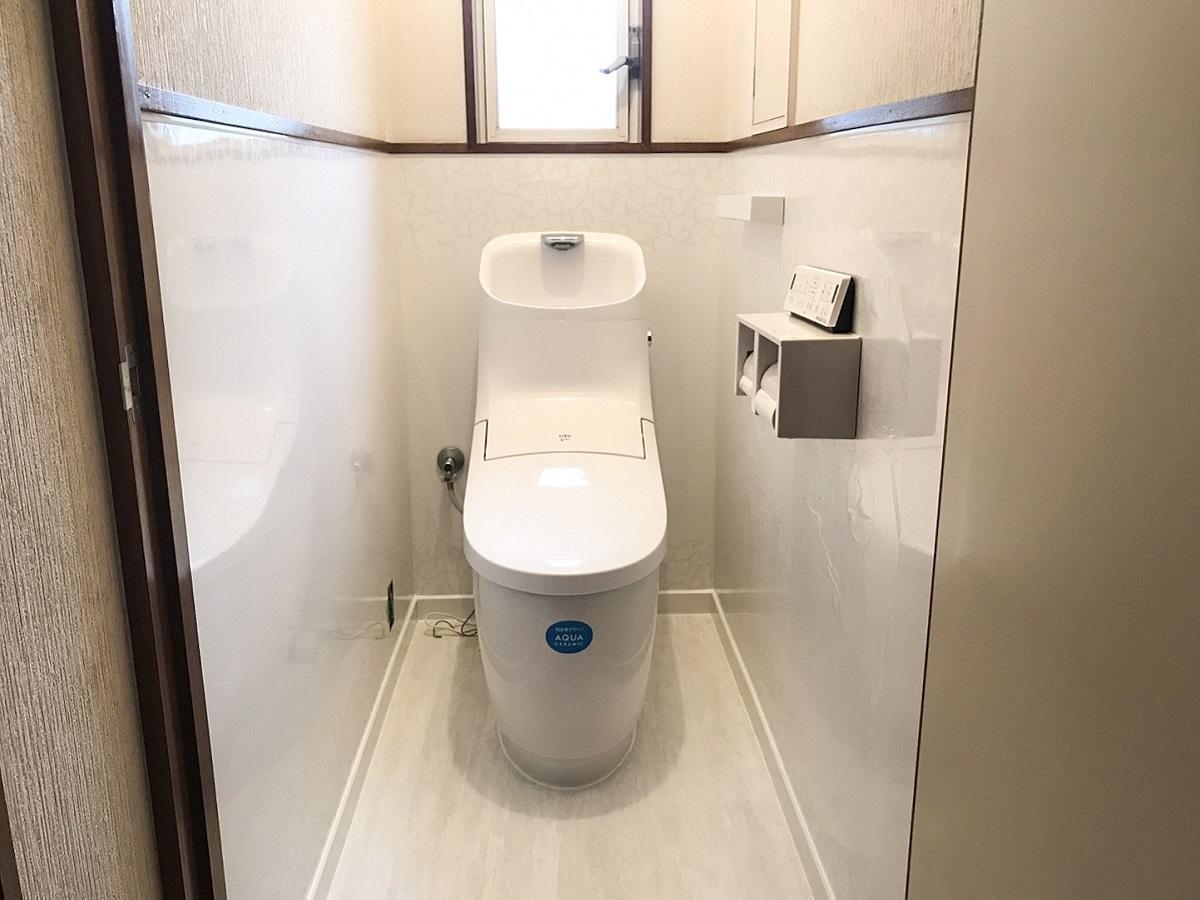「せっかくリフォームするなら、同時にトイレもリフォームしてしまいたい!」との事で、他の部位と共にお話を進めさせて頂きました。お客様のご家庭には男の子のお子様が二人おられ、使用時の飛び散りが気になるとの事でした。そこで、タカラの【ホーロークリーントイレパネル】をご提案させて頂きました。トイレ本体は、LIXILの【プレアスHS】を設置されました。