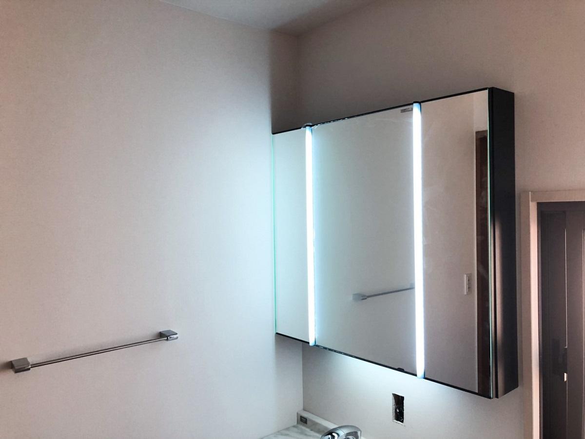 今回お客様にご提案させて頂いたのは、LIXILの【ルミシス】です。ルミシスは様々なスタイルにフィットするカラーバリエーションで、お客様はラピシアホワイトを選ばれました。どの色も大柄な石目模様で、上質な空間を創りだします。ライトは、縦に配置したLED照明により、影の出やすいあごの下や頬に影をつくりにくくしてくれるのでファンデーションの塗りムラや髭の剃り残しのチェックにもとてもおすすめなライトとなっています。一体形成でお掃除もラクラクとなっているのでお客様にも大変ご満足いただけました。ご縁頂きありがとうございました。