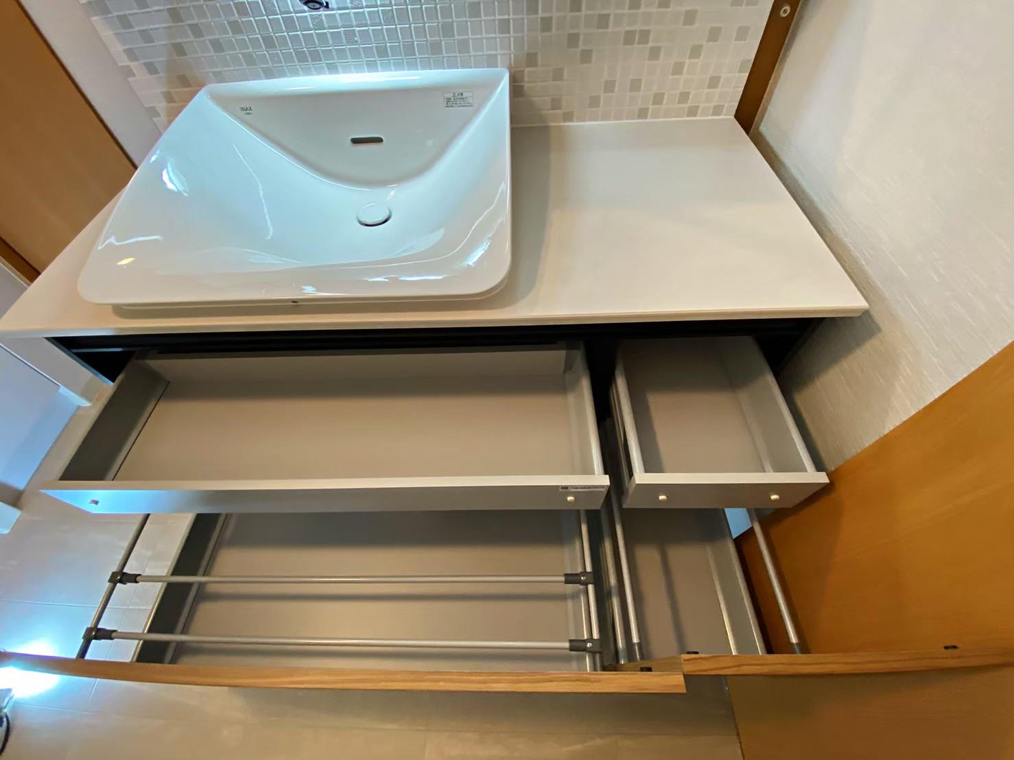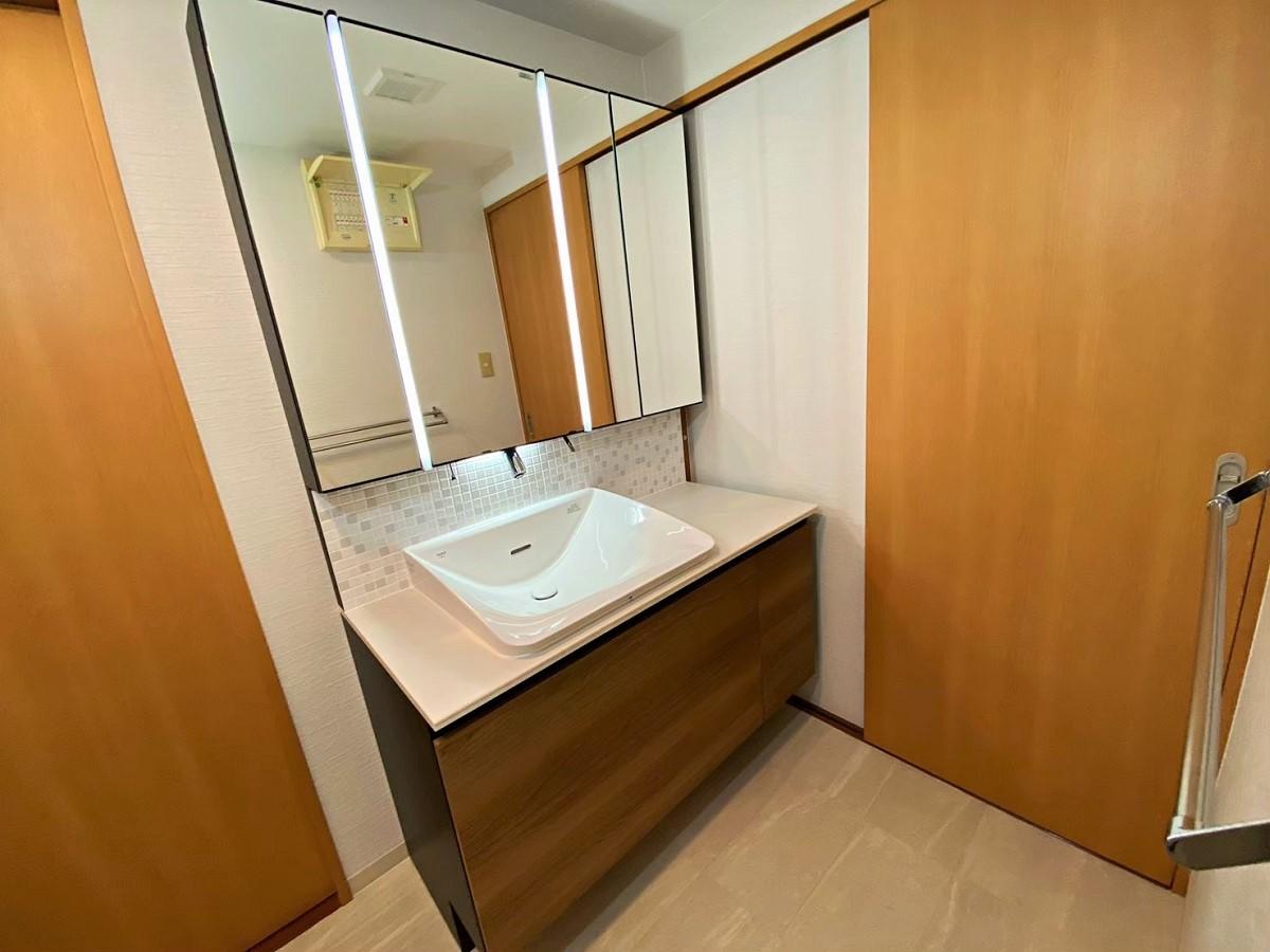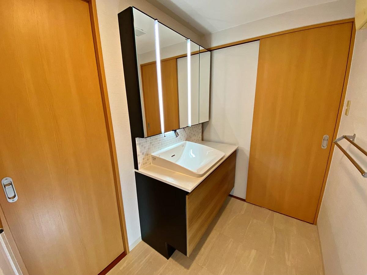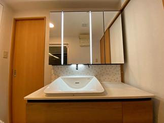 LIXIL【ルミシス】を施工させて頂きました。 タイル製バックパネルがアクセントになり洗練された美しい洗面所に生まれ変わりました。 毎日の身支度をもっと楽しんで頂けると思います。