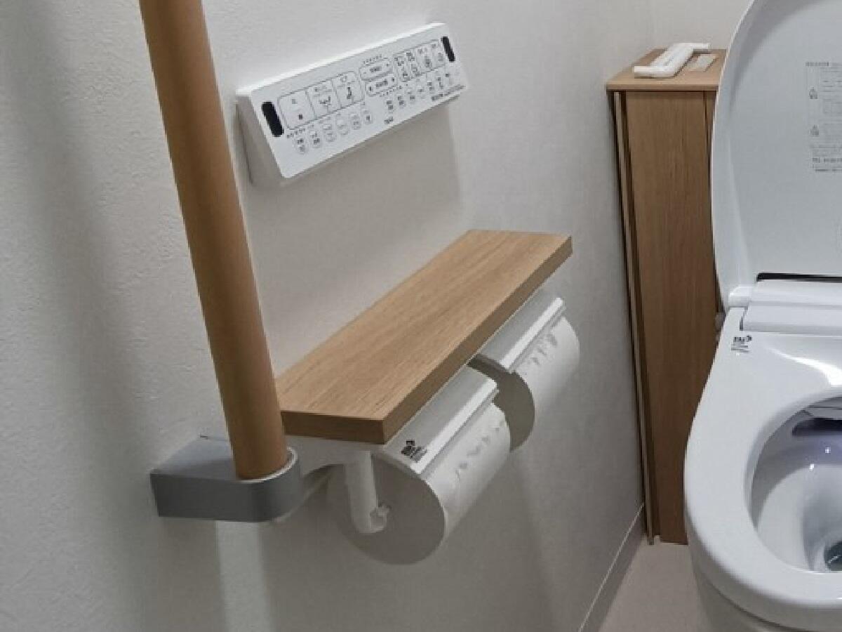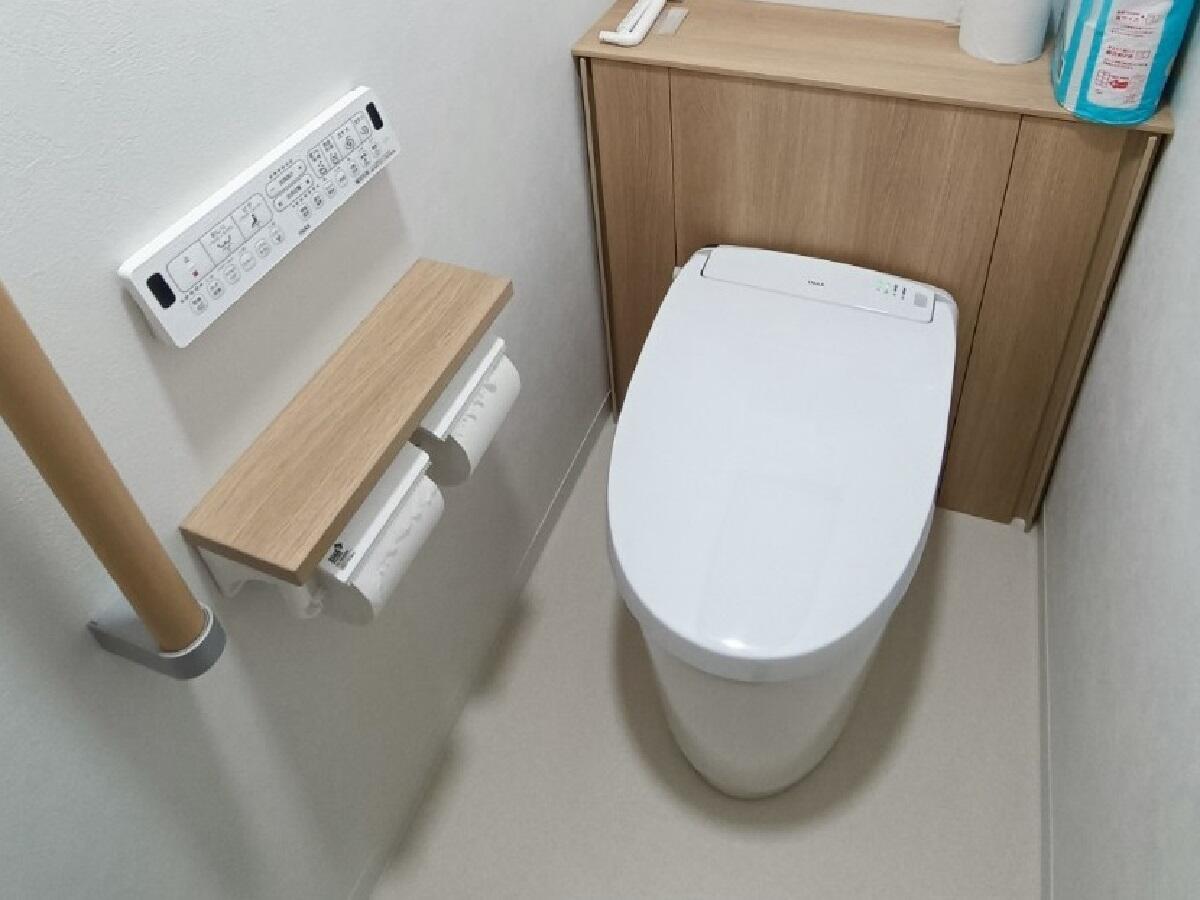 キャビネット付きのLIXIL【Jフィット】を施工致しました。 キャビネットを付けたことにより、給水管やタンクまわりに露出しているコードも隠せてスッキリしました。 床に置きがちなお掃除道具や、予備のトイレットペーパーなども収納できます。 出ている物が少ないとお手入れも簡単にできて嬉しいですね。 冬場のお悩みであった寒さの対策として暖房機を設置致しました。 床にはクッションフロアを貼りクロスも張り替えて温かみのある明るいトイレへと変身しました。