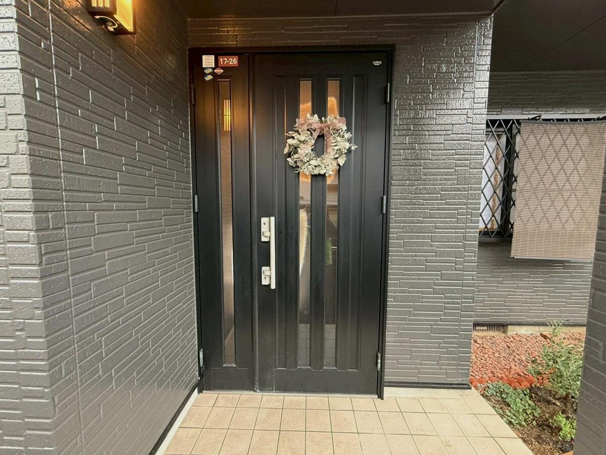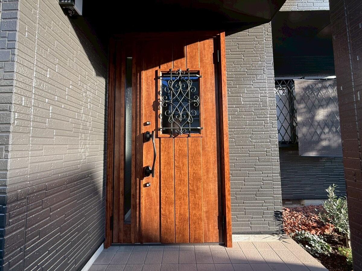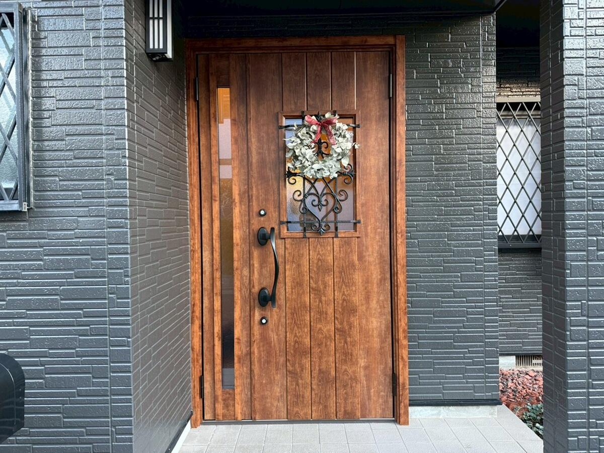 今回の玄関リフォームでは、LIXIL【リシェント 】D41型 親子ドア を採用し、断熱性能 K2仕様 に対応しました。ドアカラーは深みのある色合いの「ハンドダウンチェリー」 をお選び頂きました。 重厚感と温かみのある玄関空間に仕上がりました。 既存の玄関ドアを短期間で交換できるリシェントなら、工期も短く生活への影響も最小限です。 断熱性能が高まったことで、冬場の冷気の侵入も抑え、快適で安全な住まいへと生まれ変わりました。