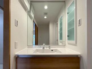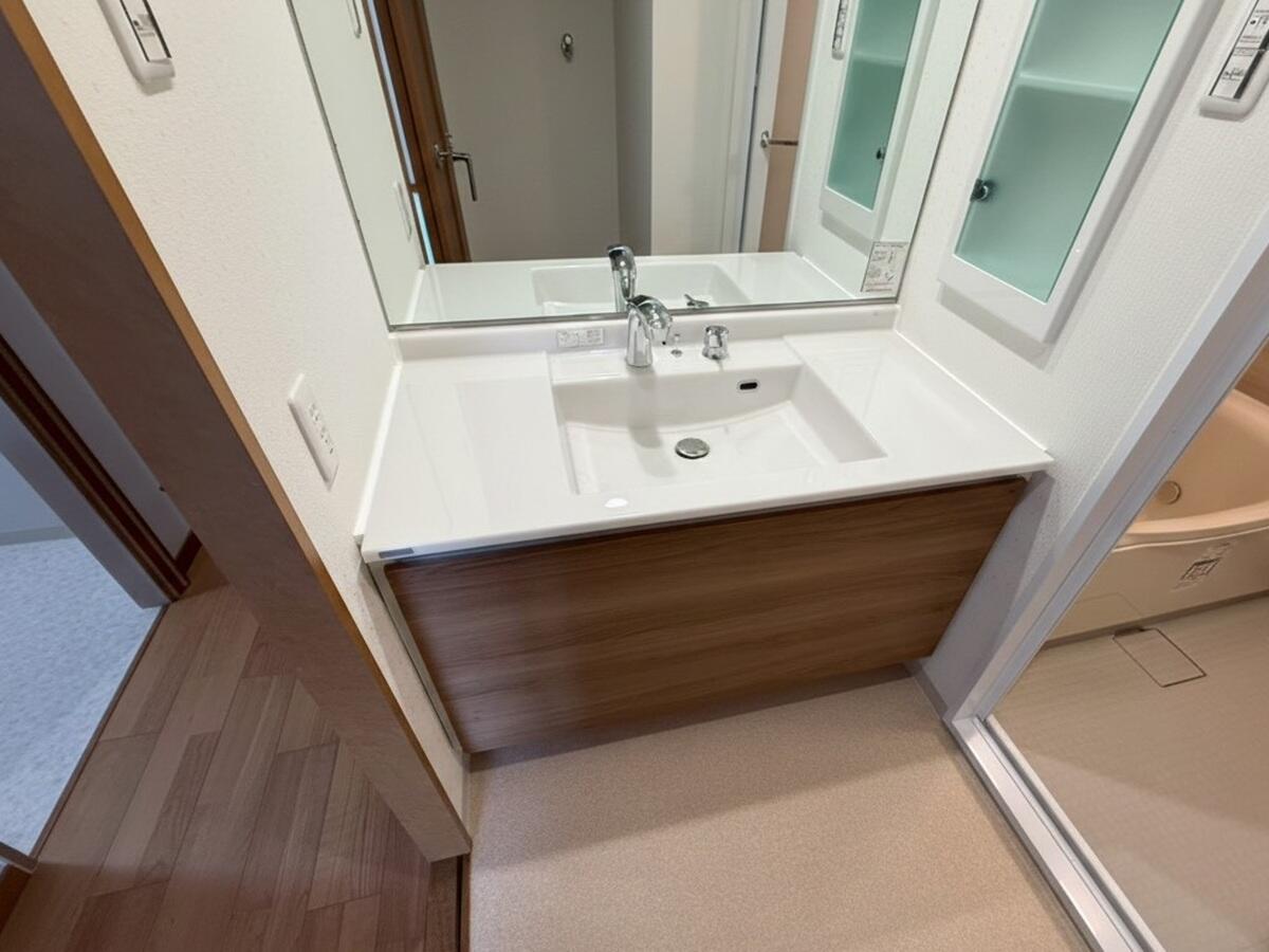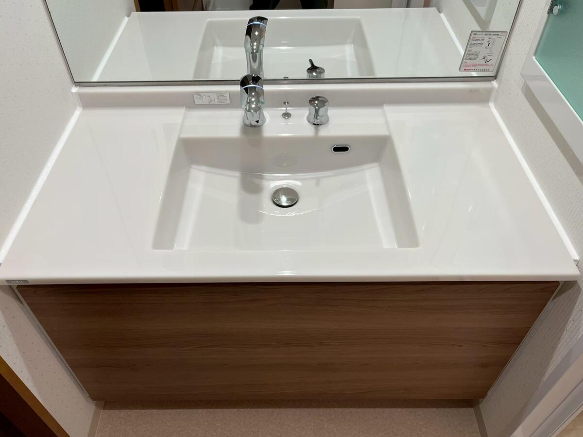 マンションの洗面をLIXIL【ルミシス】へと変更致しました。 ボウルとカウンターは一体型仕様のため、汚れが溜まりにくい設計です。水ハネもさっと拭き取ることができ、毎日のお手入れがぐっとラクに。忙しい朝の時間帯でも、きれいな状態を簡単に保てます。 カウンターには人造大理石「ラピシアカウンター」を採用しており、なめらかな質感と上品な光沢が空間に高級感を与え、洗面室全体をワンランク上の印象に仕上げています。 さらに、洗面全体をしっかり照らす上部ライン照明を設置。空間全体に均一な光が広がり、顔に影ができにくいため、毎日の身支度も快適です。 機能性とデザイン性を兼ね備え、明るく清潔な洗面空間が完成しました。