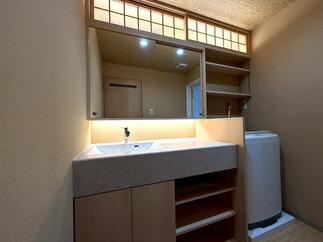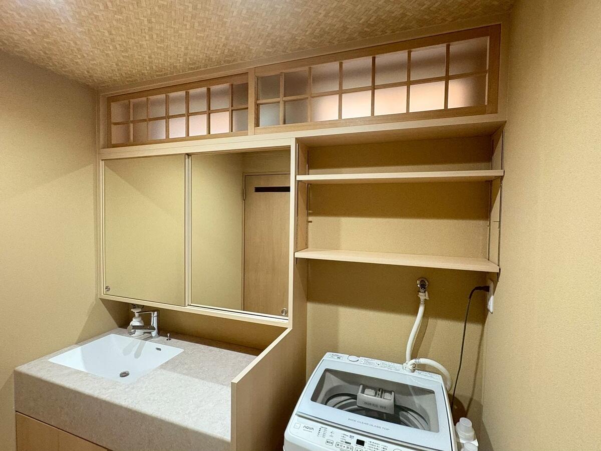 既存の浴室は経年による傷みや使い勝手の面でお悩みがあり、今回採用したのはLIXILの「リデア」です。清掃性や断熱性に優れ、快適さと機能性を兼ね備えた浴室へと生まれ変わりました。 洗面スペースは既製品ではなく造作で仕上げました。 素材や寸法にこだわることで、使い勝手と美しさを両立しました。 床には籐の質感を再現したクッションフロアを採用し、素足にもやさしく、見た目にも温かみのある印象に。さらに天井には味わい深い網代柄のクロスを取り入れ、空間全体に奥行きと趣をプラスしています。 まるで旅館のように落ち着きのある上質な水廻り空間へ。日々の暮らしの中で、ほっと心がほどけるひとときを感じていただけるリフォームとなりました。