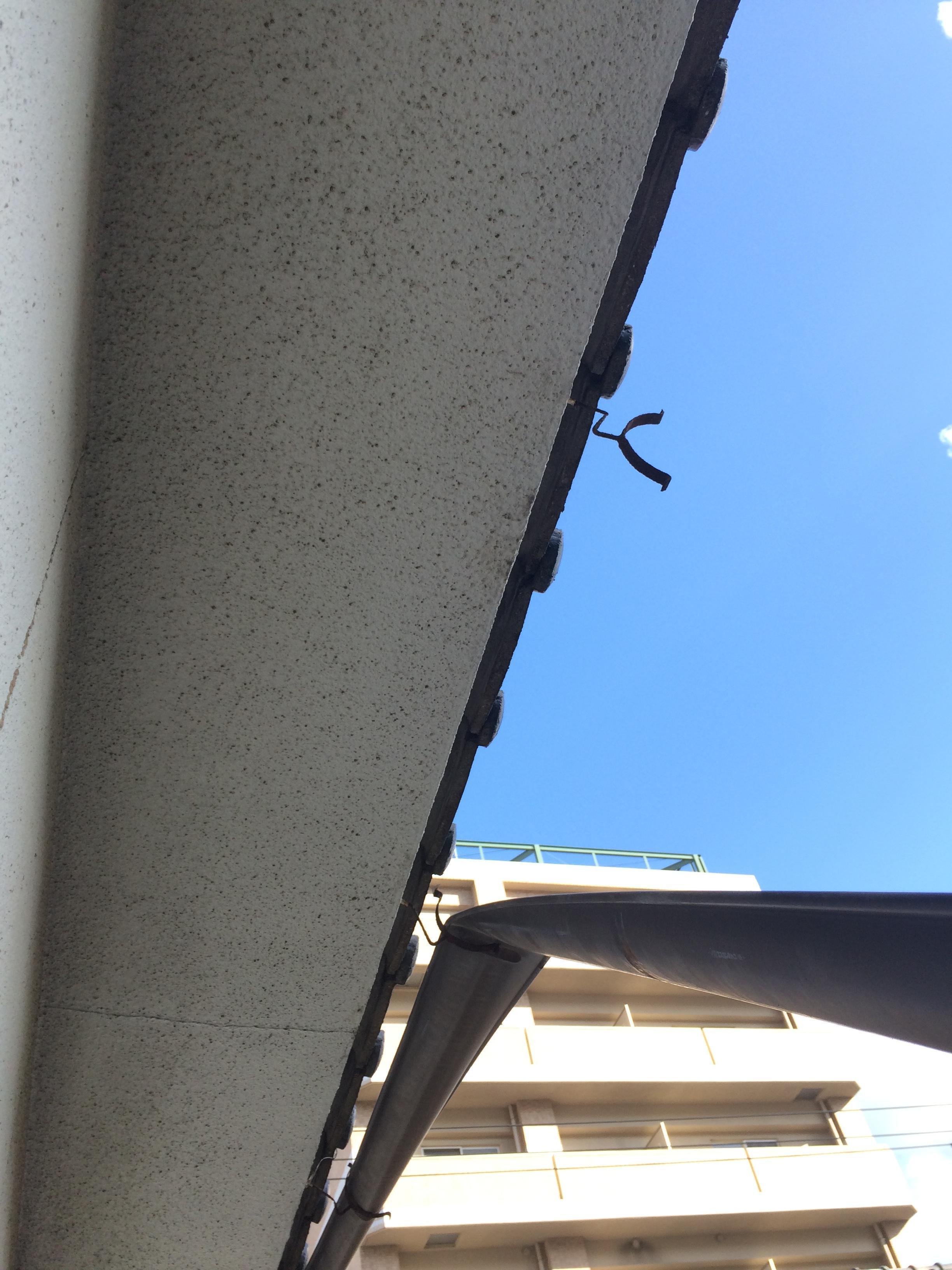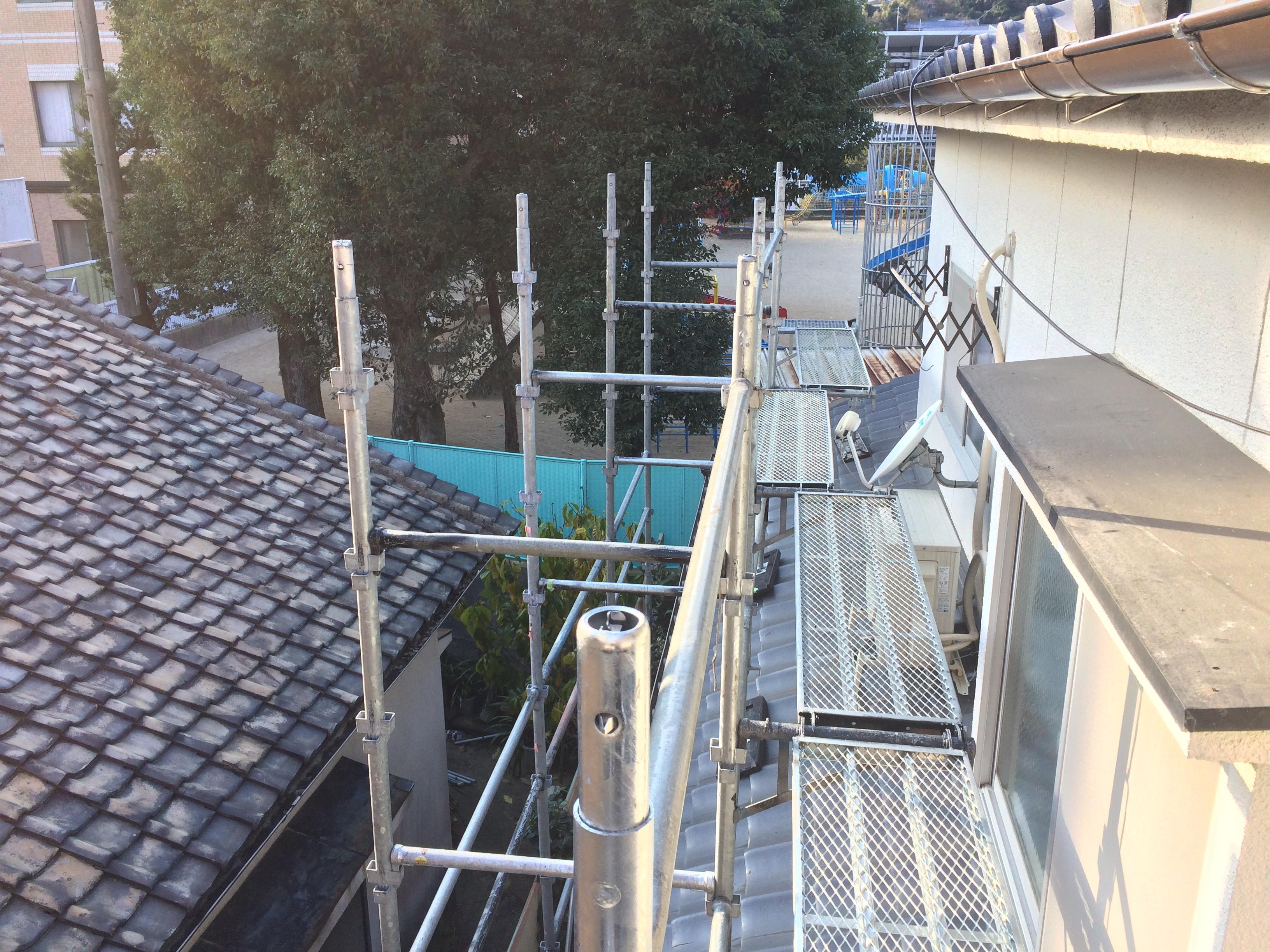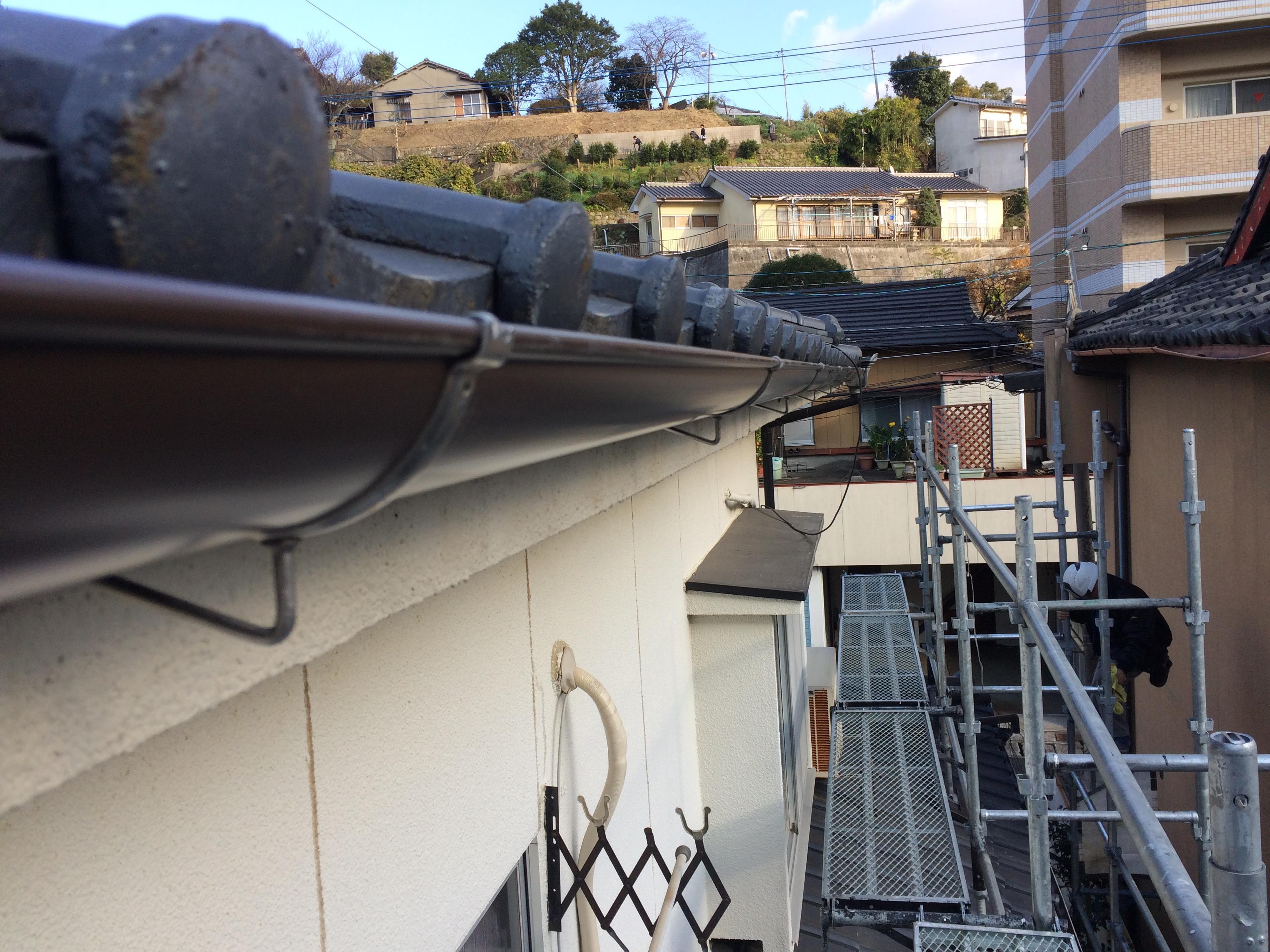台風で雨どいが壊れたとのことで、取り換えを行いました。屋根に勾配があり危険な作業になりますので足場をかけての作業となりました。