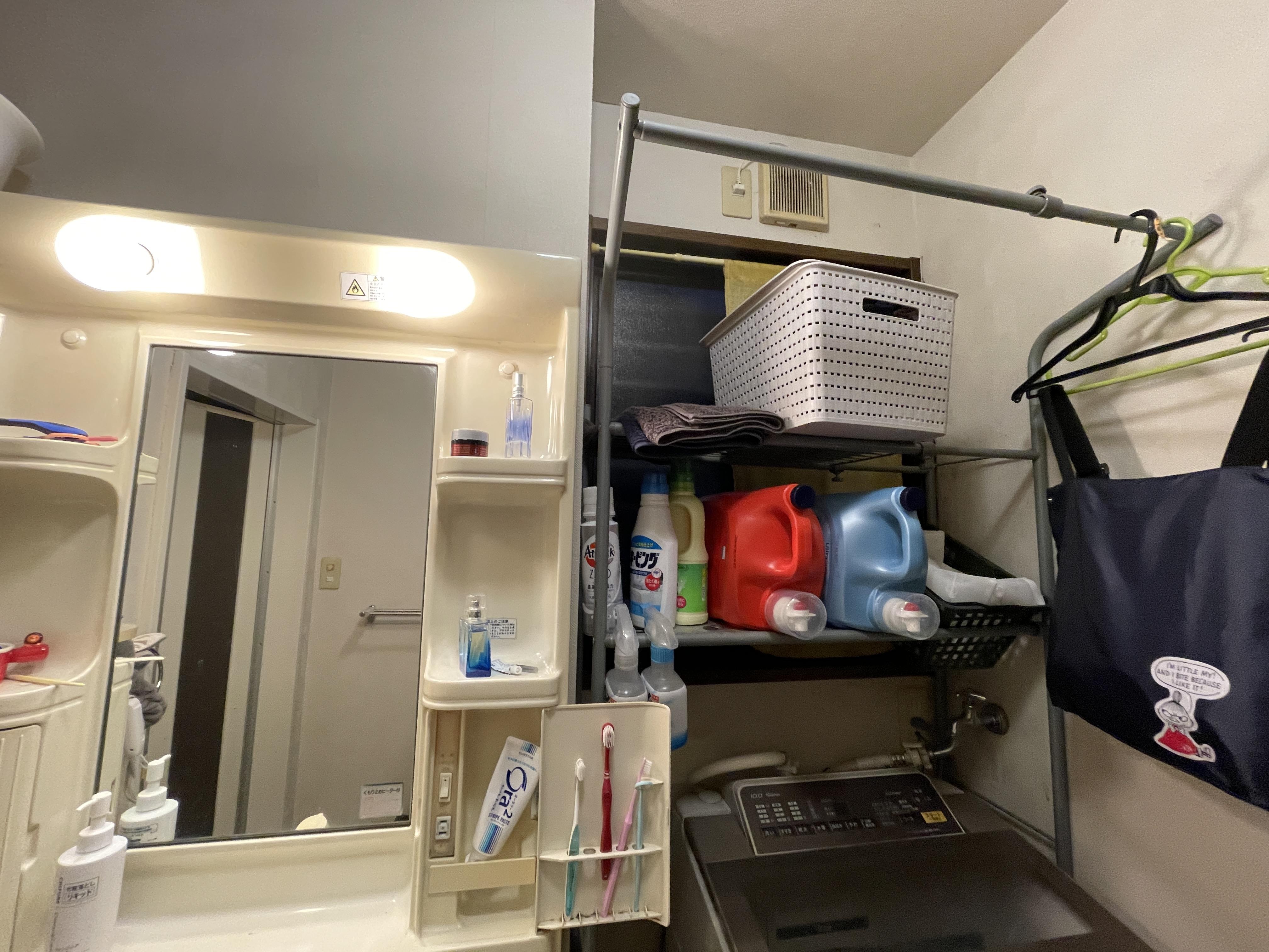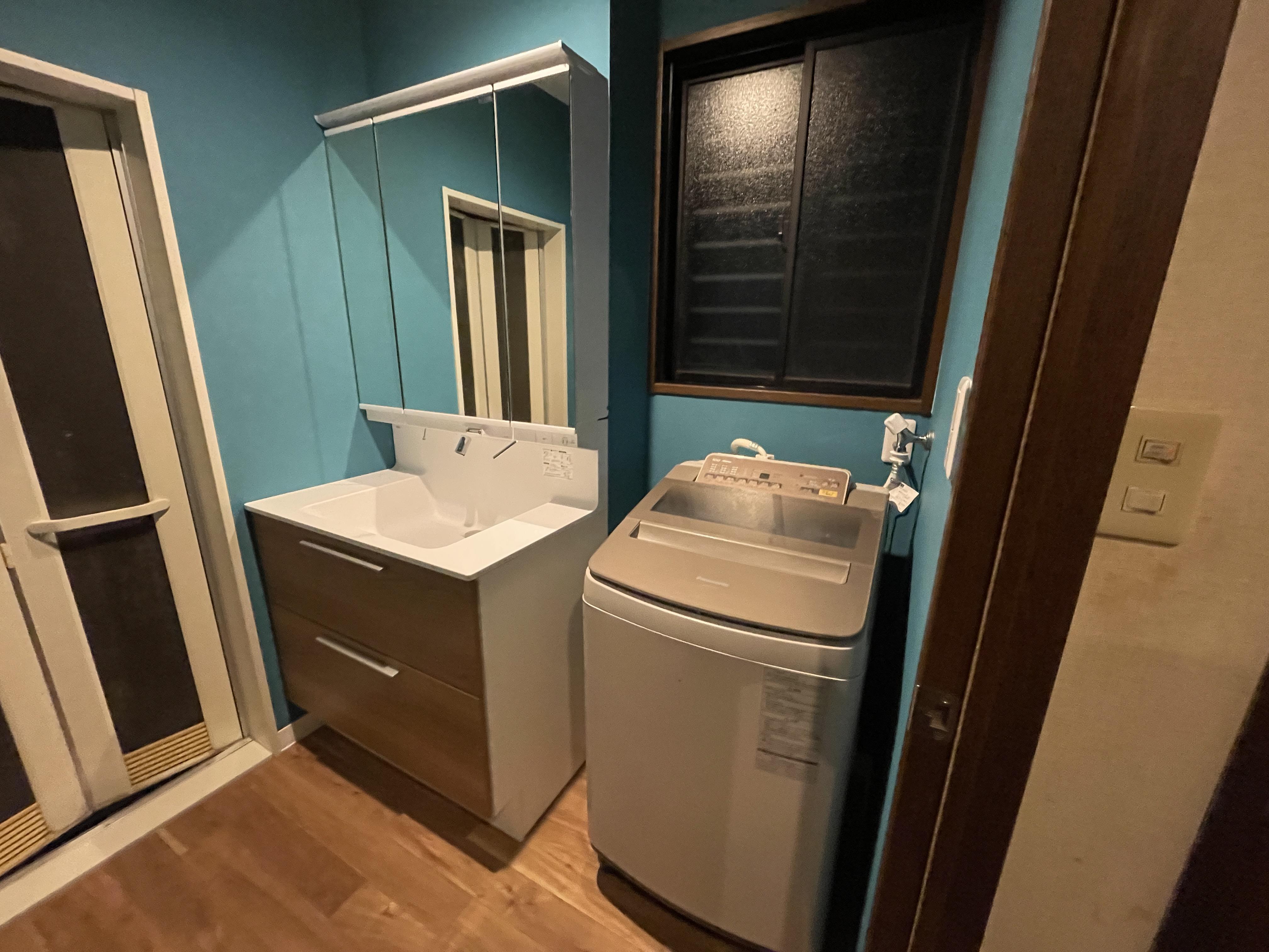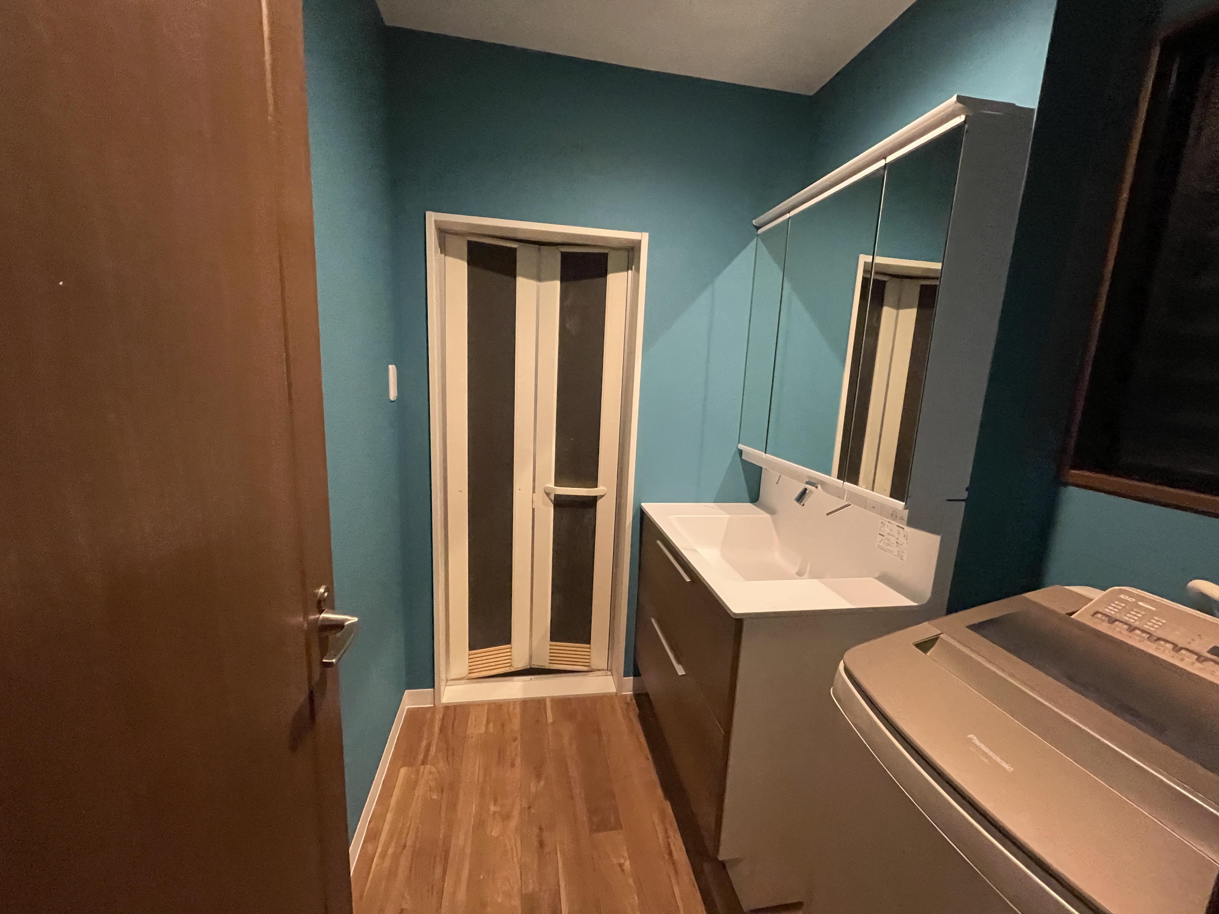 洗面化粧台の取替、壁天井クロス、床CFシートの張替え工事を行いました。 洗面化粧台をより大きくしたことで使い勝手が良くなり、 壁も明るい色を使用することで華やかになりました。 また、照明はダウンライトに変更し空間を広く見せております。