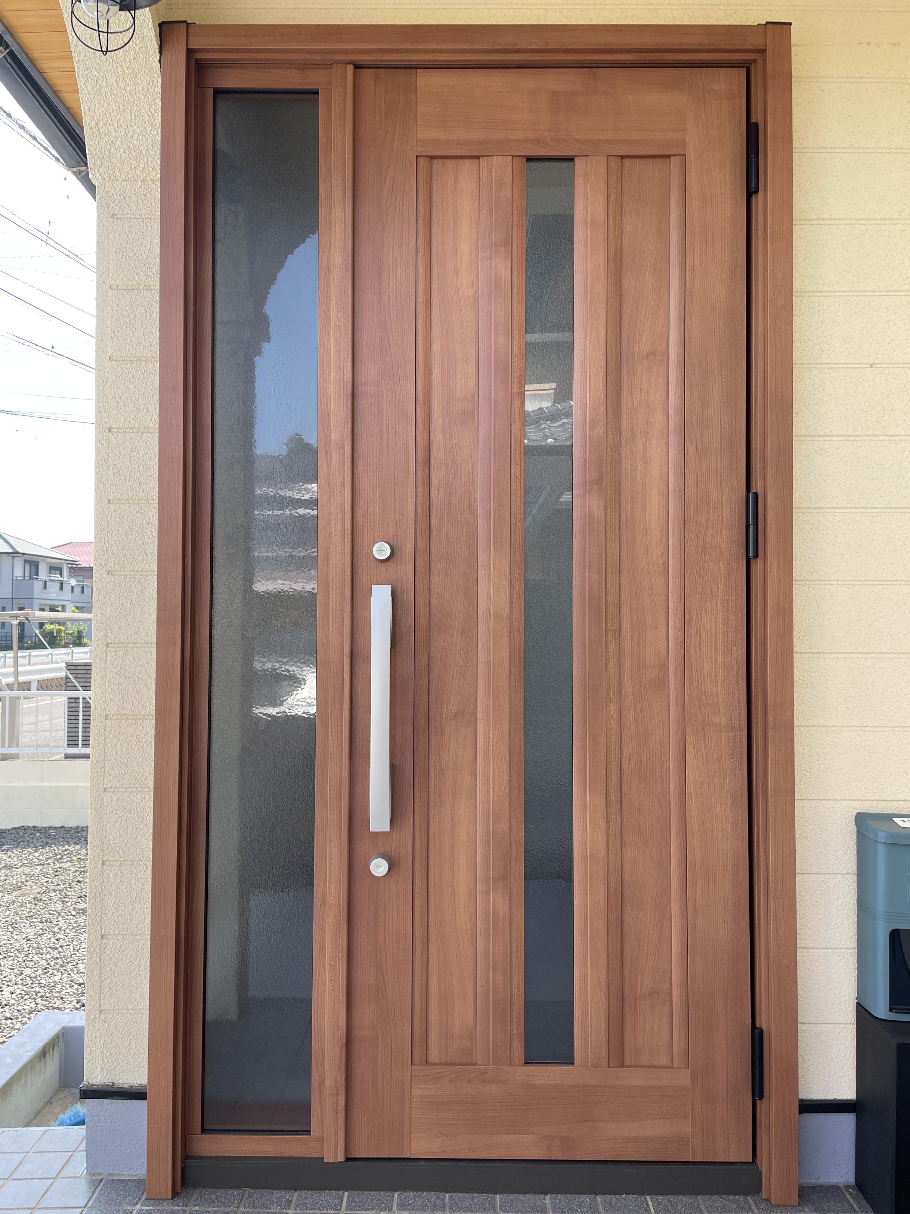 お玄関の取替工事をさせていただきました。 カバー工法のリシェントを使用し、工事は1日で完了! 欄間もなくなり広くなりました(^^♪