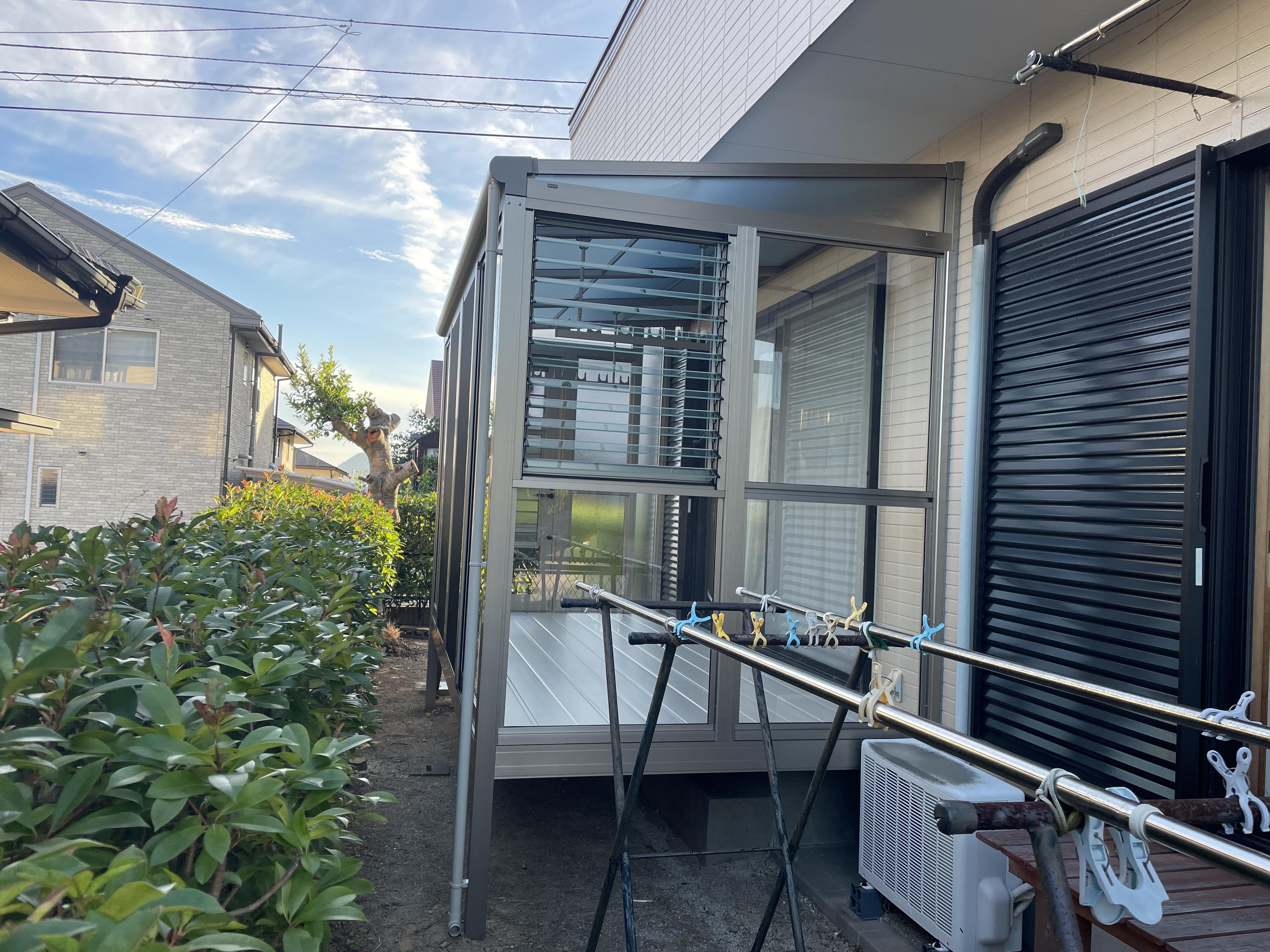 今回はサンルームの工事をさせていただきました。最近は夏がすごく熱いためか、サンルームを希望される方が多いです。 実際設置された方のお話を聞きますと、プライバシーが守られるし突然の雨の心配もなくなったとご好評をいただいていております。