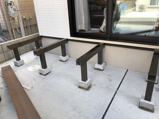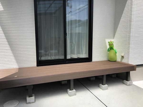 この度、弊社で施工していただきありがとうございます。ガレージにウッドデッキを取付ましたが結構勾配がきつく水平をとるのを特に注意しました。将来広げたいと思われた時に木を足して広げれるように横貼りを提案しました。樹脂木なのでお手入れもメンテナンスもラクラクなウッドデッキです。