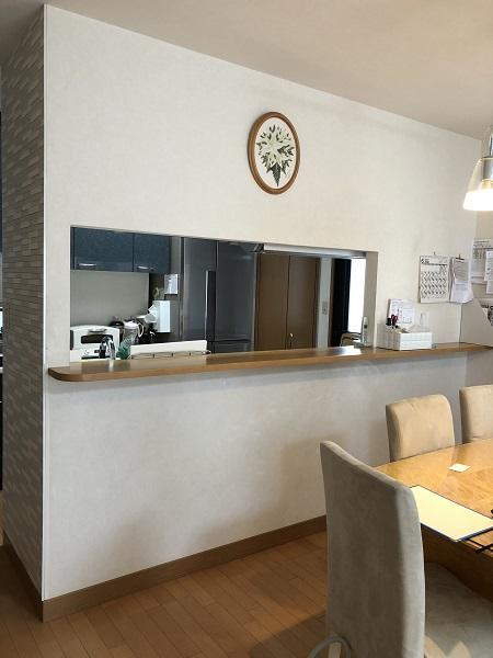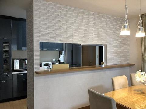 この度、弊社で施工していただきありがとうございます。エコカラットの1日工事ですが見切りなどの納まりを綺麗にする事が今回の工事のポイントでした。現状のクロスをそのままに傷つけないように工事を進めました。ダイニングの照明ともマッチングして最高の仕上がりになりました。