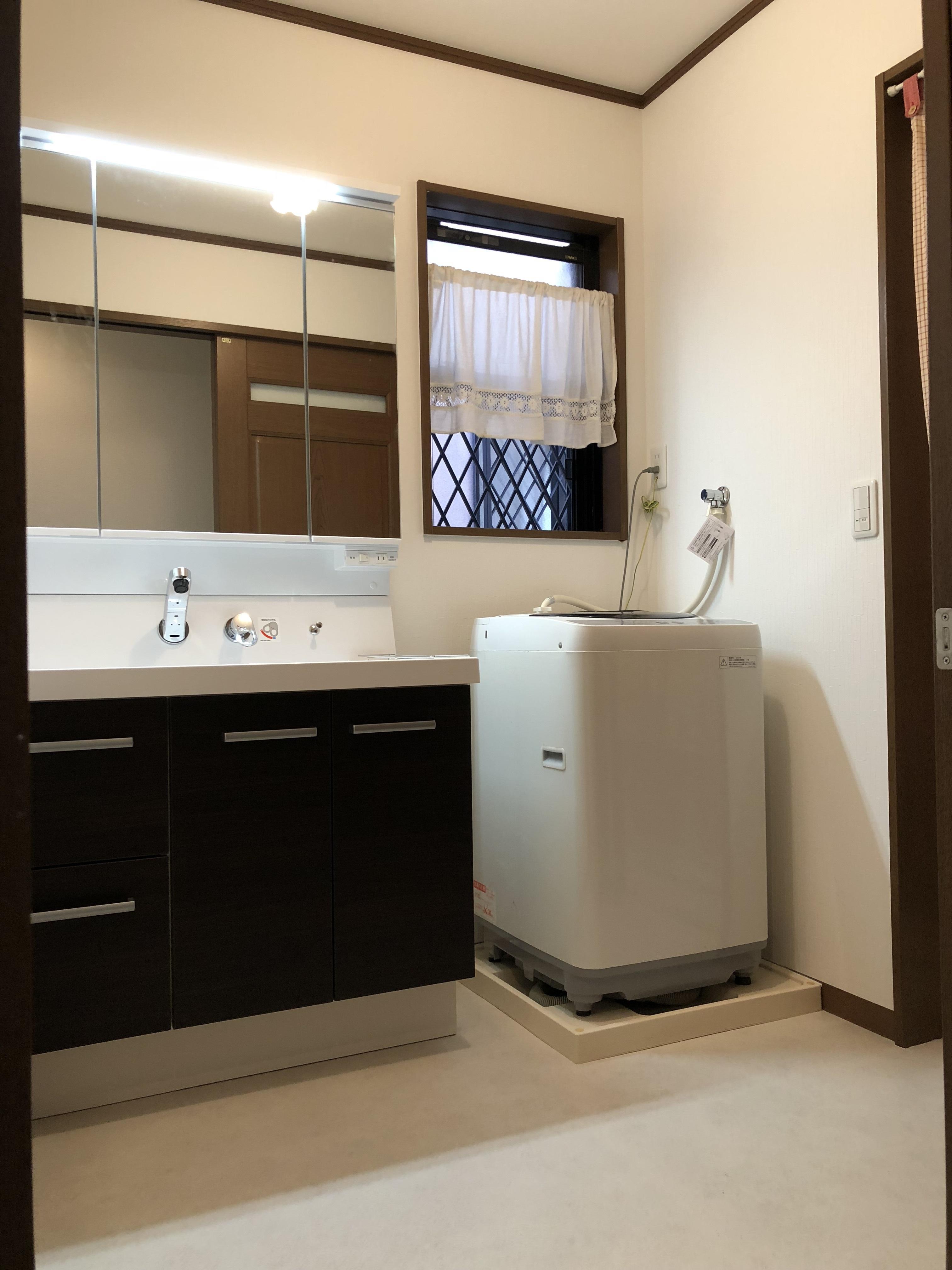 この度、弊社で施工していただきありがとうございます。T様の希望にあった洗面化粧台ピアラをご提案させて頂きました。三面鏡で収納力アップしLED照明で明るくなり洗面所にいる時間が長くなったそうです。すごく喜んで頂き私達もうれしく思います。洗濯水栓も交換させて頂き便利になりました。