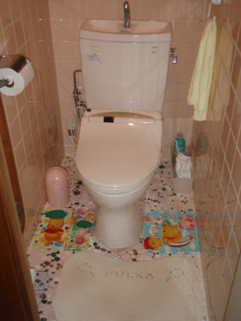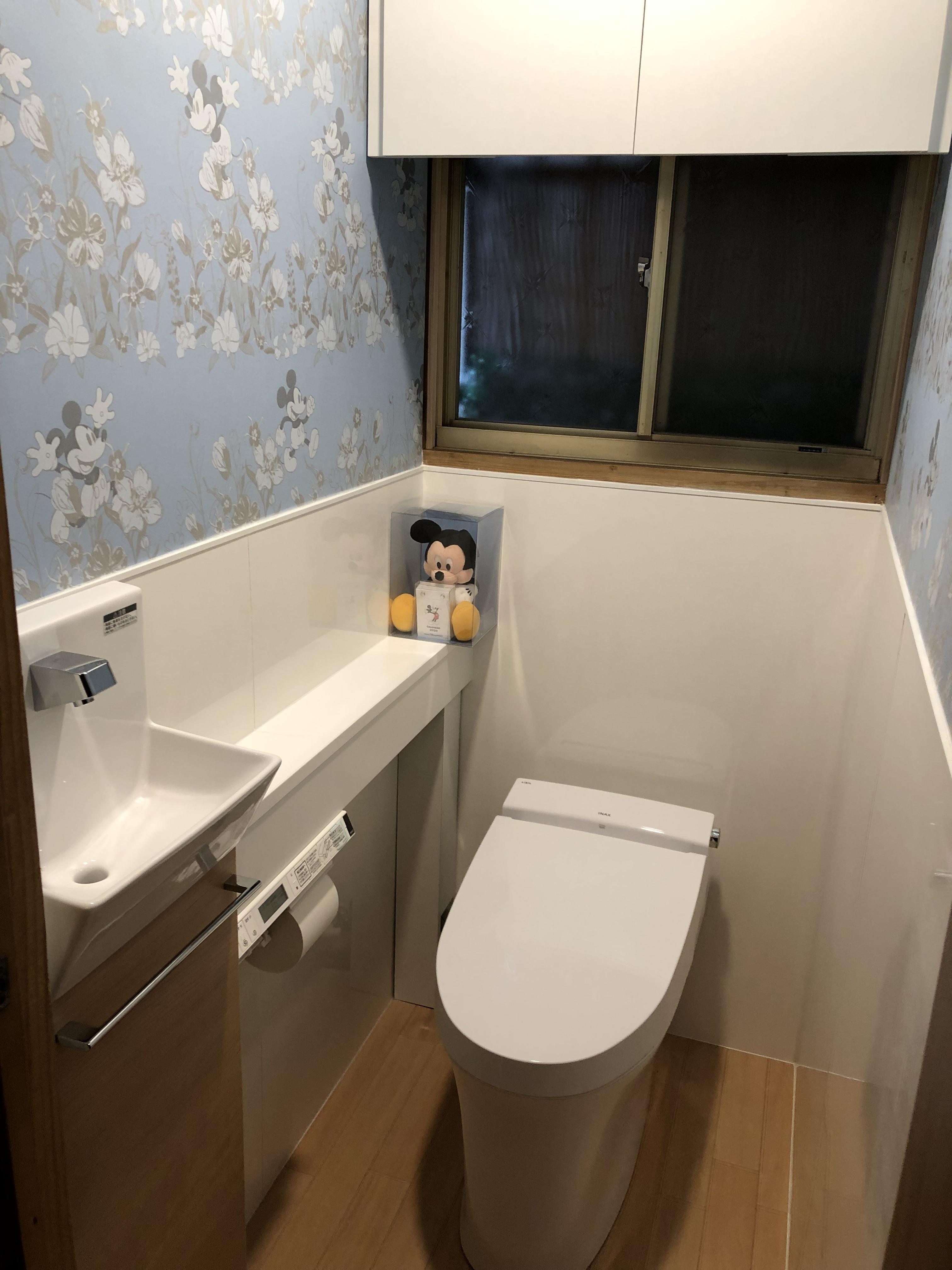 この度、弊社で施工していただきありがとうございます。ディズニー大好きなN様のためにルノンのディズニーのクロスをご提案させて頂きました。腰までのタイル部分にはお手入れしやすいキッチンパネルの上貼りしています。サティスSで手洗いも取付、スッキリ高機能なトイレの空間になりました。