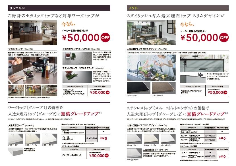 システムキッチン「リシェルSI」、「ノクト」にリフォームいただくと、ワークトップをワンランク上のタイプにお得にグレードアップできるんです。