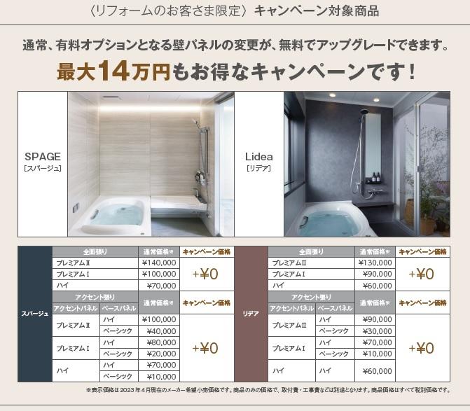 期間中、システムバス「スパージュ」または「リデア」にリフォームすると、通常は有料オプションとなる壁パネルのアップグレードが無料でできます。