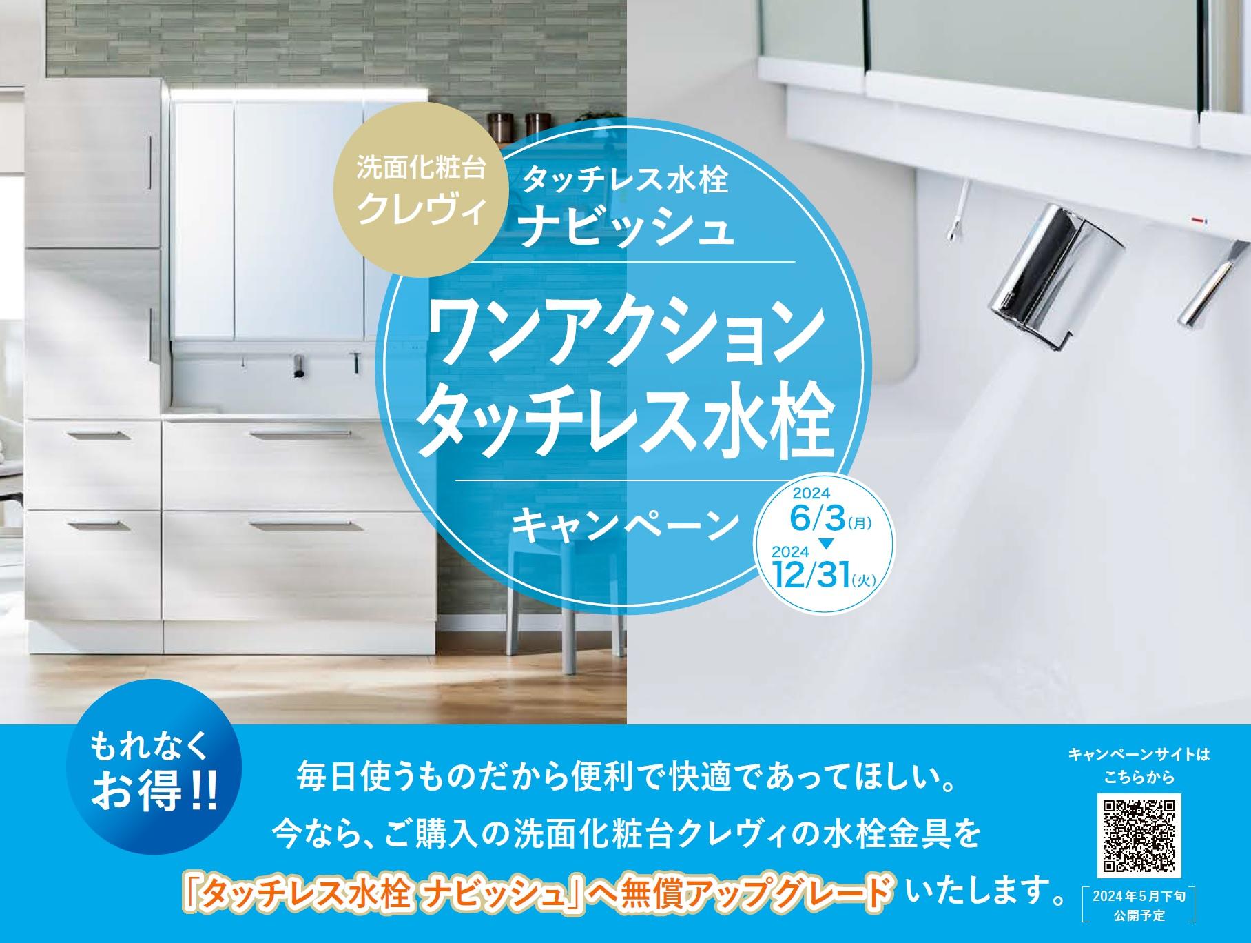 洗面化粧台クレヴィの水栓金具をタッチレス水栓 ナビッシュへ無償アップグレードできるキャンペーンです。