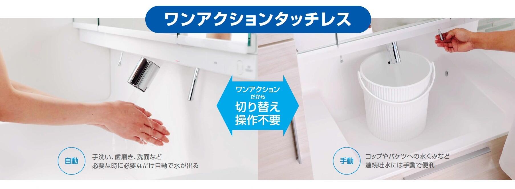 手動吐水と自動吐水の切り替え操作が不要なLIXIL のタッチレス水栓です。