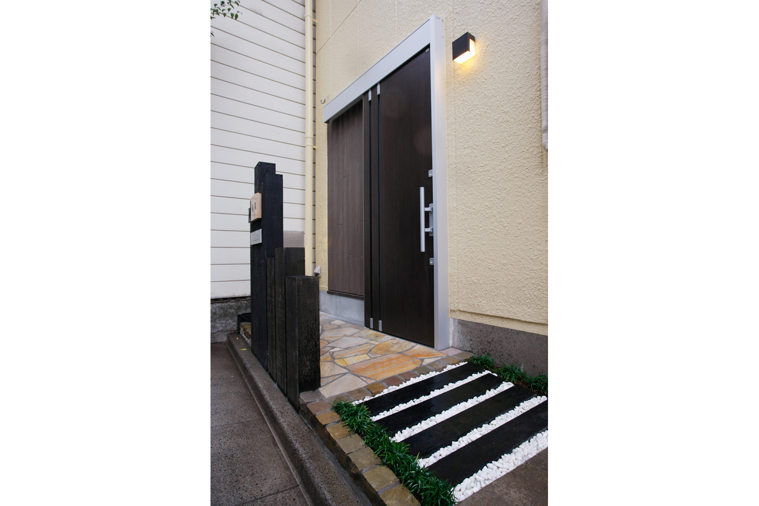アプローチは、限られたスペースでしたが、玄関ドア前がすぐ道路でしたので、防犯性や安全性を考慮して、枕木で緩やかに空間を仕切るようにしました。