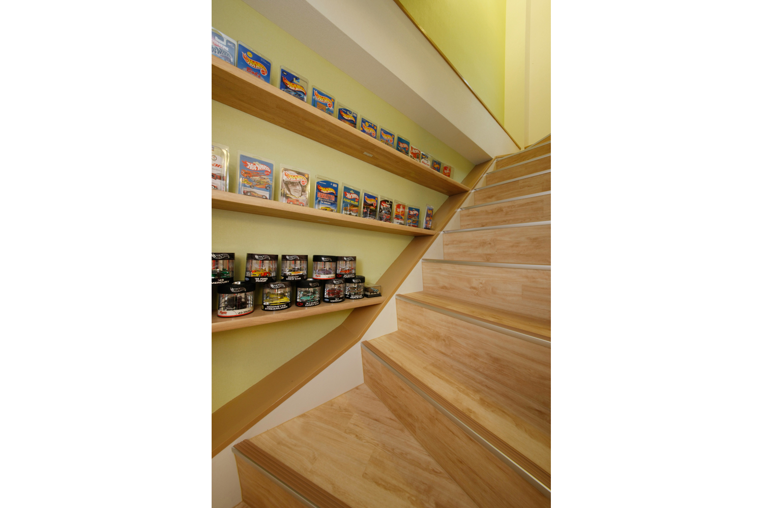 ご主人のヴィンテージカーコレクションがダンボールに数箱ぎっしり詰まっておりました。こちらは、3階へあがる階段脇のスペースを有効活用し棚を造作。