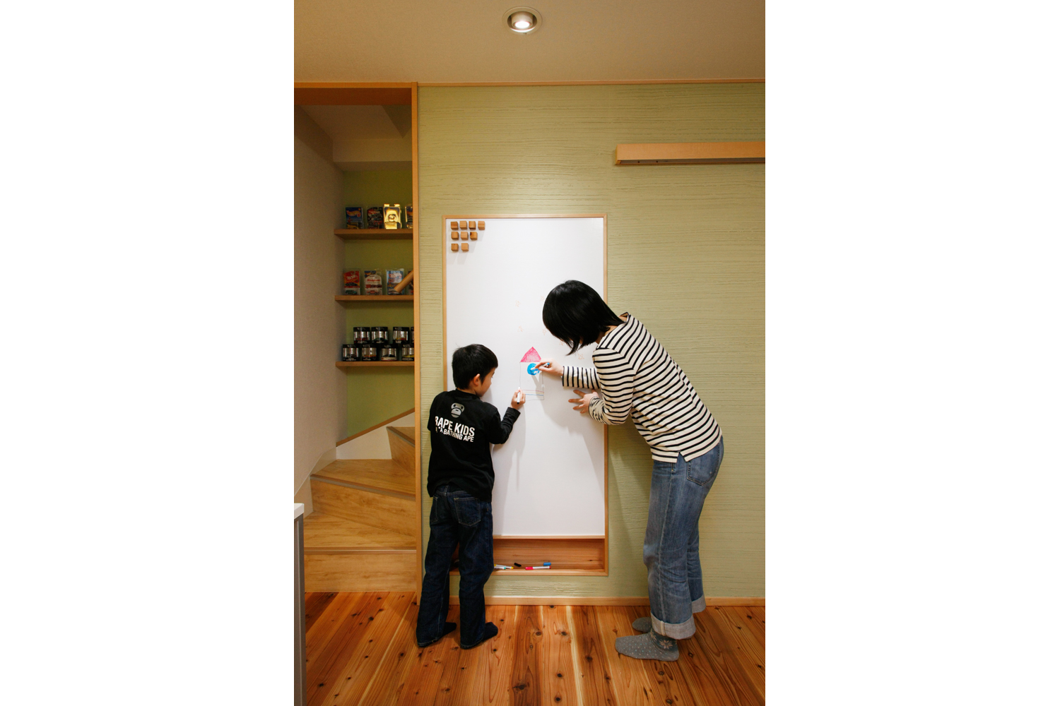 お絵かきが大好きなお子様が、いつでも自由にダイナミックに描けるホワイトボードをリビングに設置。