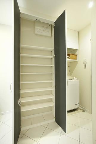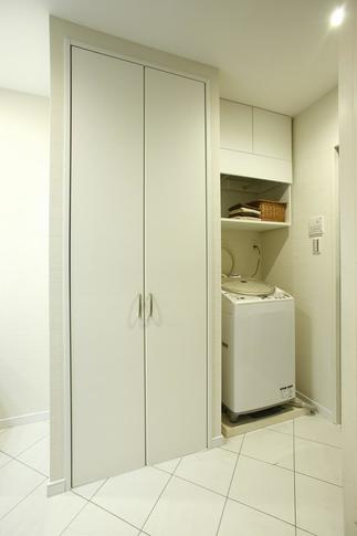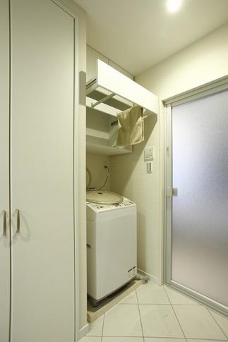 洗濯機上部には、LIXILヴィータスの収納を設置。スライド式のランドリーバーを引き出せば、部屋干し空間に早変わりします。
