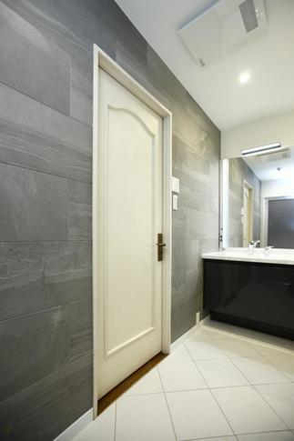 本物の石のような模様のエコカラットを壁一面に。調湿効果とデザイン性を両立しました。既存のドアとうまくコーディネートされ、クラシカルでありながらモダンな空間になりました。