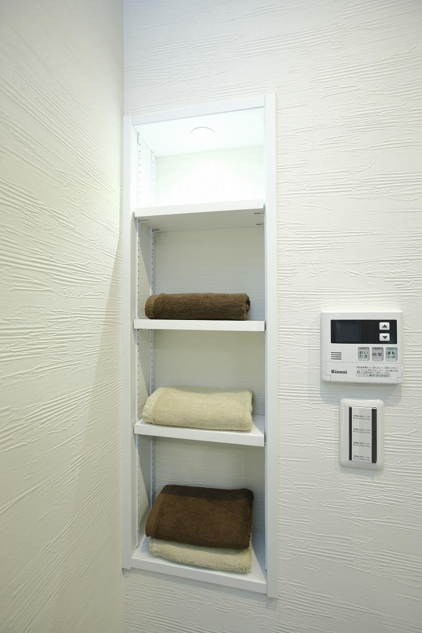 タオルを置いたり小物を飾れるスペースがうれしい埋め込み型のニッチ棚を造作しました。