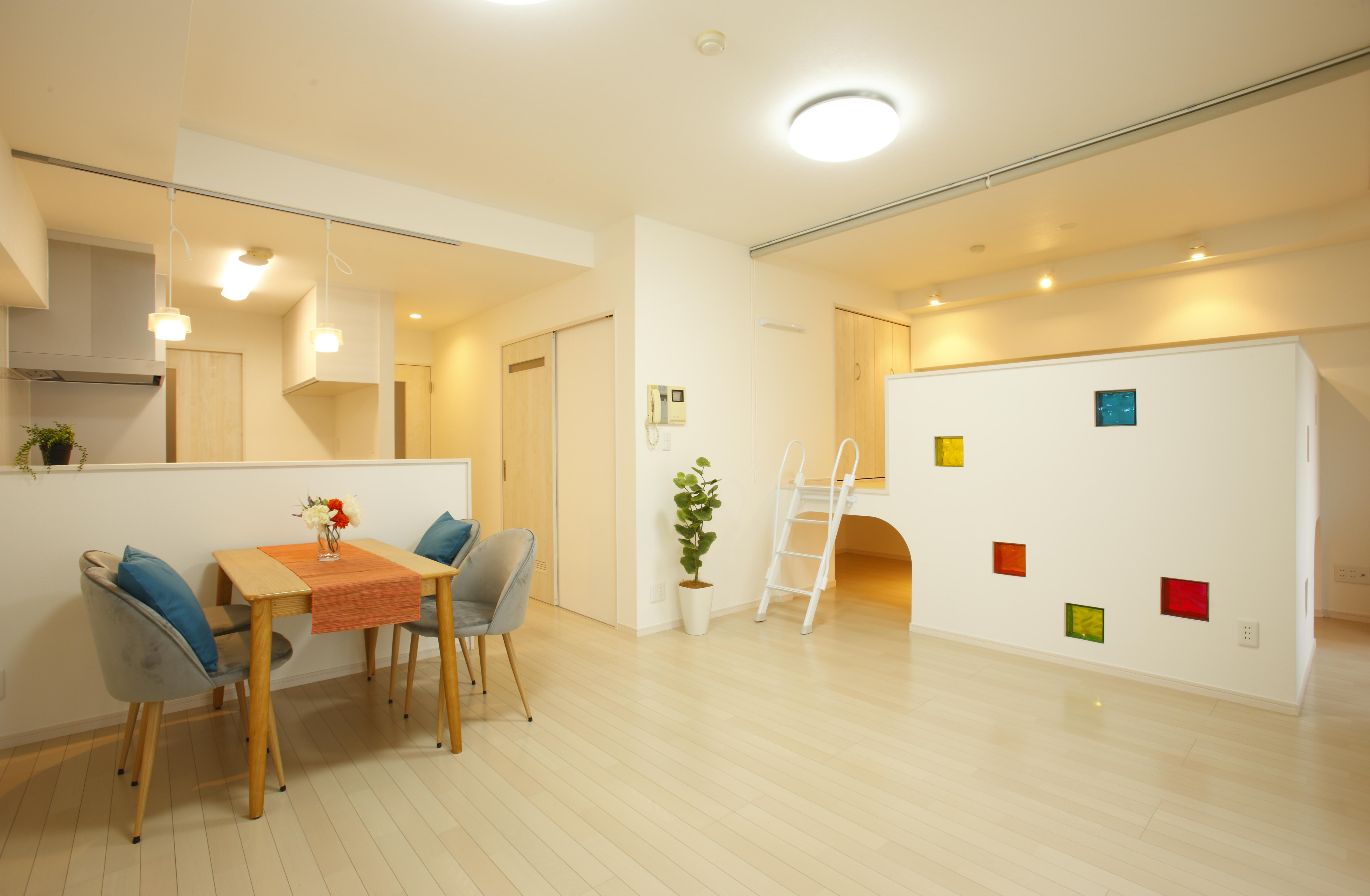 E様は小さなお子様2人を抱える子育て世代。3人目のご予定もあり、これからが本番となる育児に備え、中古マンションを購入されました。目指したのは、家族みんなが楽しく快適に暮らせる家。朝の混雑を解消する2つのトイレ、見た目も楽しく使い勝手の良いロフト畳コーナー、お子様の身支度に十分なスペースの洗面脱衣室…。今はもちろん、お子様が成長してライフスタイルが変わっても快適に過ごせるよう将来まで見据えています。