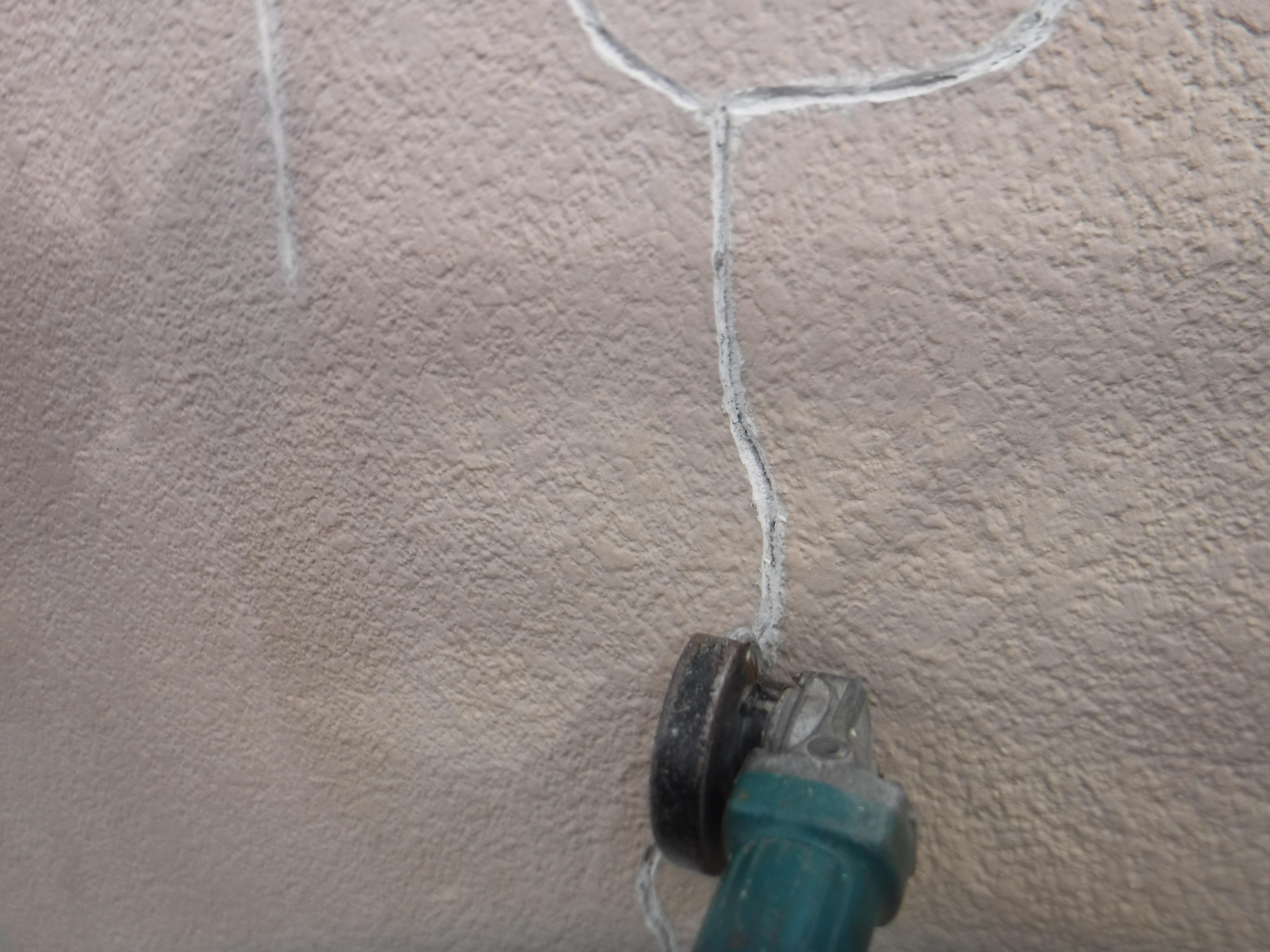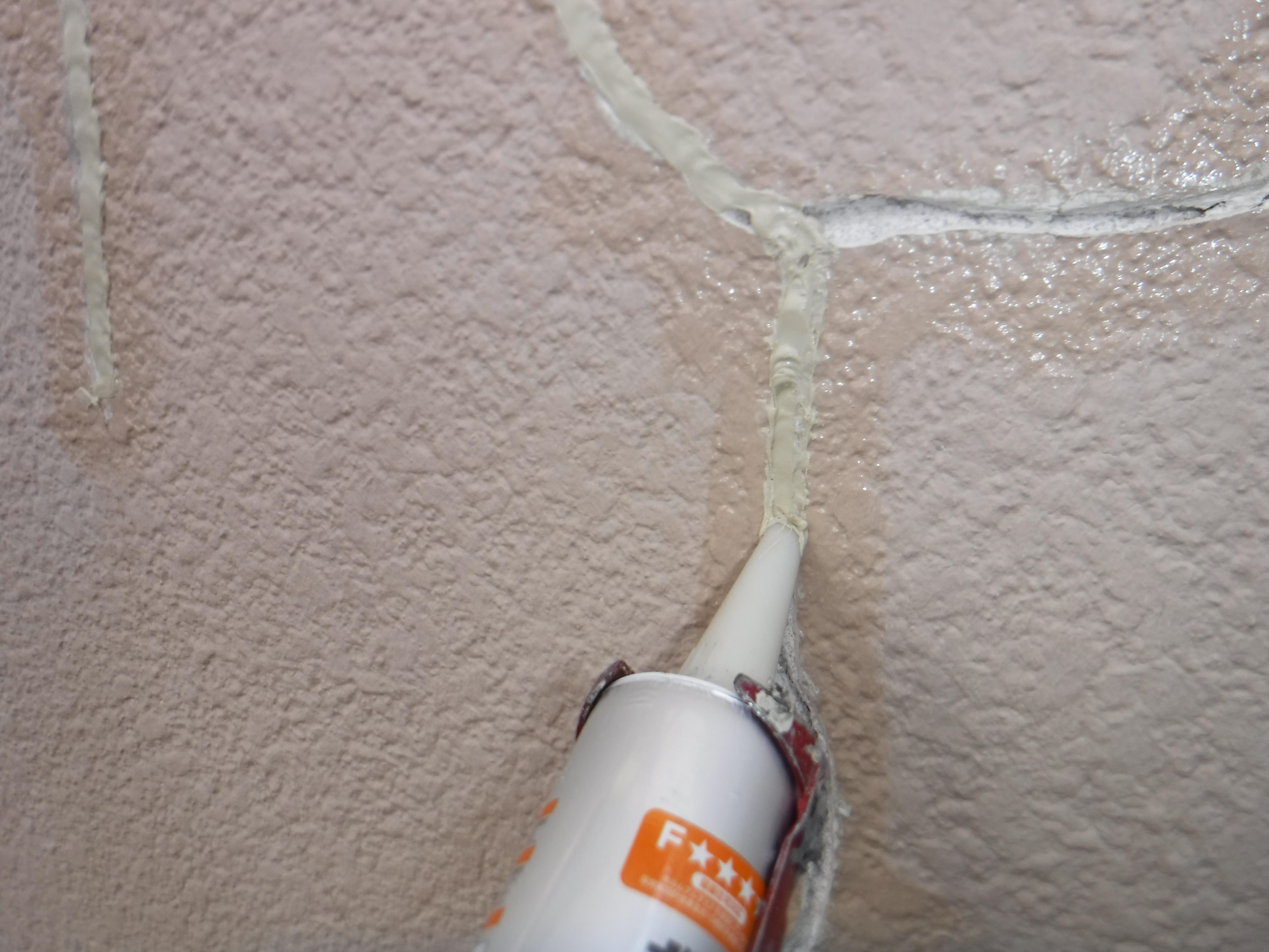 外壁ひび割れ部分をユウカットシール工法で修理。 ひび割れ部分にそのまま外壁塗装をしてしまうと同じところにひび割れが発生してしまう。 ひび割れを放置すると、壁より水漏れが発生して建物がダメージを受けてしまう。