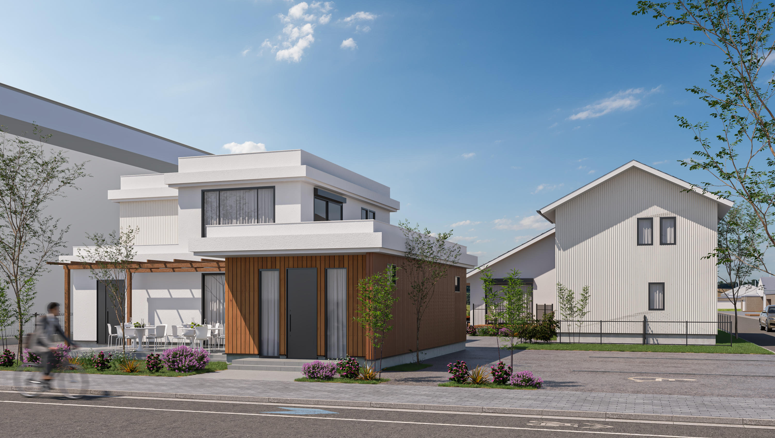 右の三角屋根の建物がモデルハウスとなっております。![]()